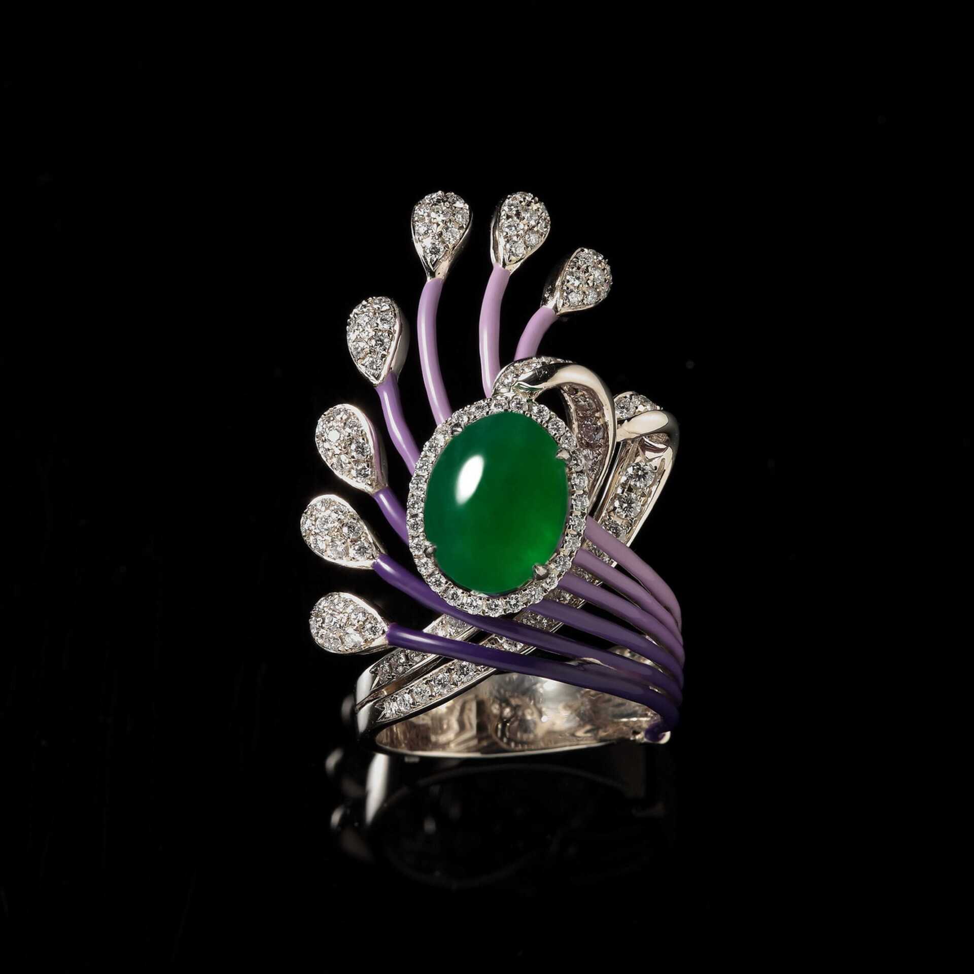 翡翠因此雖有著千萬年歲月累積的沈靜,卻展現了活潑的生命力。同一件翡翠,隨著欣賞者的心情、當時的光線和環境,它會有不同的表情和意境。所以,以翡翠為主材設計作品,設計者必須對翡翠這樣的特質有一定的了解,知道怎麼安排它,讓它展現這樣的魅力,才能設計出精采的作品。