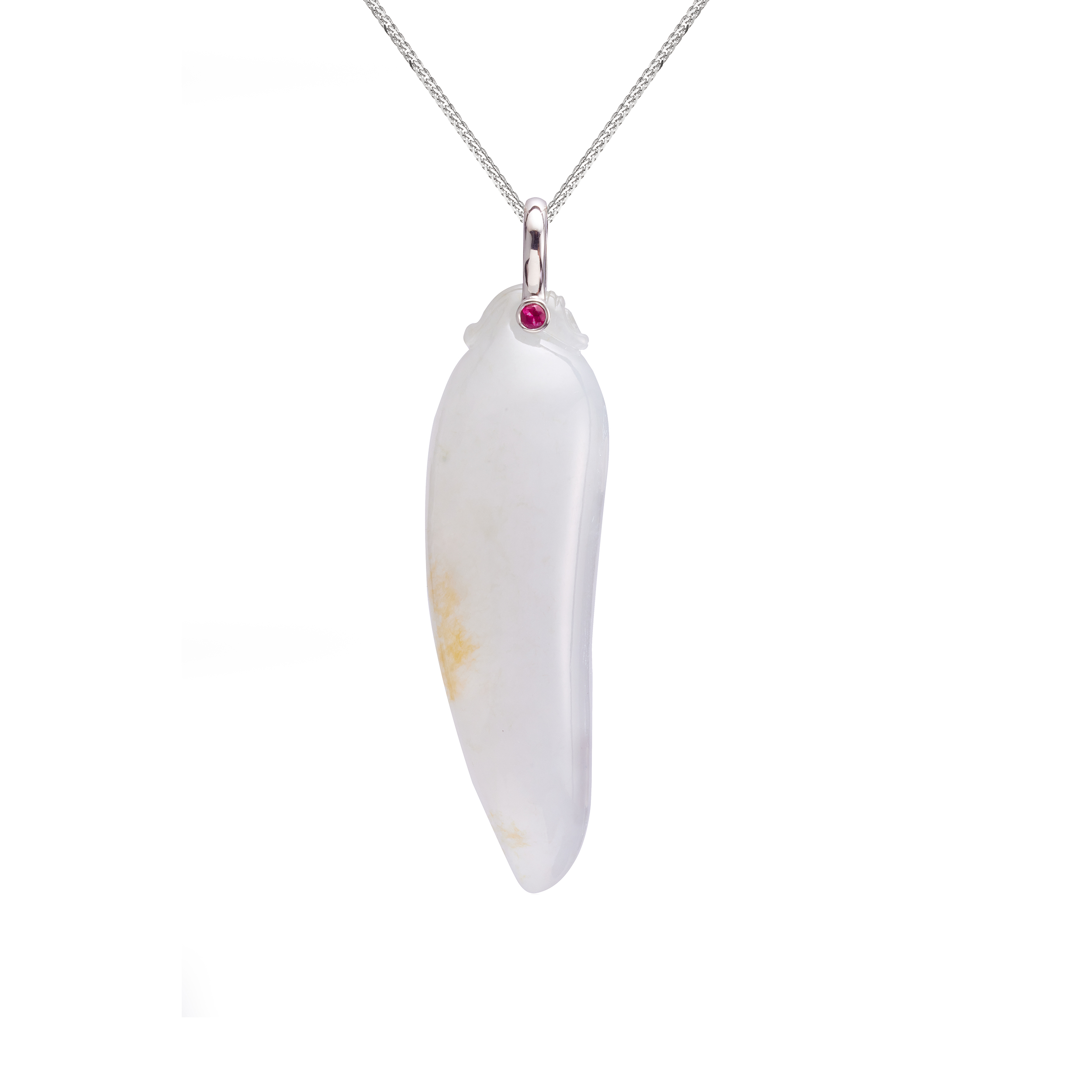 溫潤的翡翠,以「辣椒」為題,經過巧思設計與細膩手藝,琢磨為一系列不同色彩情調的墜飾,既能展現翠玉的美感,它的內蘊,也含藏著種種祝福的心意。