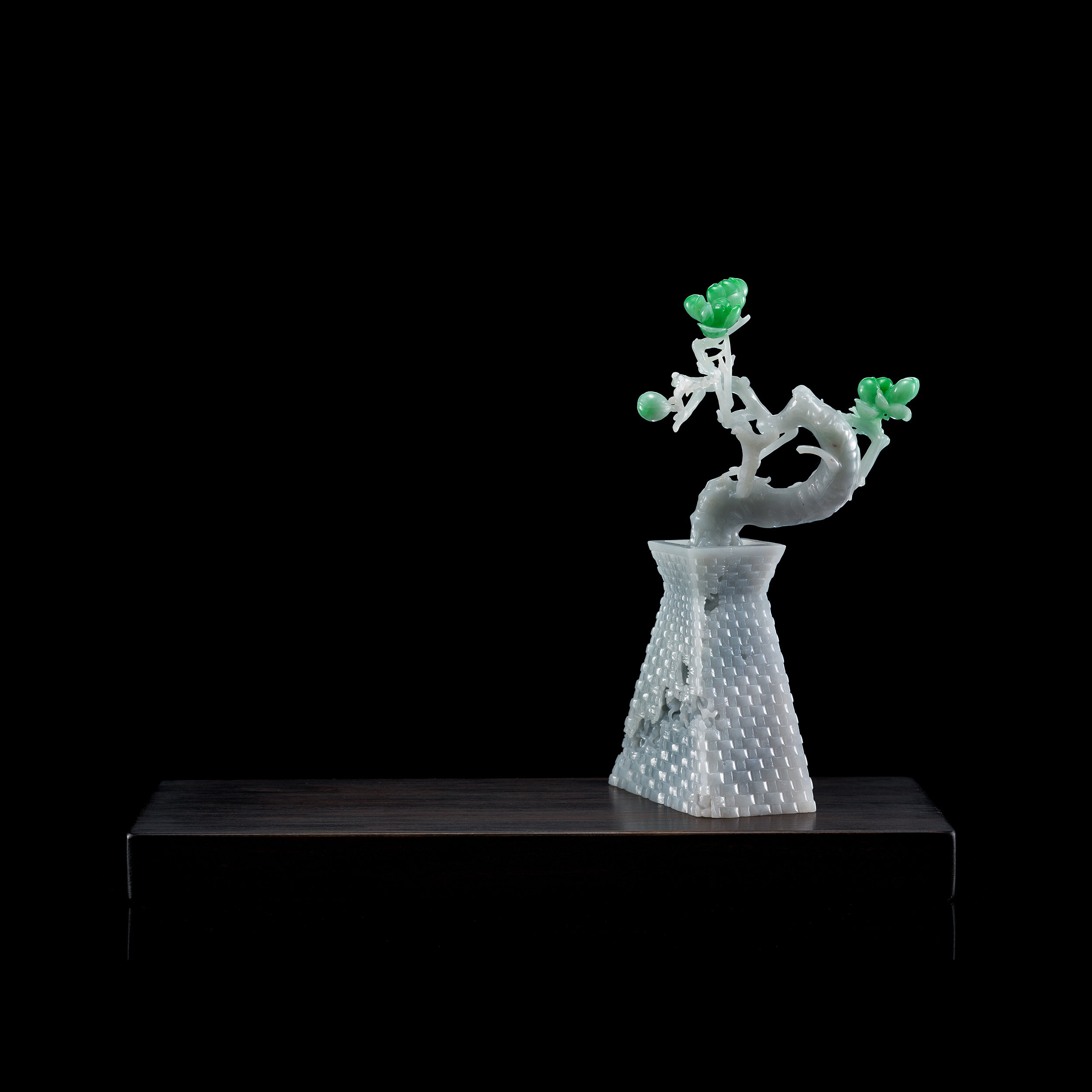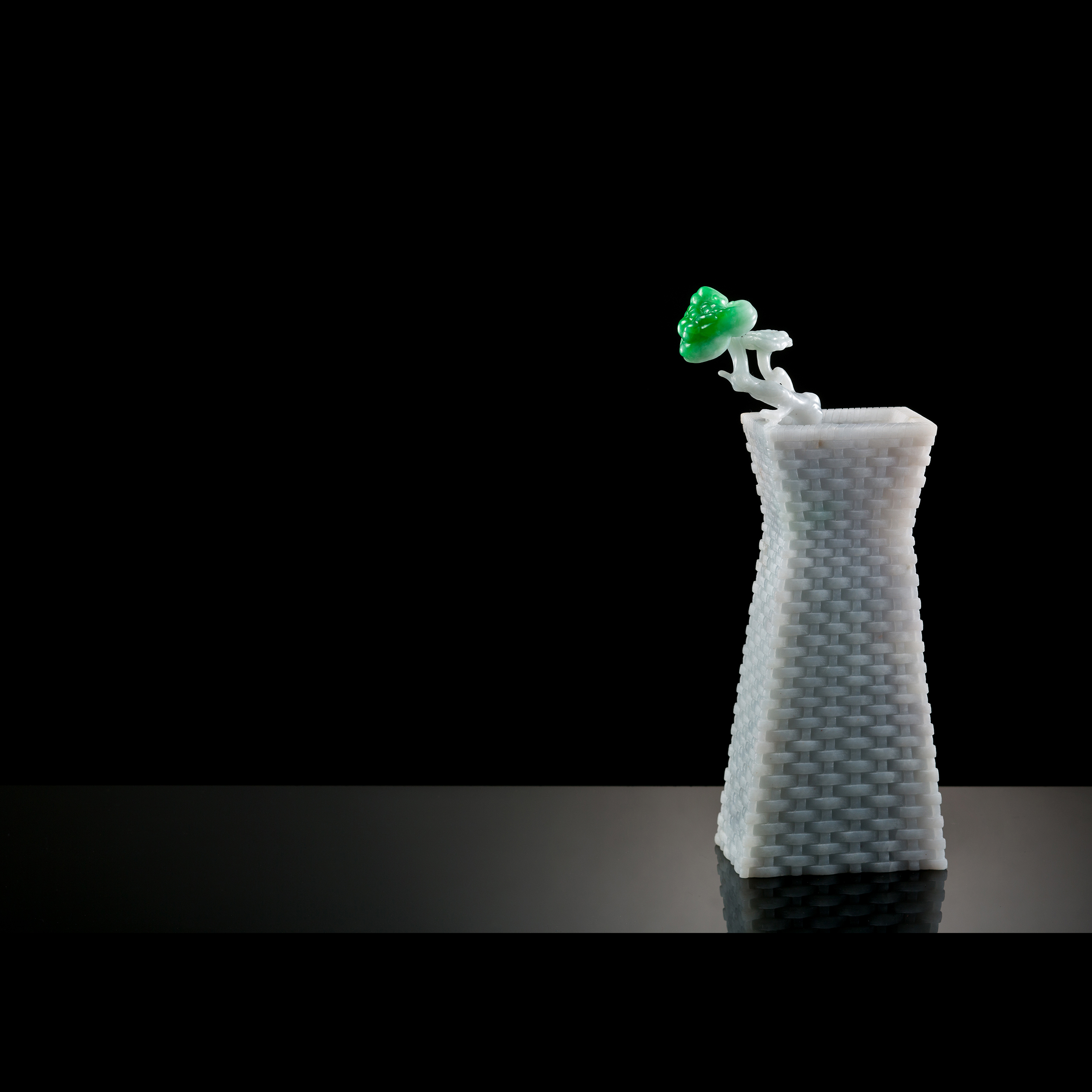 翡翠玉材也能表現出彷彿竹編感的柔韌度。這幾件花器的共同特色,就是器面的紋路是以重複的、交錯的、對稱的方式來表現,仿擬出凹凸有致的編織感,既有現代的創意,亦同時兼備著非常素雅的美感氣質。