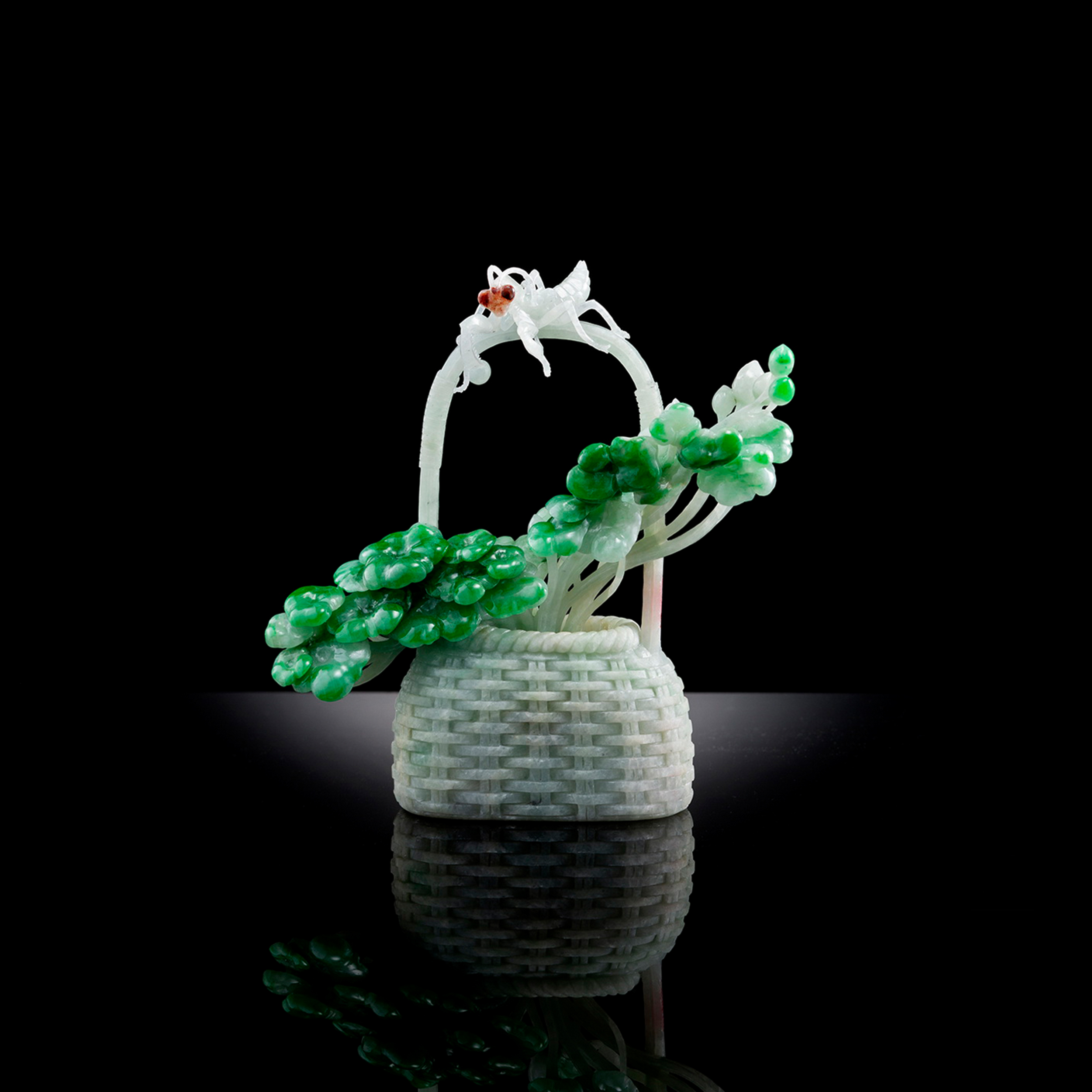 綜觀翡翠工藝表現,每每令人讚嘆不已的特色之一,即是以堅硬的玉材來詮釋柔軟或柔韌之物,例如,以翡翠來表現柔軟的花葉或蟲子,或是以翡翠來演繹柔韌且帶有編織紋路的竹簍或竹籃。