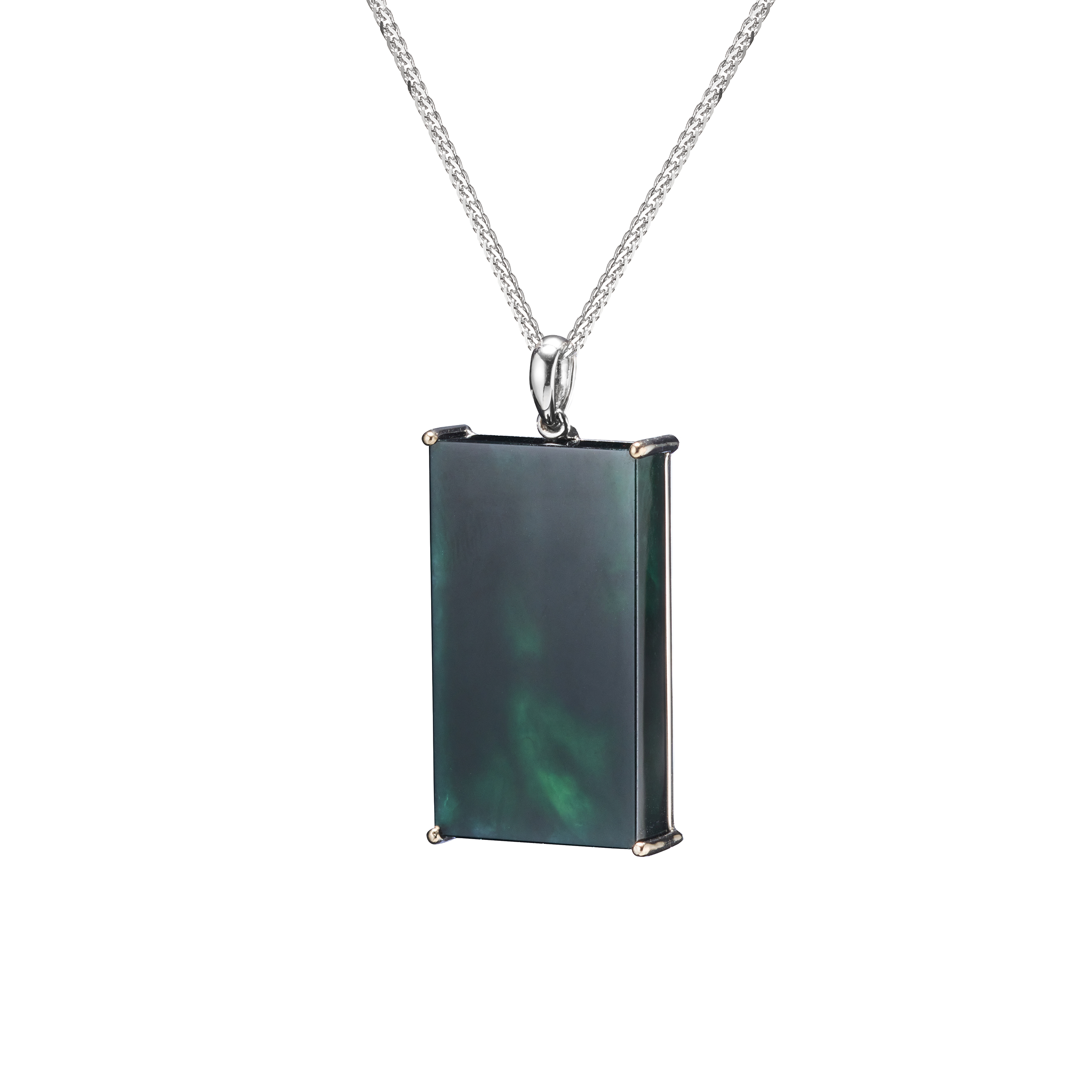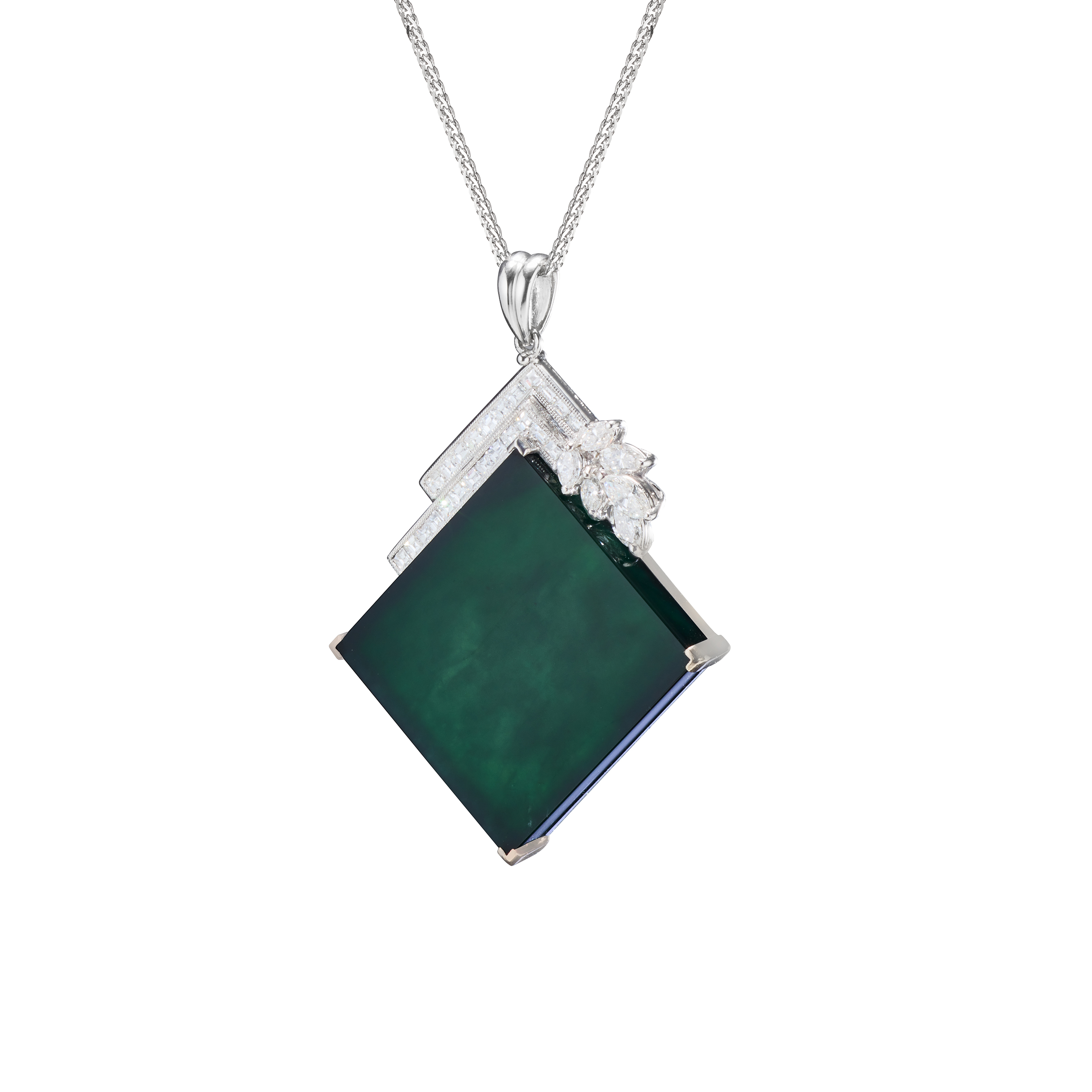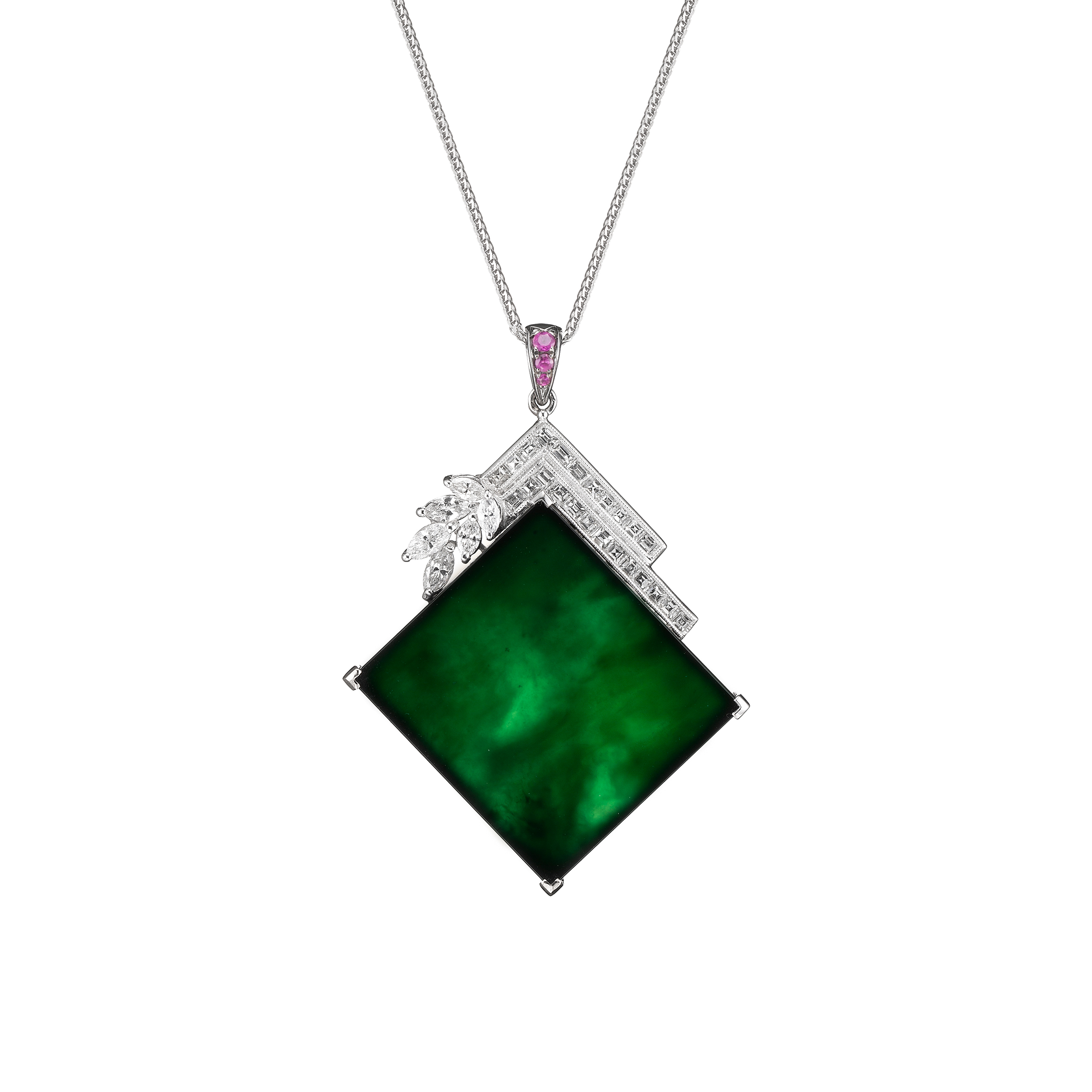 墨翠質地,溫潤、有光澤,玉色看似暗黑幽邃,然而,在光線的照射下,卻可發現其中的翠色變化,氤氳的濃綠色,映現出深不可測的玉光翠影。獨特的玉色,透過幾何切割的方式,呈顯為方形、長形或菱形的主石,簡約的設計美學,搭配璀璨的鑽飾,演繹純粹且俐落的個性品味。