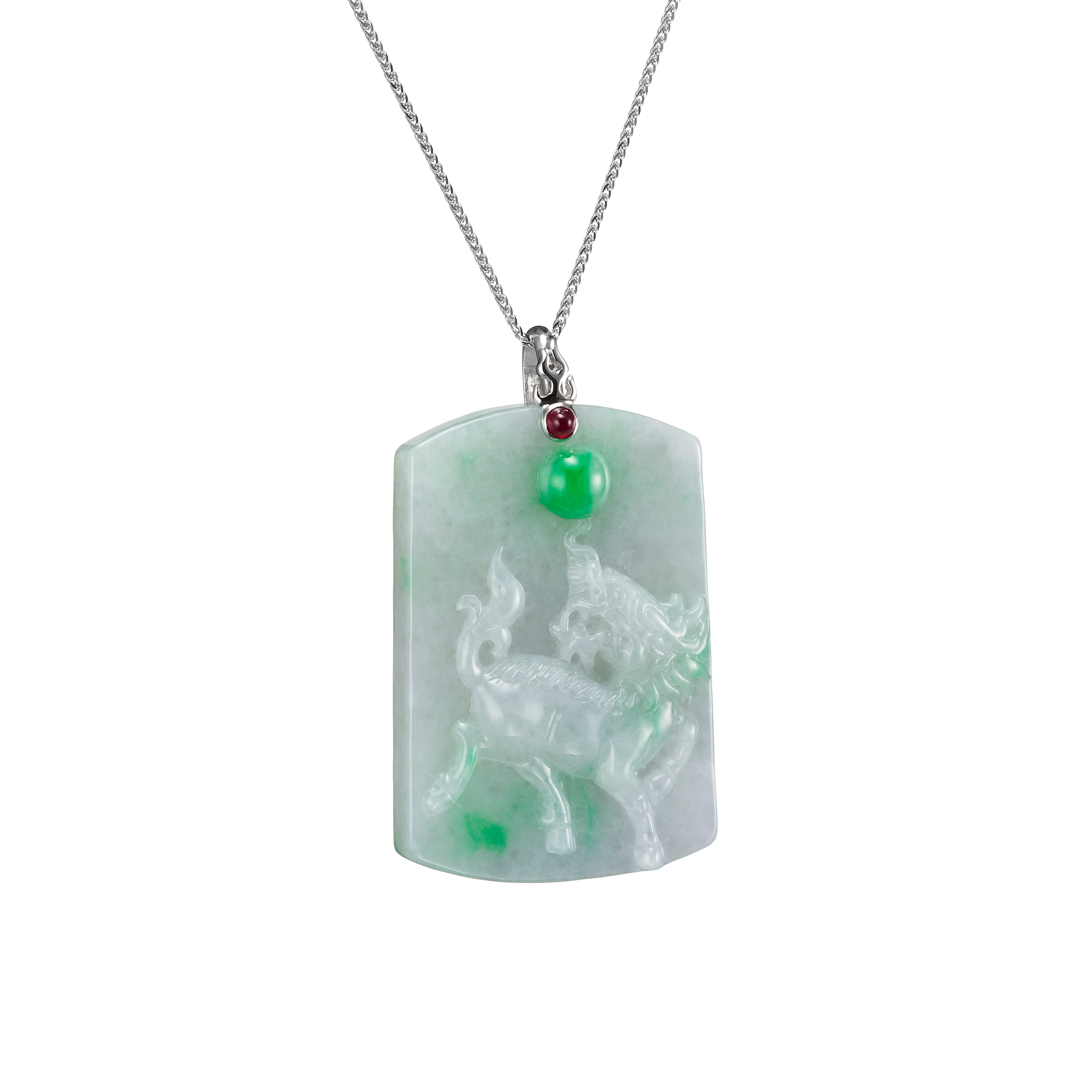 嬌貴的翡翠玉材,引「麒麟」入題,玉色華美喜氣,刻工手藝細膩,姿態栩栩靈動,吉祥圖紋,傳述著盛世的福慶。