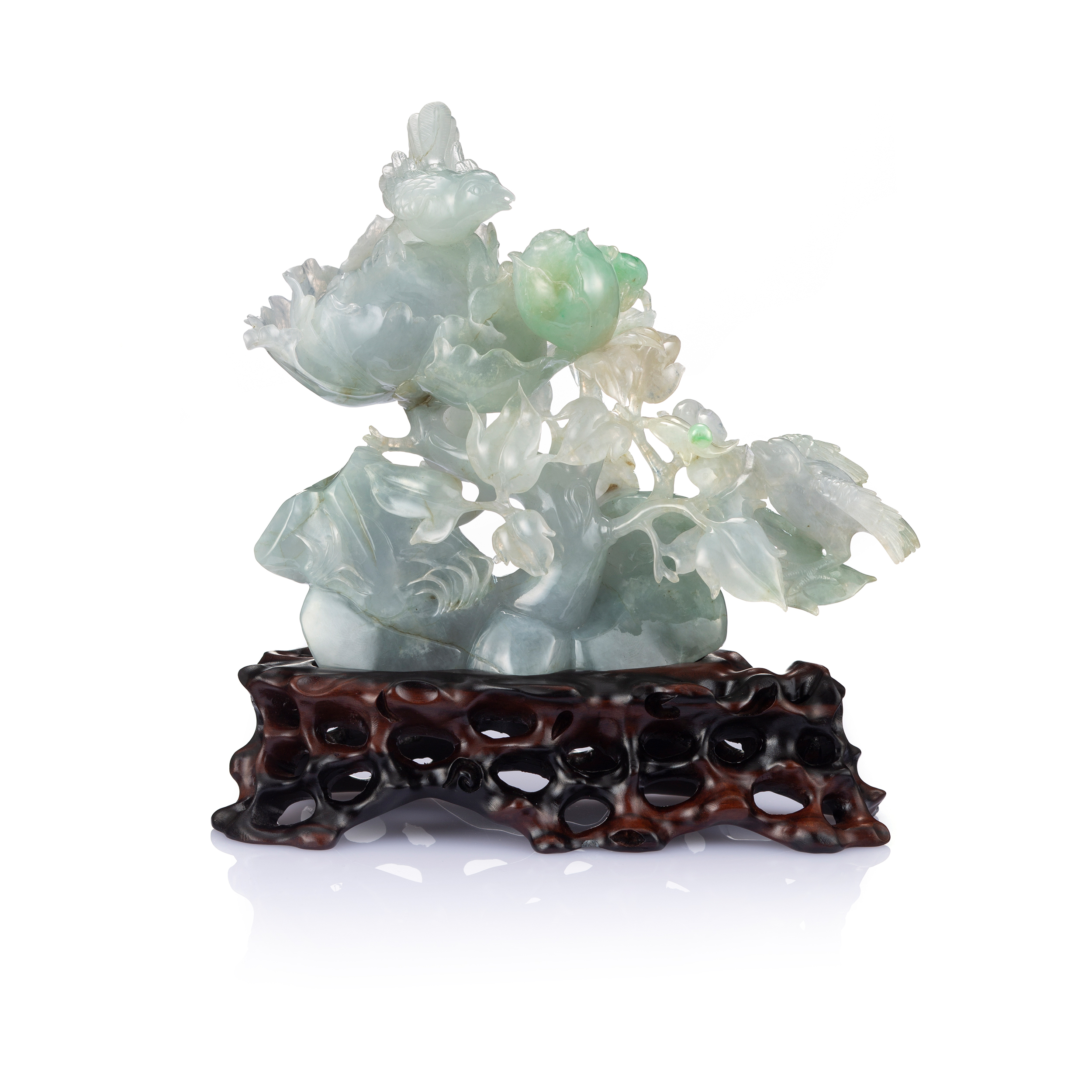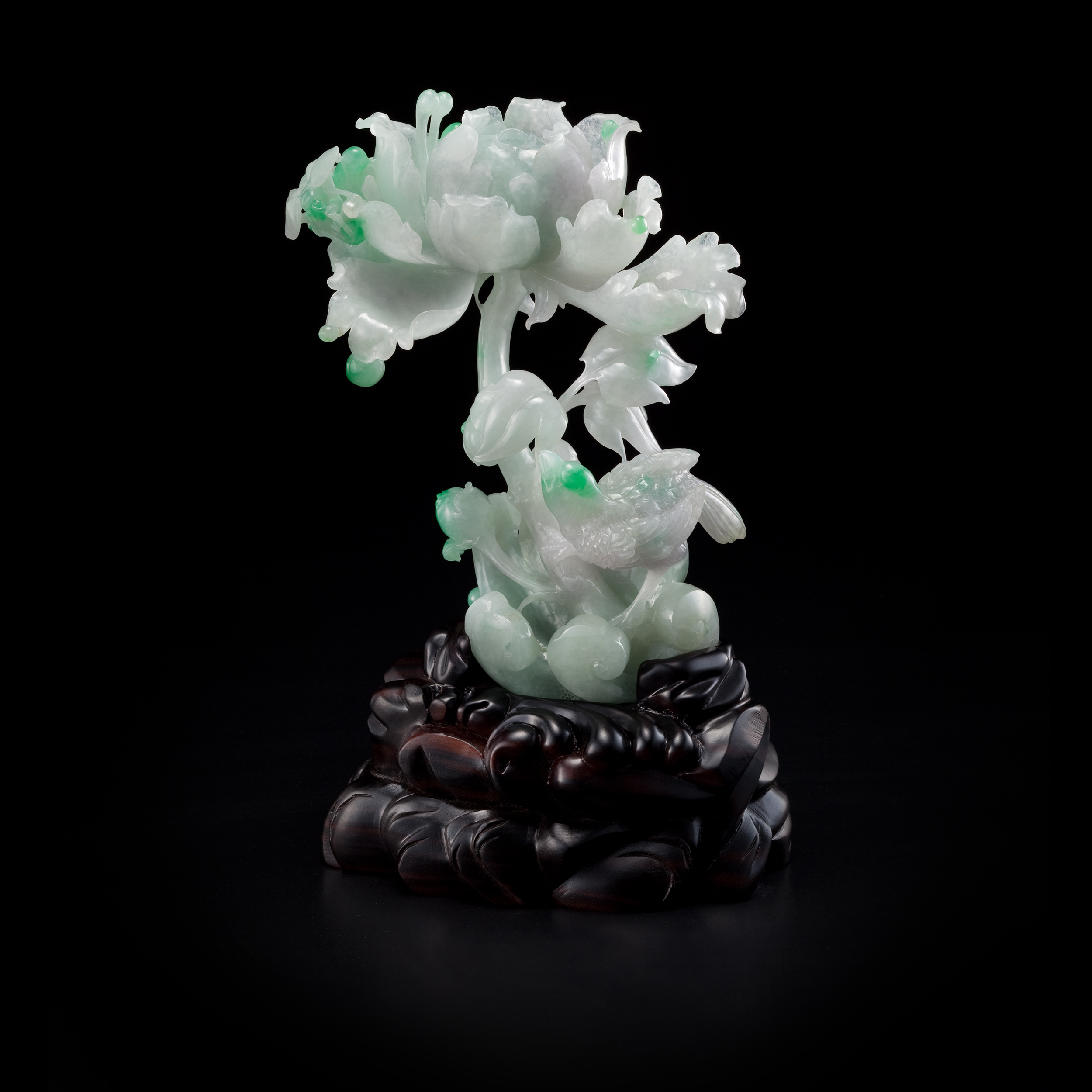翡翠質地,溫潤且堅韌,氣韻脫俗,雕作牡丹主題,除了傳達富貴佳旨,亦可同時欣賞細膩的玉作技藝,作玉者結合圓雕或透雕或浮雕等技法,精湛的構圖與琢磨的手藝,將花葉的飽滿、垂滴的露珠、蟲或鳥或獸的動態等,表現得栩栩如生,無論珠寶或雕件,既透散著溫文儒雅的柔情靈性,也綻放了永恆的繁盛與貴氣。