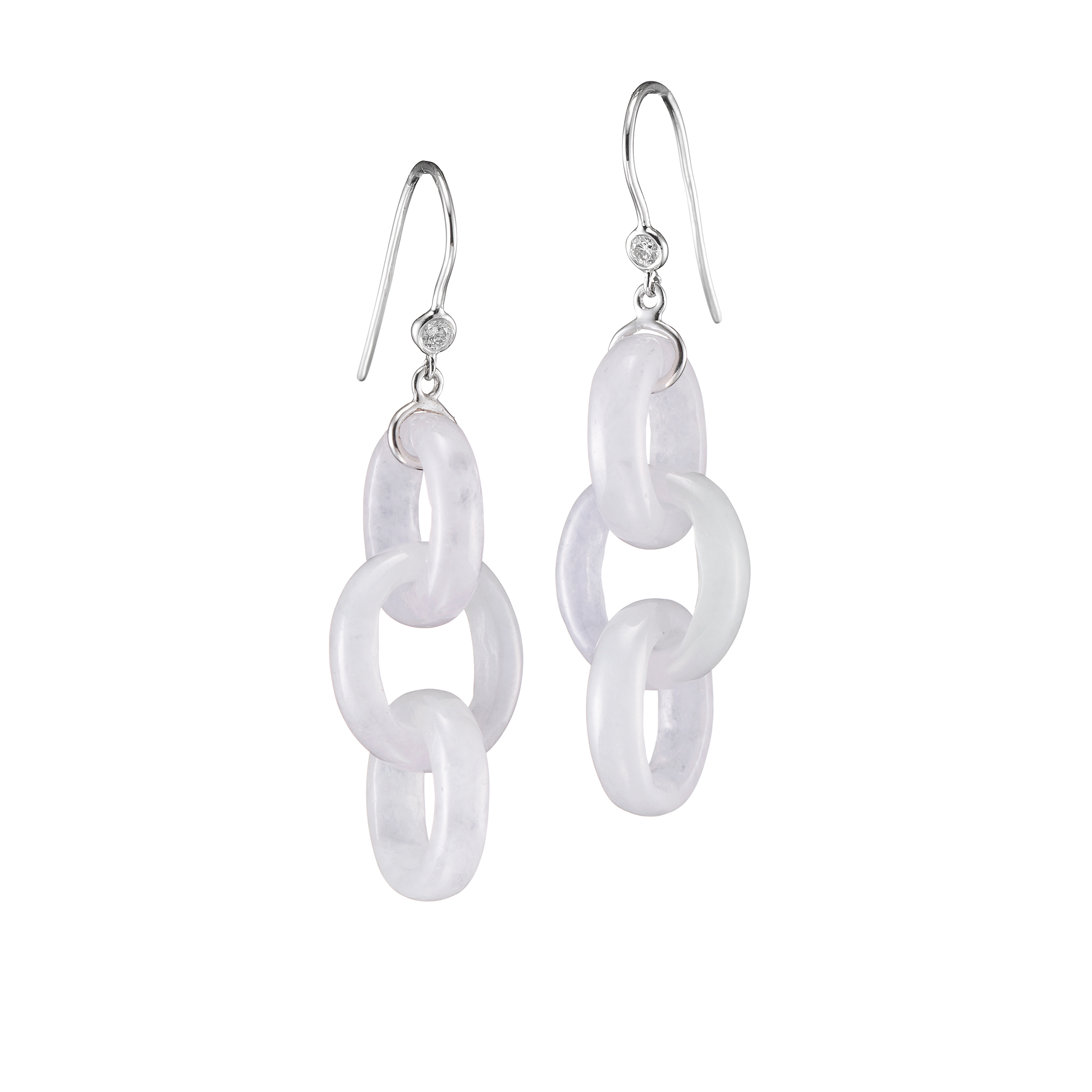 【清韻】系列,則以環環交串的玉環形制為主,琢製的工法,展露出玉雕手藝的獨到之處:此系列珠寶,並非兩個或多個玉環的「組裝」,而是經由作玉者的審慎度量,慢工細活,將一整塊的玉石給琢透了,方能成就交串又靈動的玉環配飾。