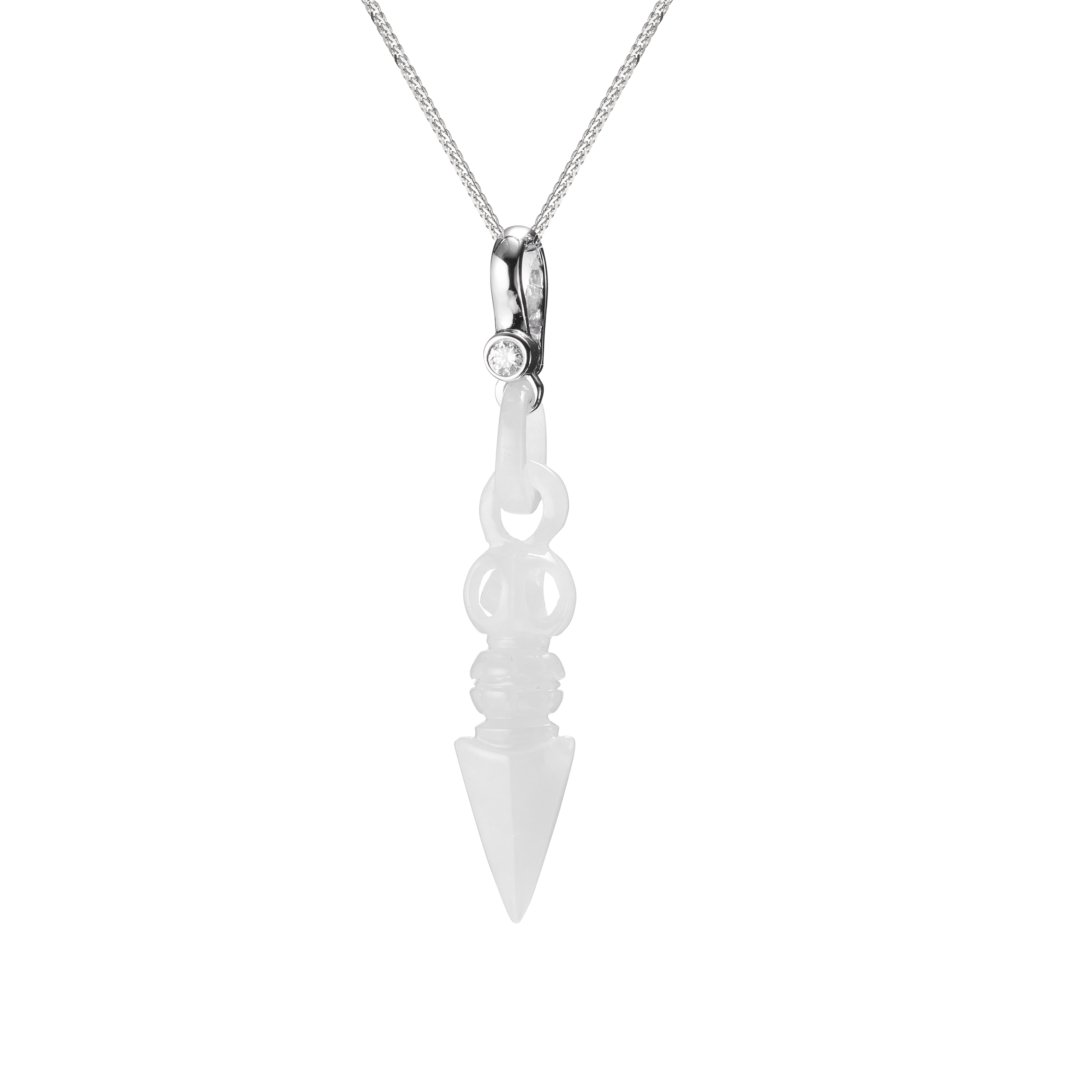 坊間可見此類配飾,多為銀製。【神行智慧】系列,則採用翠玉雕作,珍貴的翡翠,硬度甚高,雕琢不易,作玉者結合圓雕以及透雕等玉作手藝,呈現出玉環、蓮華、錐狀物之造型,比例合度,層次分明,工法細膩,再襯以鑽飾,透顯人文底蘊與時尚魅力。
