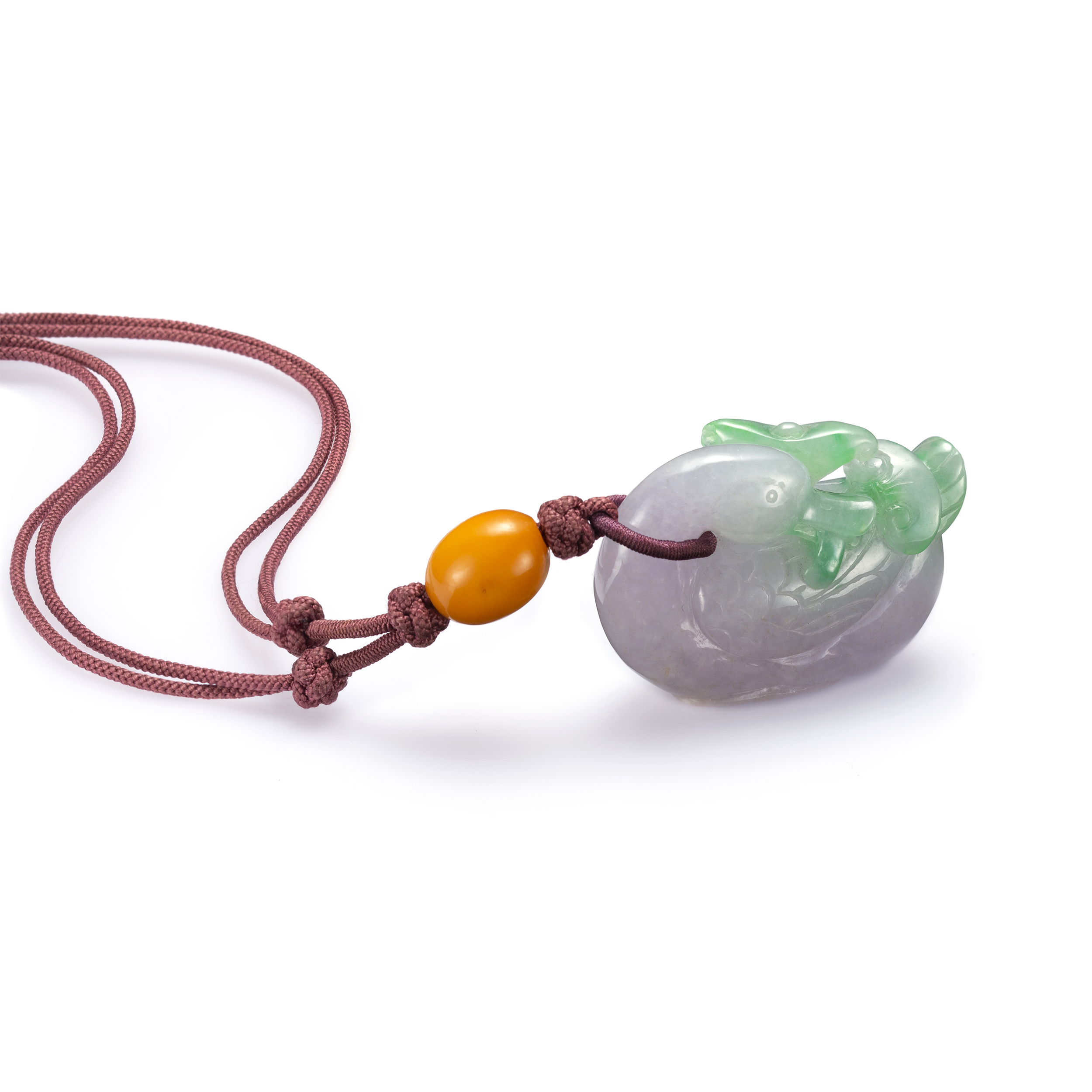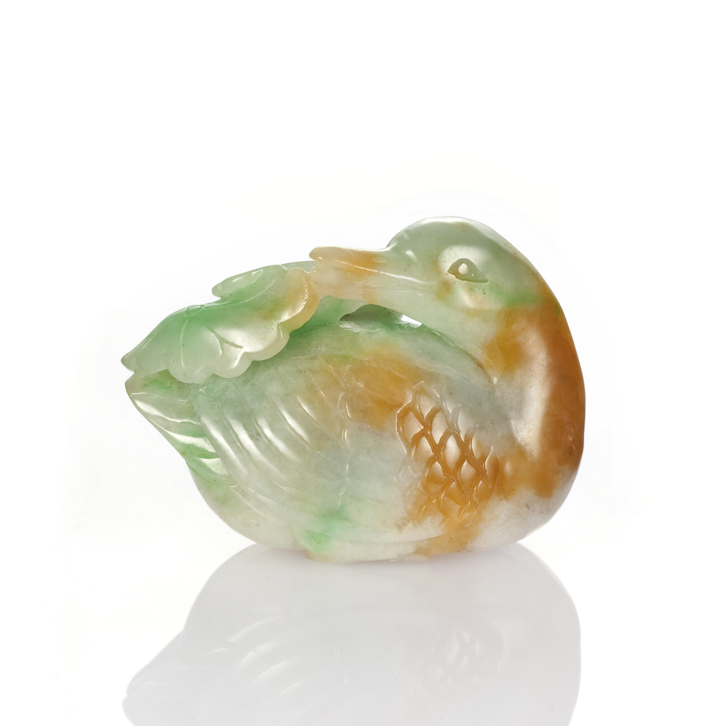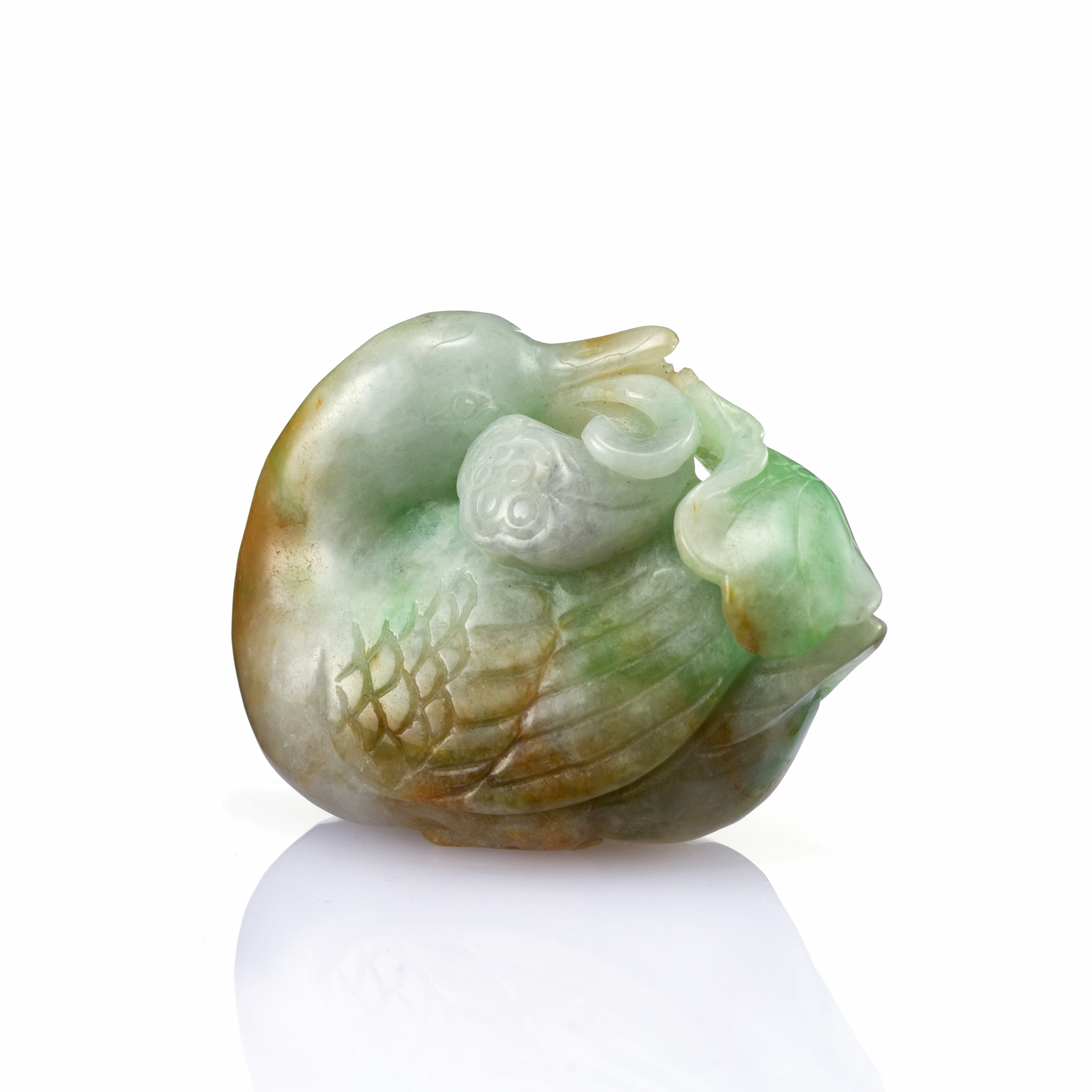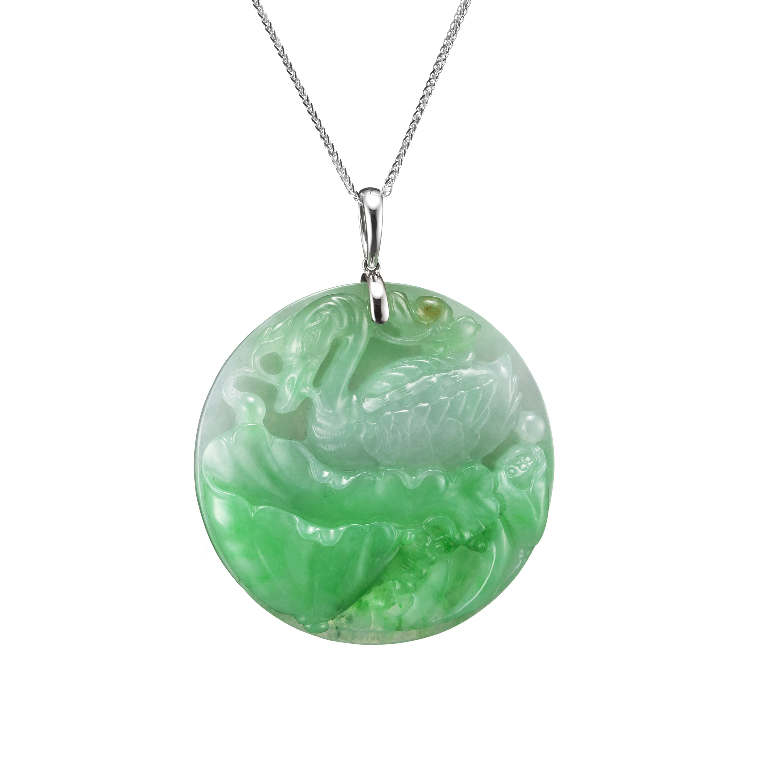 翡翠質色,溫潤多采,以「寶鴨銜蓮」入題,隨色賦形,俏妙變化,無論是珠寶配飾或巧致擺件,都能為這樣的吉祥圖騰增添生色,寶鴨與蓮華蓮蓬、如意或古錢相結合,祥瑞與文趣,精采栩栩。