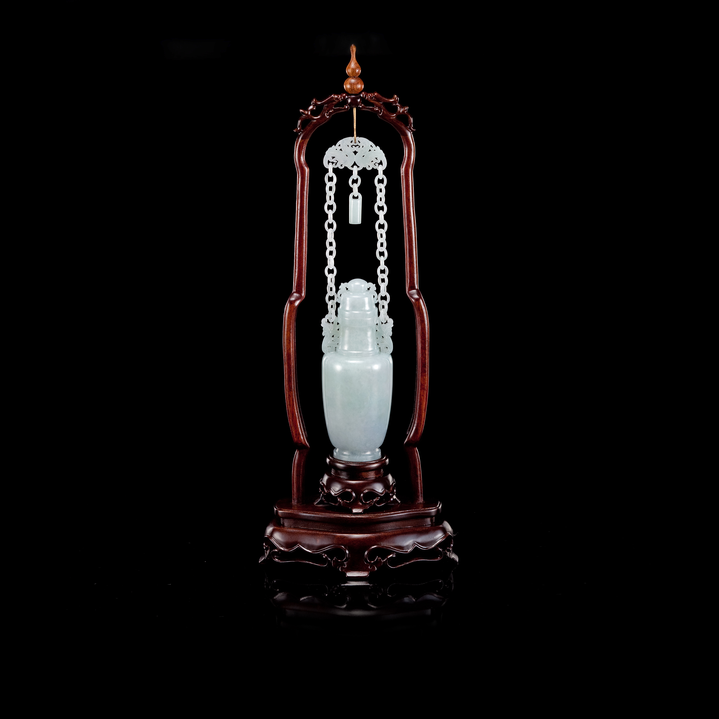 關於活環工藝的起源,可追溯至戰國時代前後,當時的工匠已能製作此類一體成型的奇巧結構;晚至明清時期,玉雕技藝臻於成熟,活環的製作則更見繁複精細,尤以清宮御用玉瓶中的連環活鏈,最能體現此工藝之極致。