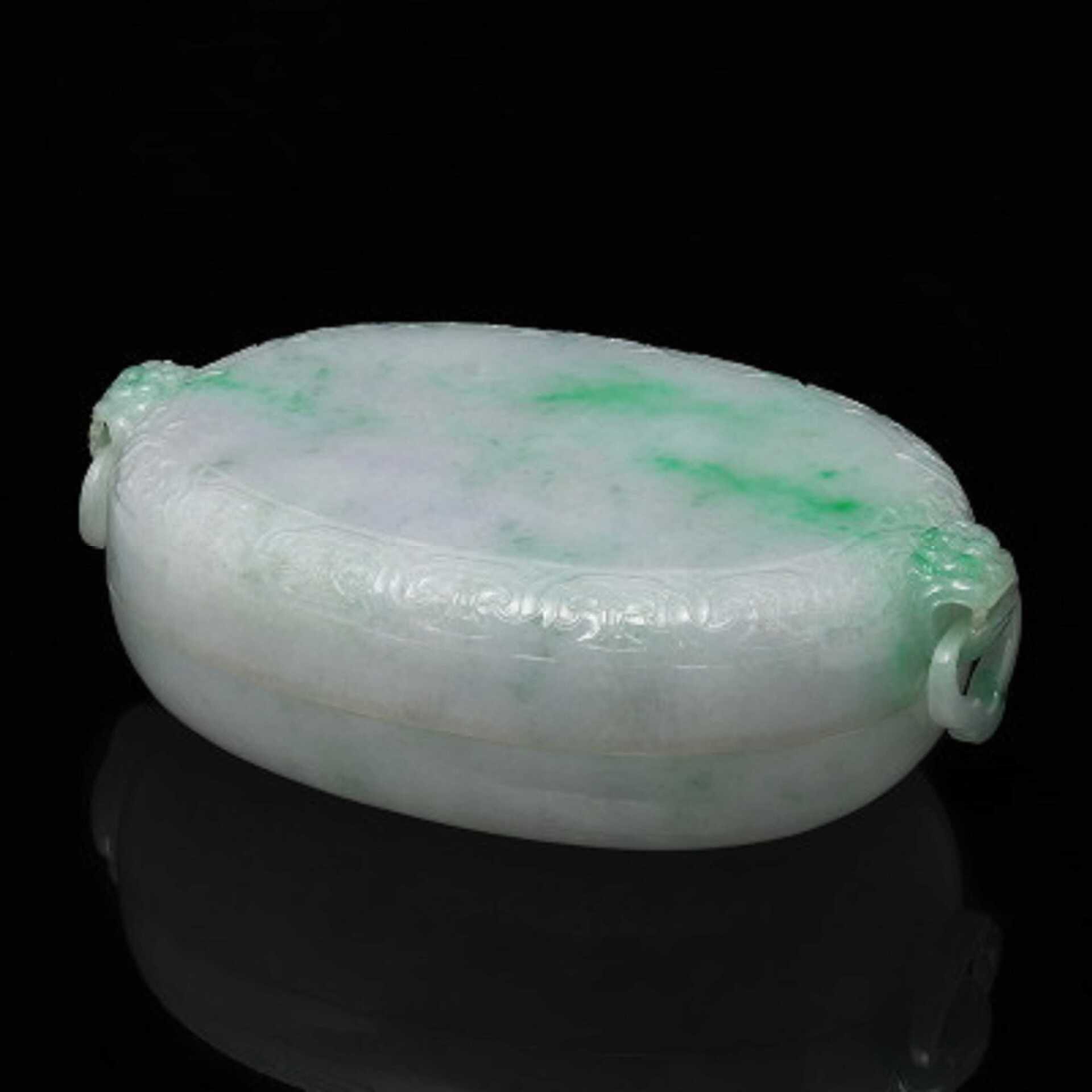 以翡翠玉盒為例,此作,以冰種翡翠琢製而成,幾抹翠色,點染於清潤的白翡之上,極雅、極美!器身上的裝飾,採簡雅風格,有雙獅銜環,有吉祥薄意圖紋,素淨的美學風格,反倒襯出了一種大度的貴族美學!
