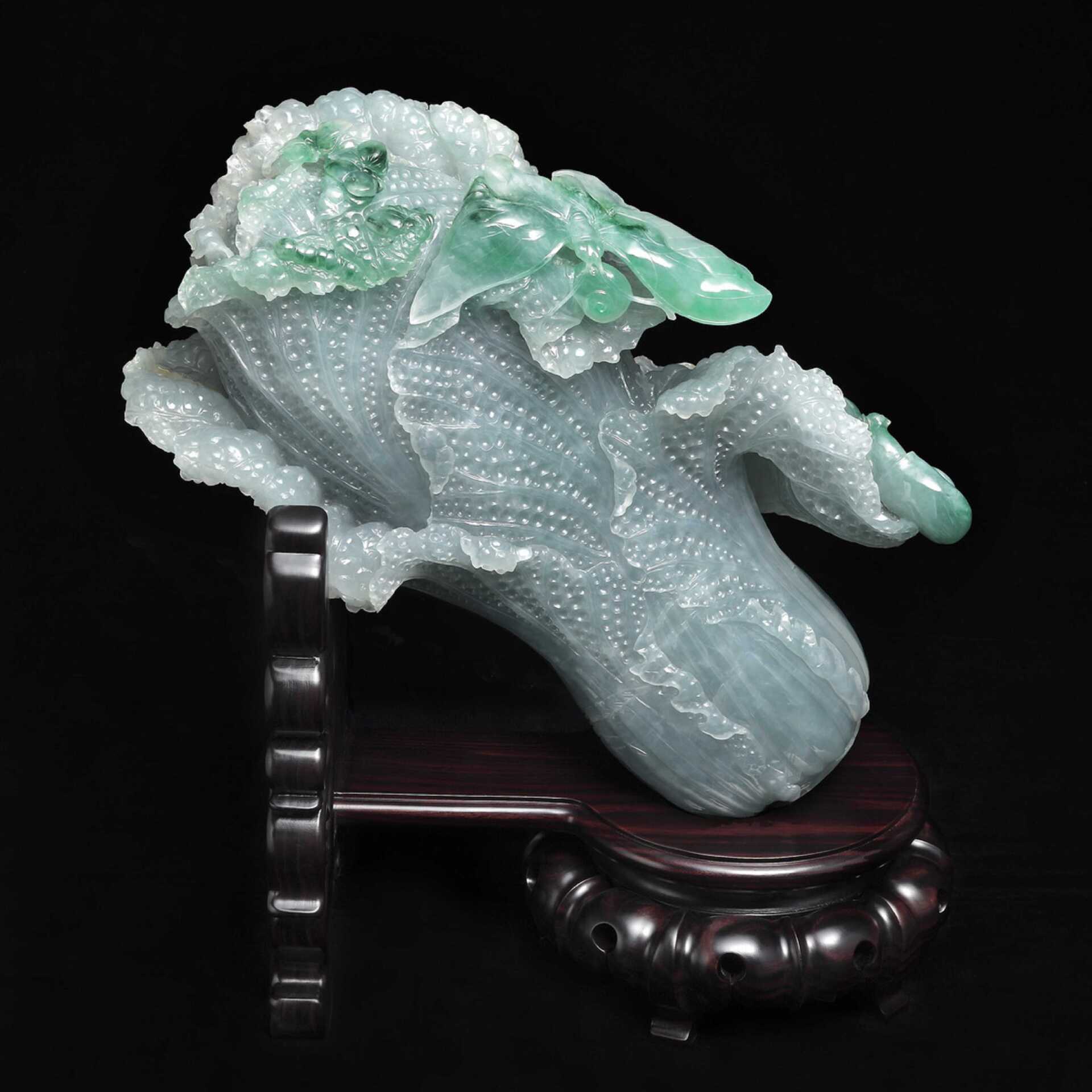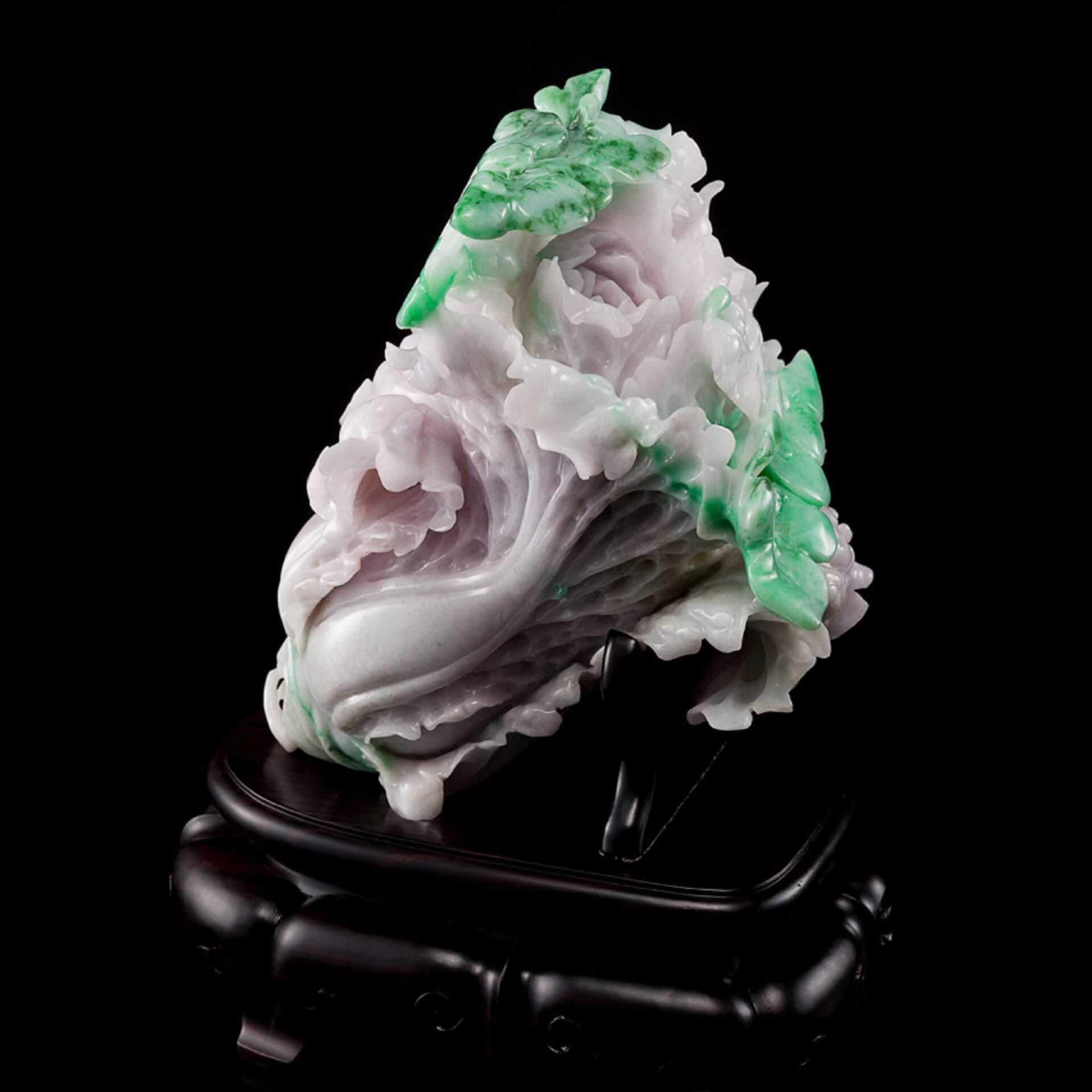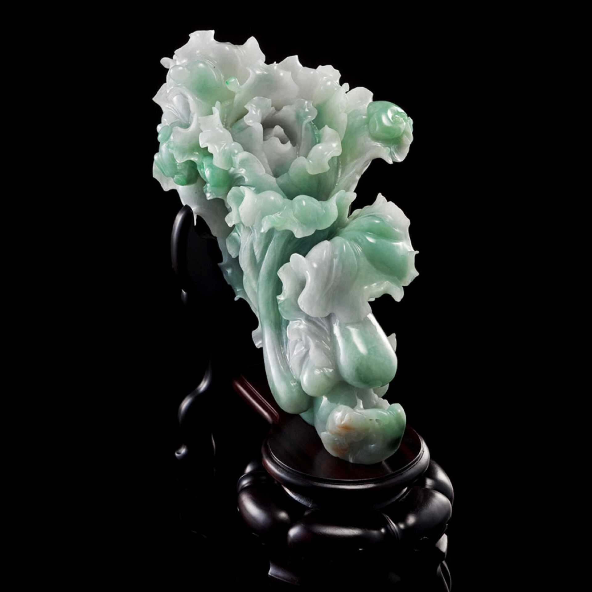 玉世家藏有數件「翠玉白菜」作品,皆是以嬌貴的翡翠為材,細膩化作生機盎盎的白菜,不論是葉身紋路或其捲曲之態或是其上昆蟲等等,都呈顯出了各自不同的美麗姿態。