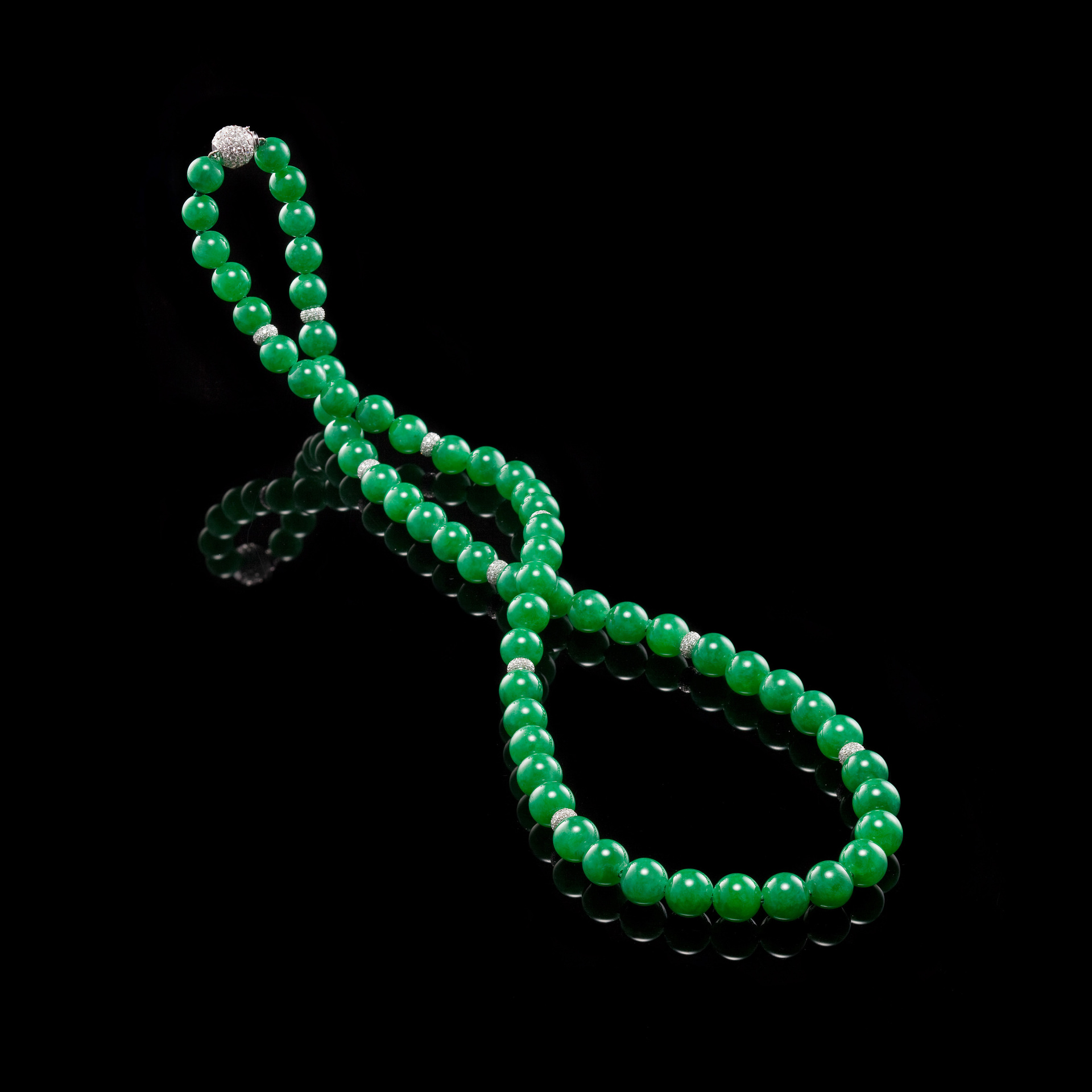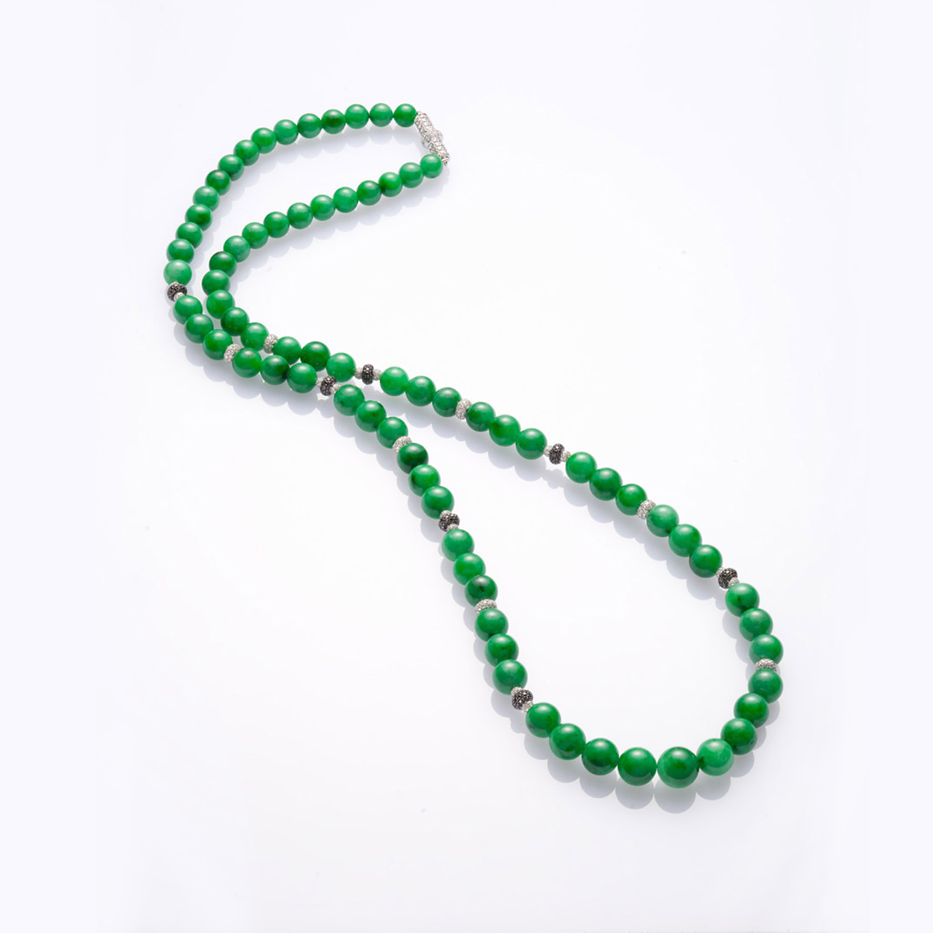 「珠圓玉潤」一詞,通常,是用以讚揚辭藻文章的圓熟或歌聲質地的澄澈清潤,然而,若要將此四字化作一件可見、可感、可觸、可翫的實物,那麼,翡翠珠串,應是最能實踐「珠圓」與「玉潤」的美麗象徵物了。