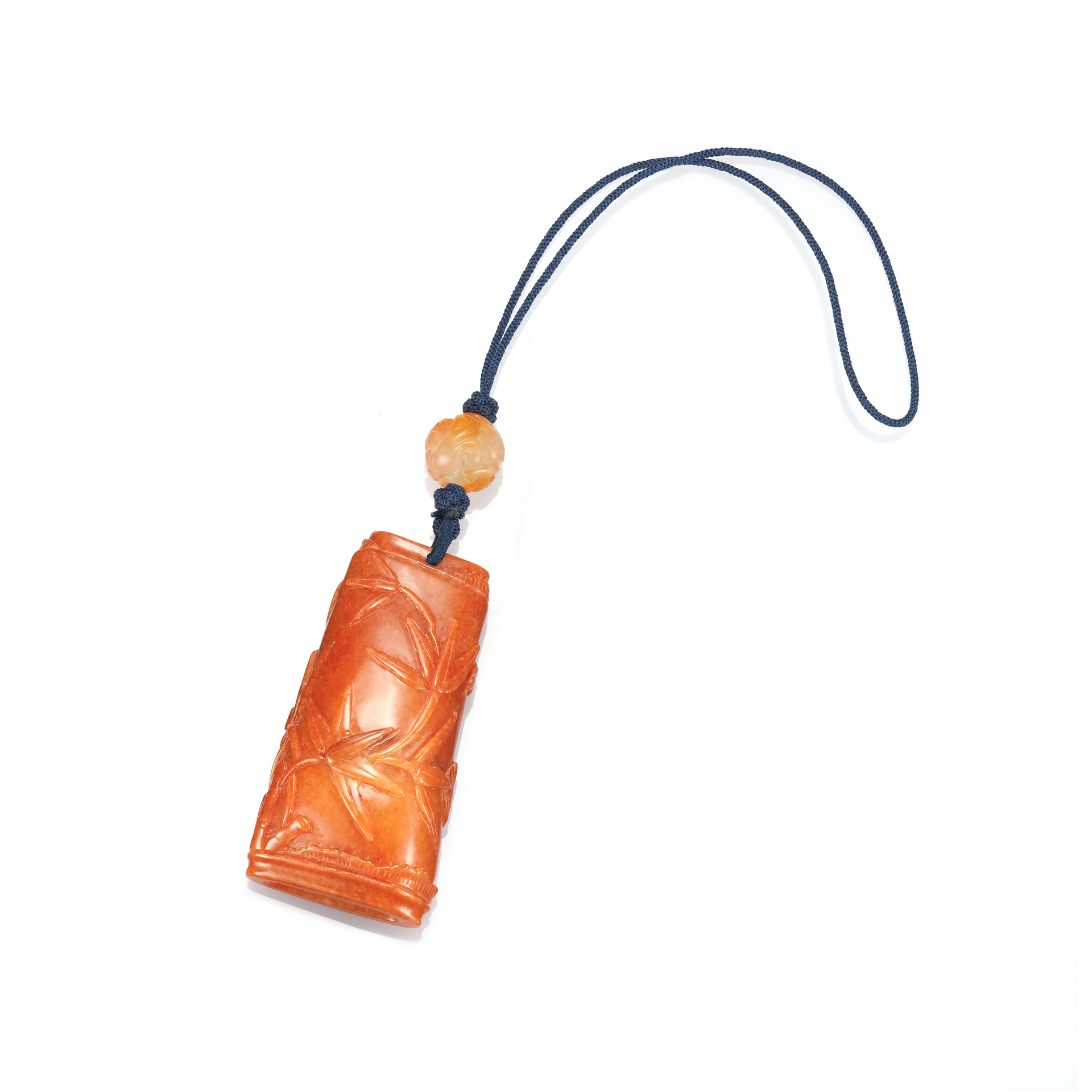 【竹報喜慶】 紅翡玉質,溫潤光瑩,赤色豔豔如火,喜氣了眼目,也鬧熱了心扉!刀筆琢為竹節,竹節上,竹葉搖曳狀,教人如臨清風。竹節中空,寓意君子的謙沖與氣節,而竹之美,更添增了深深的文雅氣韻。