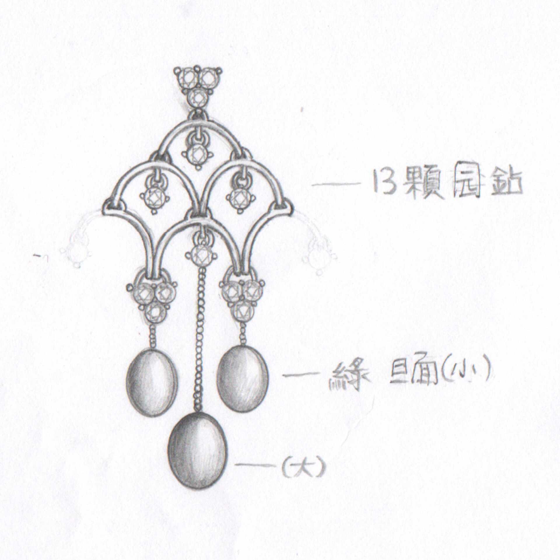畫樣設計,決定了該翡翠玉料面對世人(或市場)的方式,根據翡翠玉料的顏色、質地、透光性、玉材形狀大小,以及瑕疵狀況等各項因素,進行了全面的評估、考量與取捨之後,因材施藝,俏色巧思,並在等比例的繪圖紙上,或直接在玉料上,畫出設計圖樣。