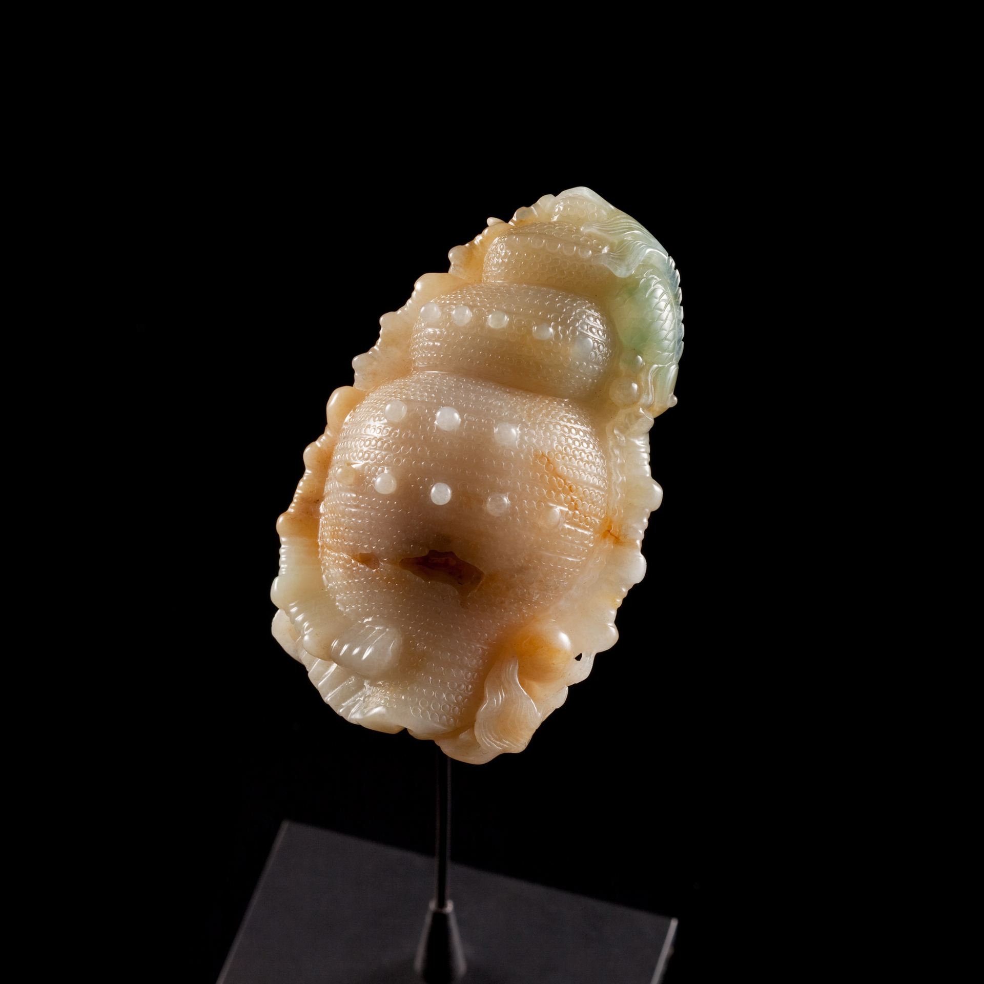 貝殼形制,內蘊著財富、護佑與幸福的意涵,是備受喜愛的吉祥信物。以堅硬的翡翠質地,細細琢磨出面目各異的貝殼,除了豐富的玉色變化,雕作的刀筆細節,更是值得反覆品翫。例如,貝殼殼身的紋路,花形的、曲線形的、點狀的、環狀的等等,都考驗著作玉之人的創意與手藝;再者,殼內的掏膛,以及將殼身呈現為薄透的過程,更是難度甚高的工夫,那是時間的長久積累,更是精熟於翡翠玉材特性與玉作技藝工夫之人,方能操持得宜。