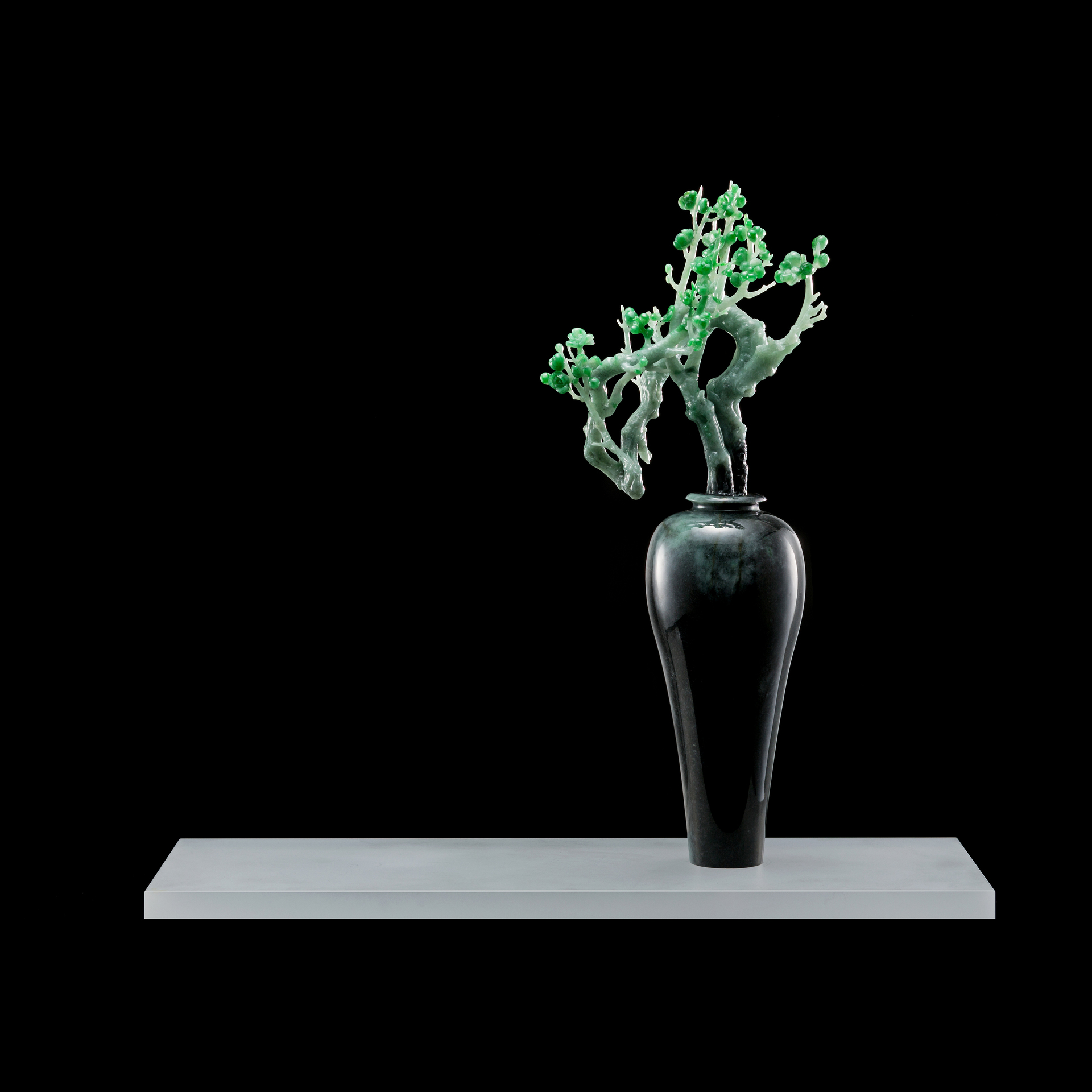 「梅瓶」,做為雕件的主題,通常會與「梅」兩相搭配,施以刀筆之際,梅瓶瓶身的優雅線條,尤為引人注目,曲線比例的拿捏,甚為重要,稍有差池,都將會影響整體的意境表現;而梅的施作手藝,則特別會著重於它的氣韻與格調,梅花的含苞或盛開、梅枝的曲折或遒勁,以及疏密布局的安排等等,皆是再三思量的重點。