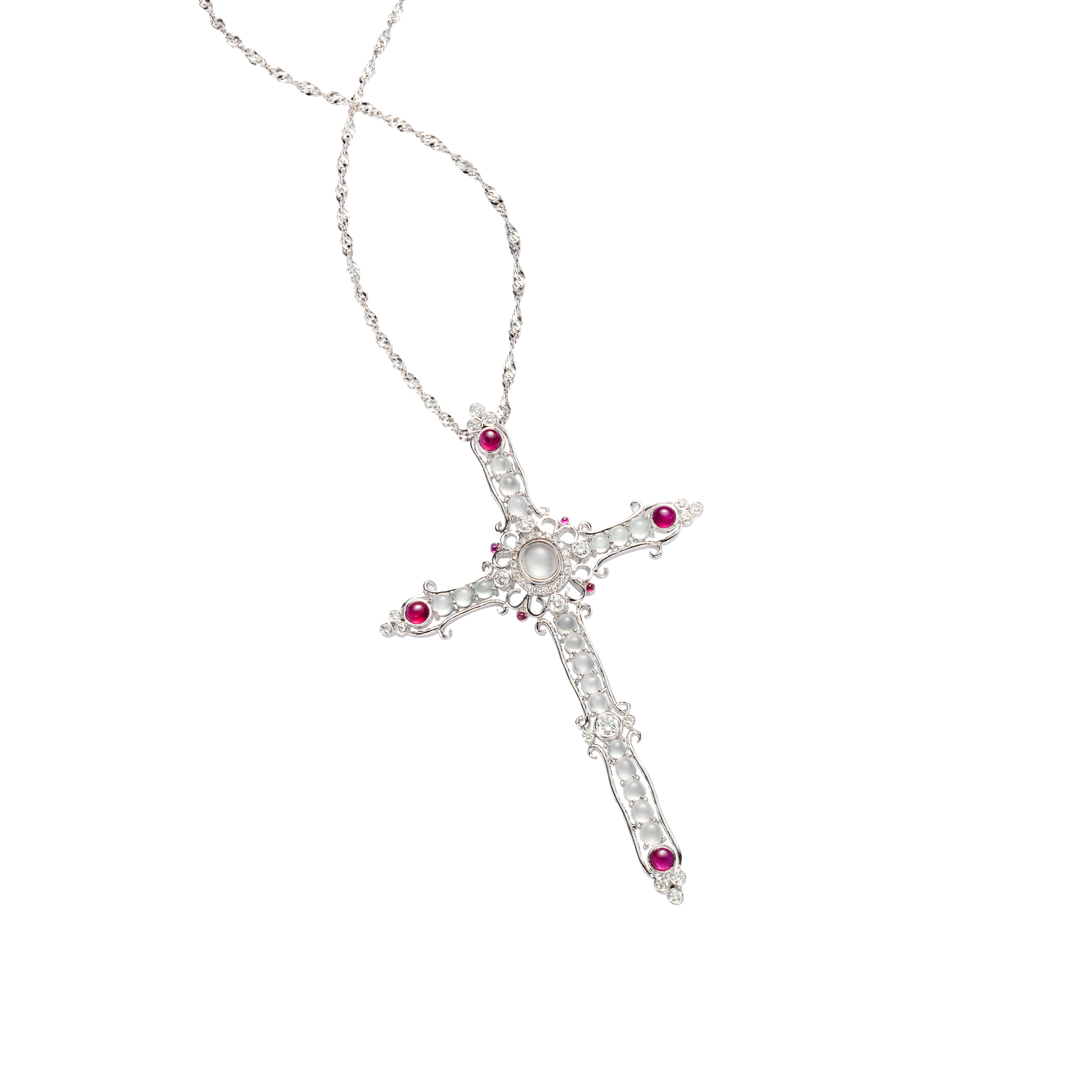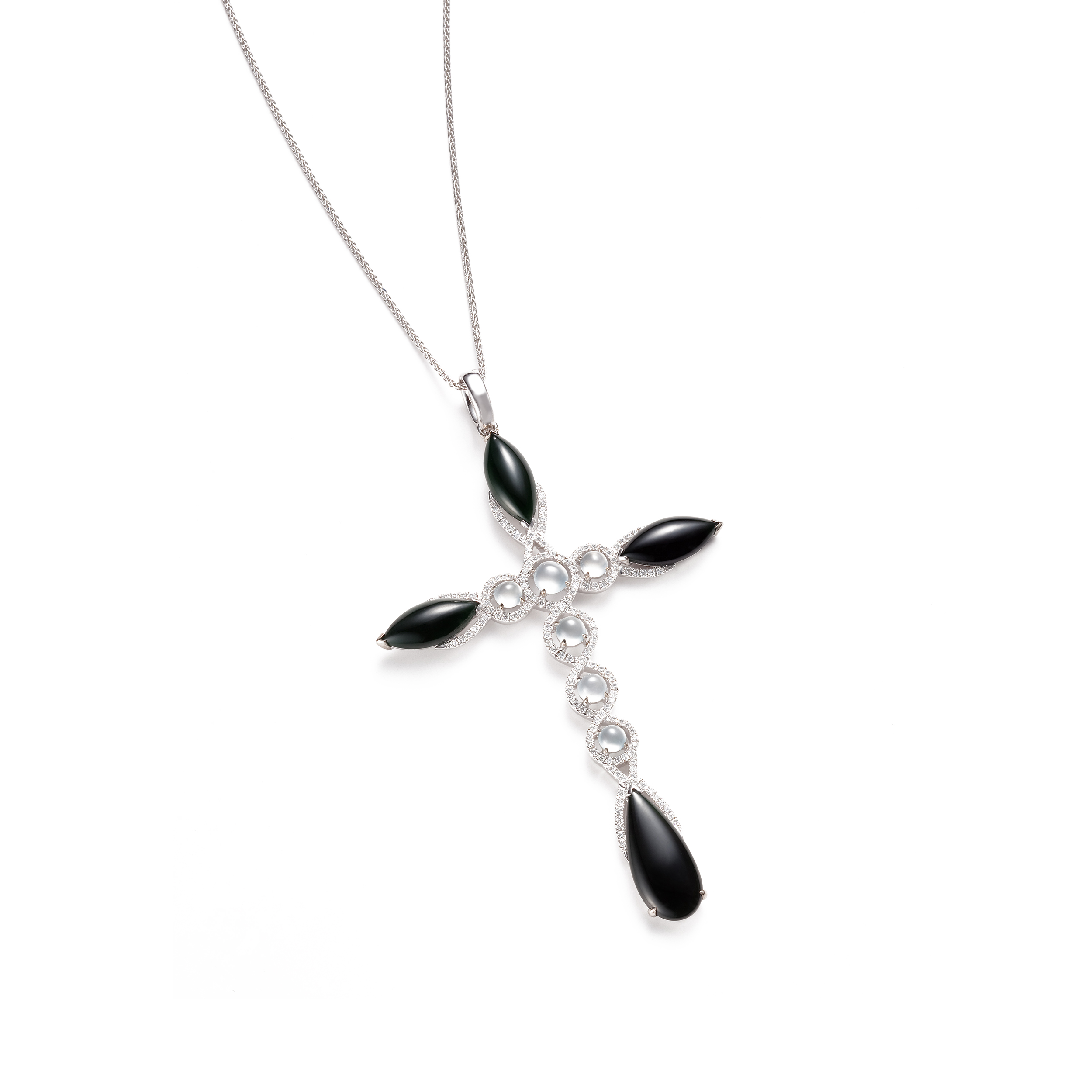 翡翠主石,以蛋面、馬眼、水滴或長形等不同幾何造型的切割方式,各自釋放著溫潤內斂的光芒,演繹著十字架的智慧底蘊;而十字形框架的線條,更融合了西方古典、裝飾藝術、新藝術等現代設計觀點,在流線與直線的勾劃之間,傳達出一股新古典、輕時尚的美學風情。
