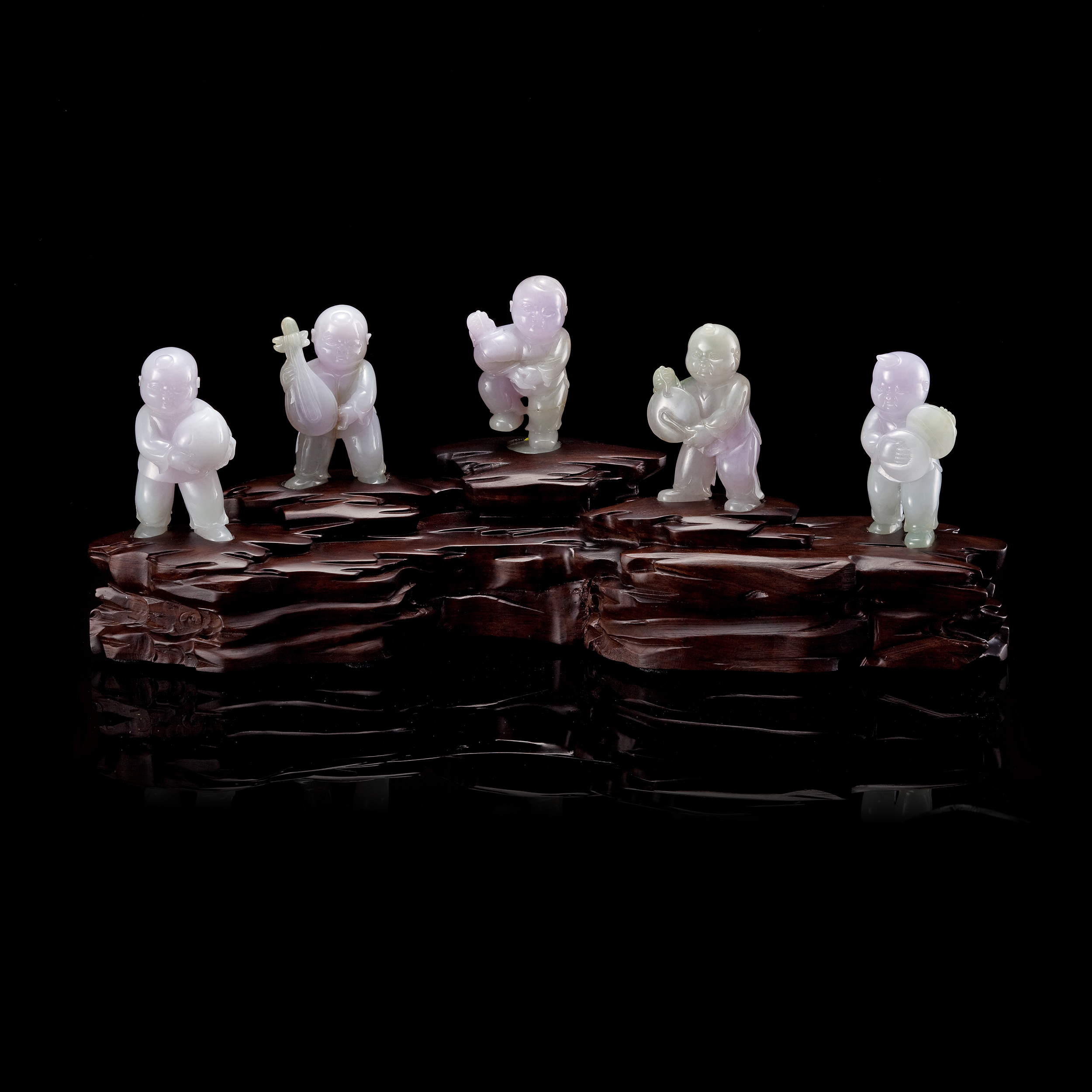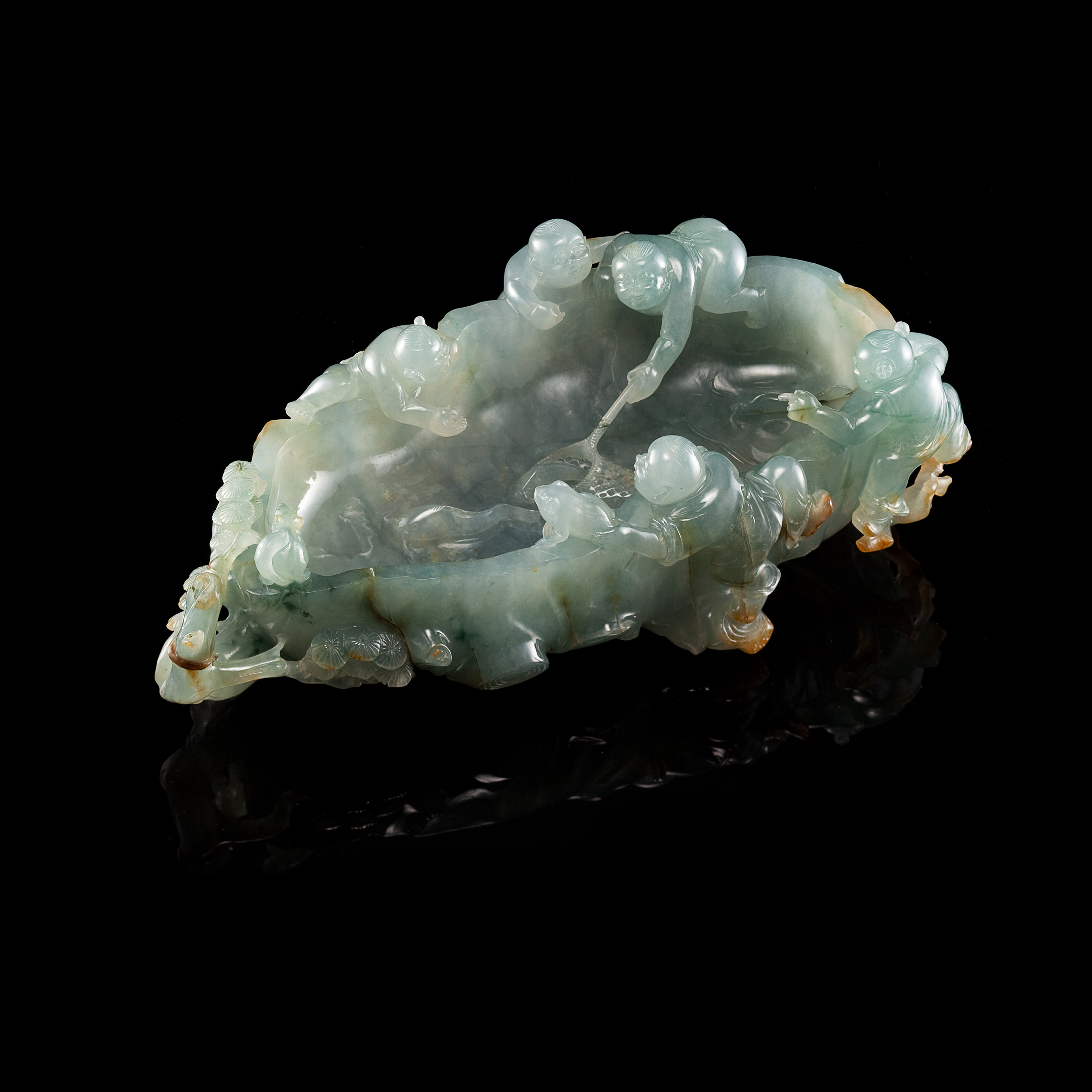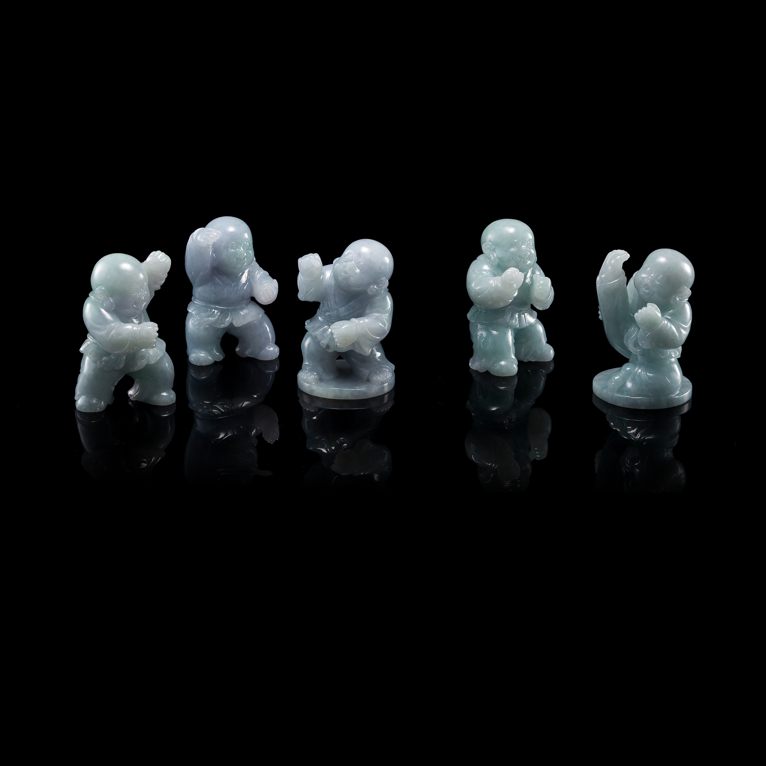 由於翡翠材質本身的溫潤清透,雕作後的童子形象,格外引人著迷!孩童幼嫩的膚觸,在潤澤玉光的映襯之下,最能呈現彷彿吹彈即破的可親可愛;而童子形象的頭身比例以及面容表情姿態,在精湛刀筆的刻劃之間,不僅為作品主題加添視覺趣味,甚至,亦能鬧活出一場歡樂的聲響。