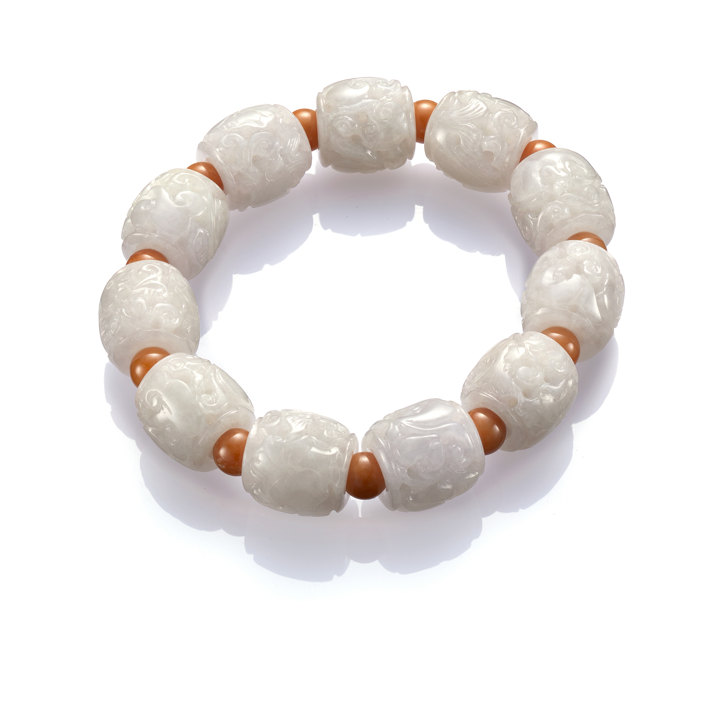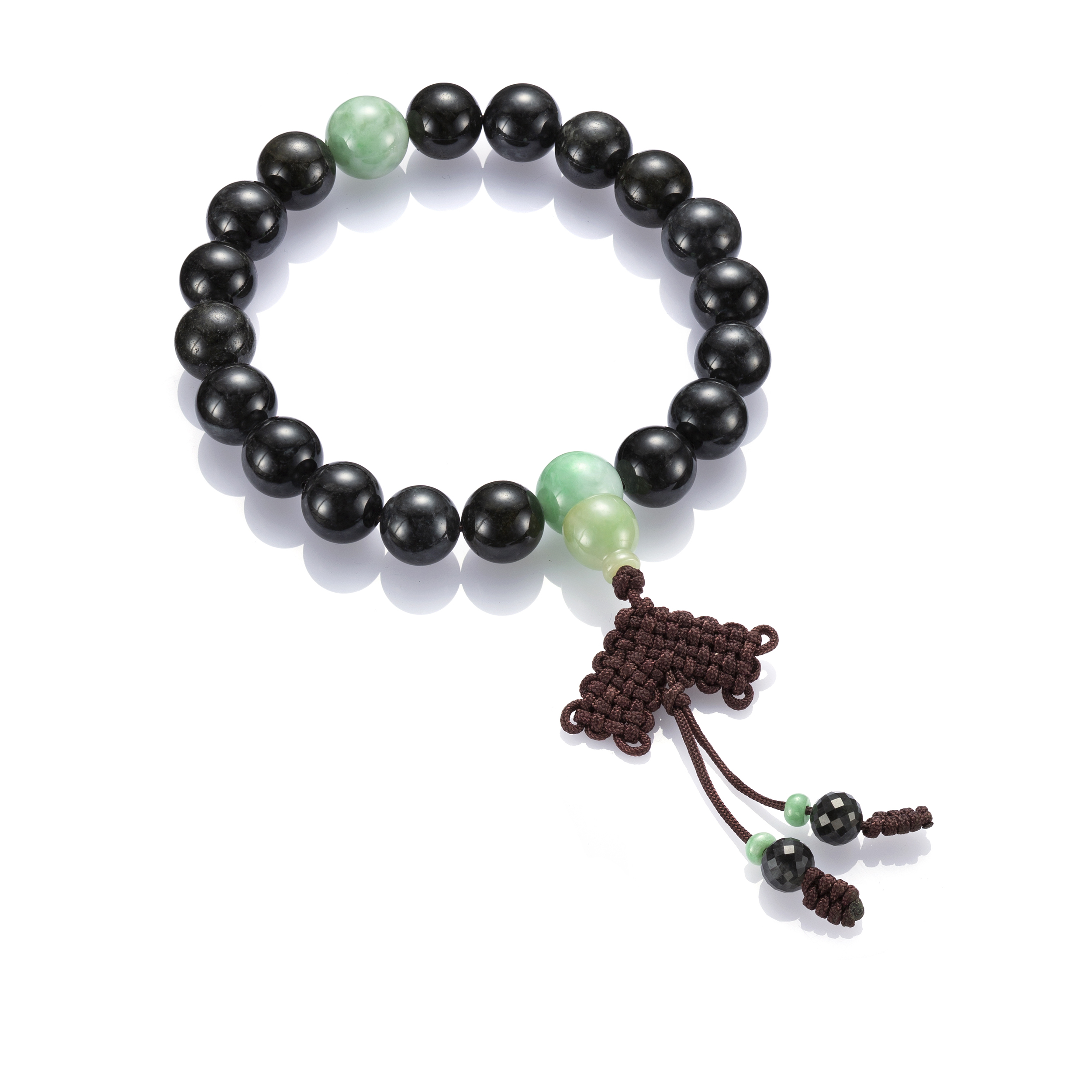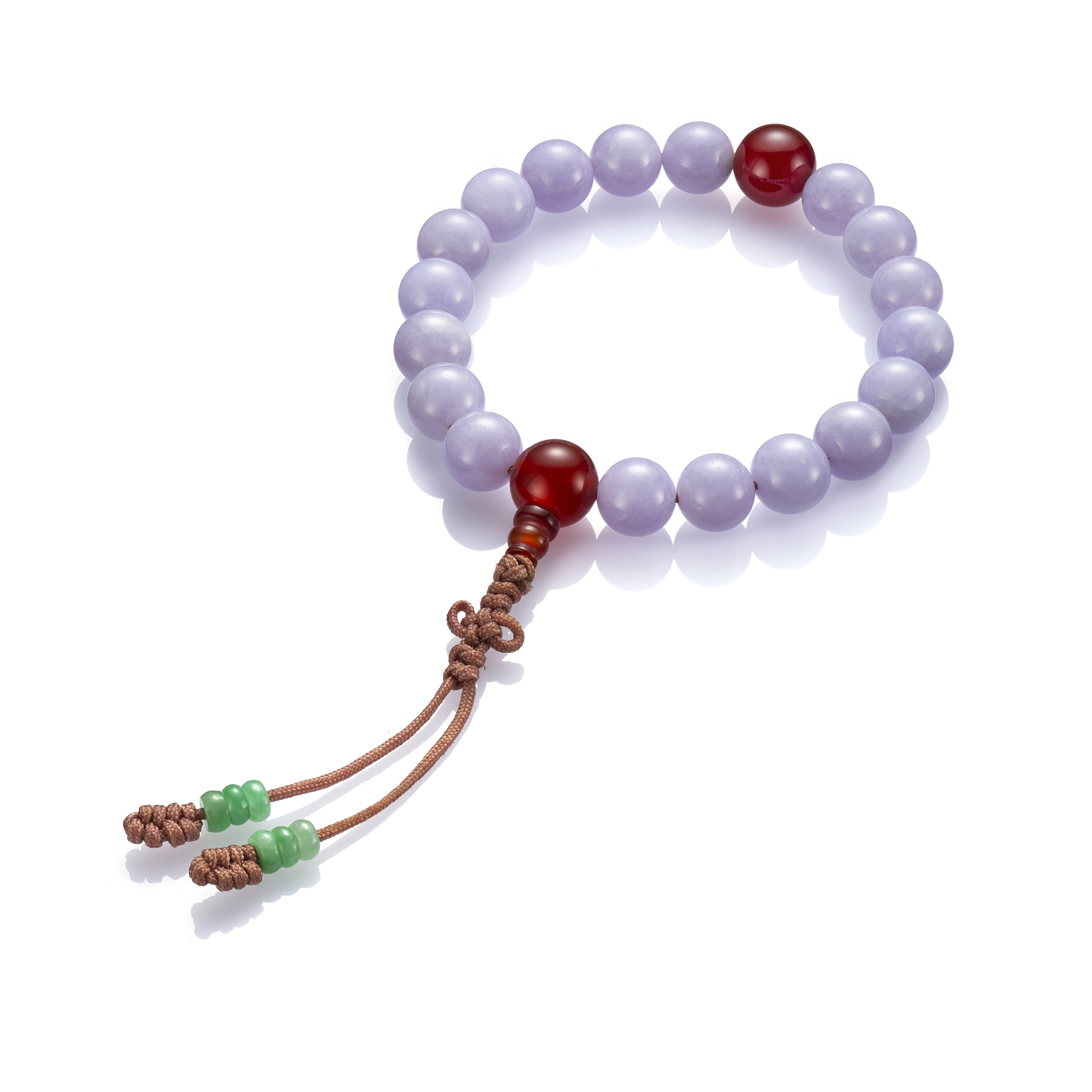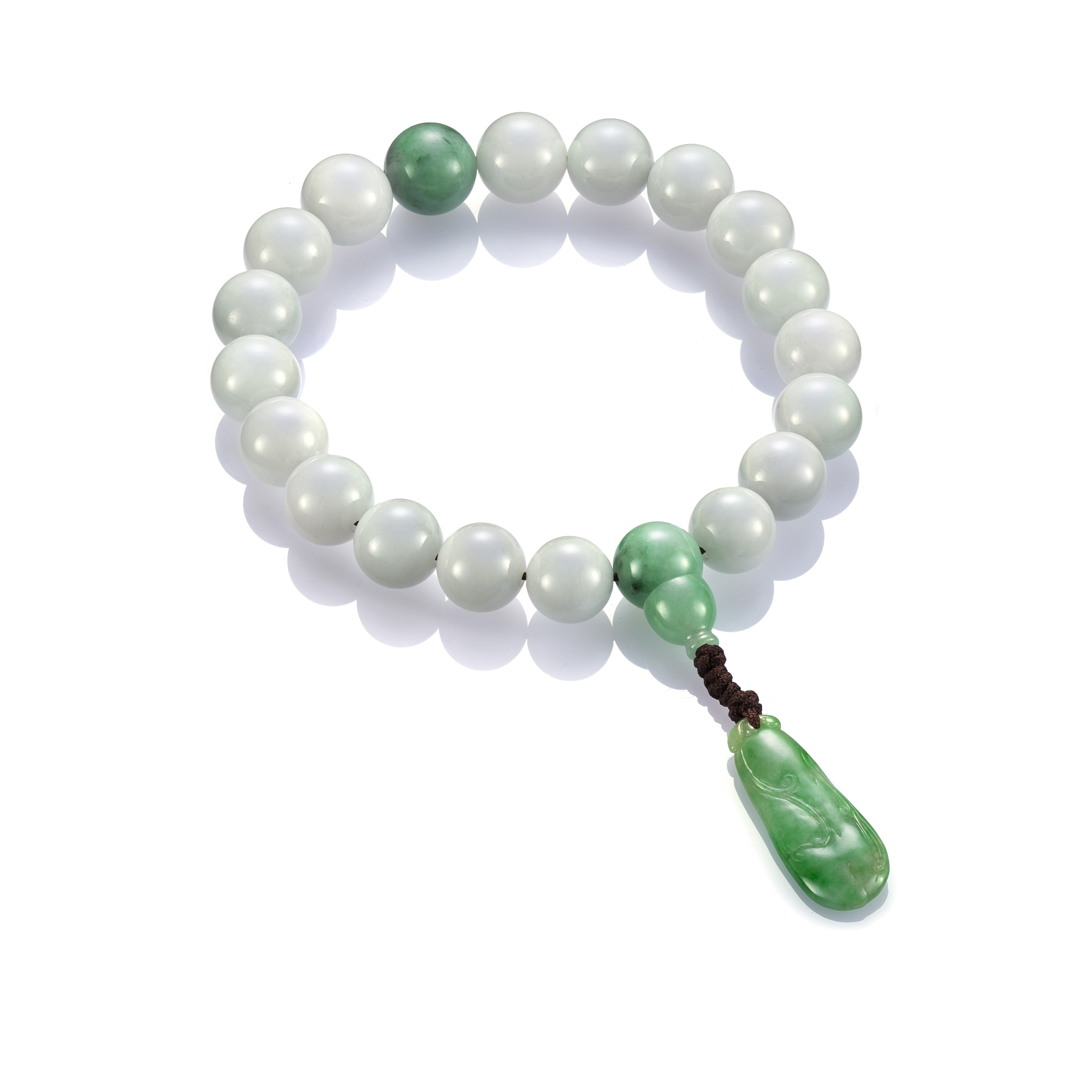 另有於玉珠上施作雕飾的翡翠手串,雕飾的主題,以祥瑞福祿的吉祥圖騰或神佛羅漢為主,既可品翫雕工之美,亦深蘊著庇佑祈福之意。