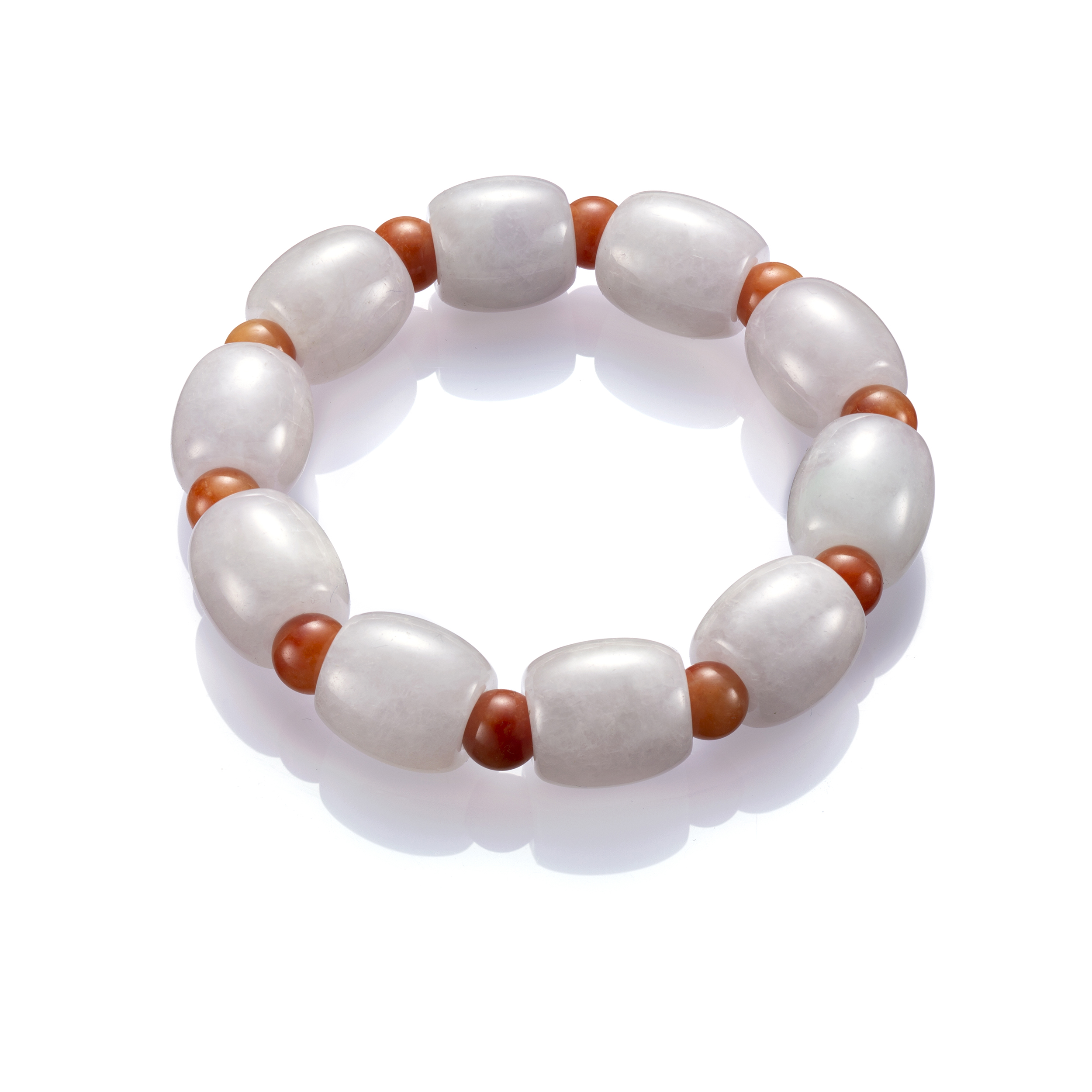 翡翠手串的種類,有百般面目,其中,尤以光素的玉珠形制為主流。由於素面無雕刻紋飾的玉珠串,其每顆玉珠的大小、質地乃至色澤必須趨近一致,始能呈現諧和的美感,因此,多是取擷自同一塊翡翠原石,琢磨過程,耗時又耗料,也唯有在耗時又耗料的仔細琢磨之後,方能成全如此一只象徵百事圓滿的美麗持物。