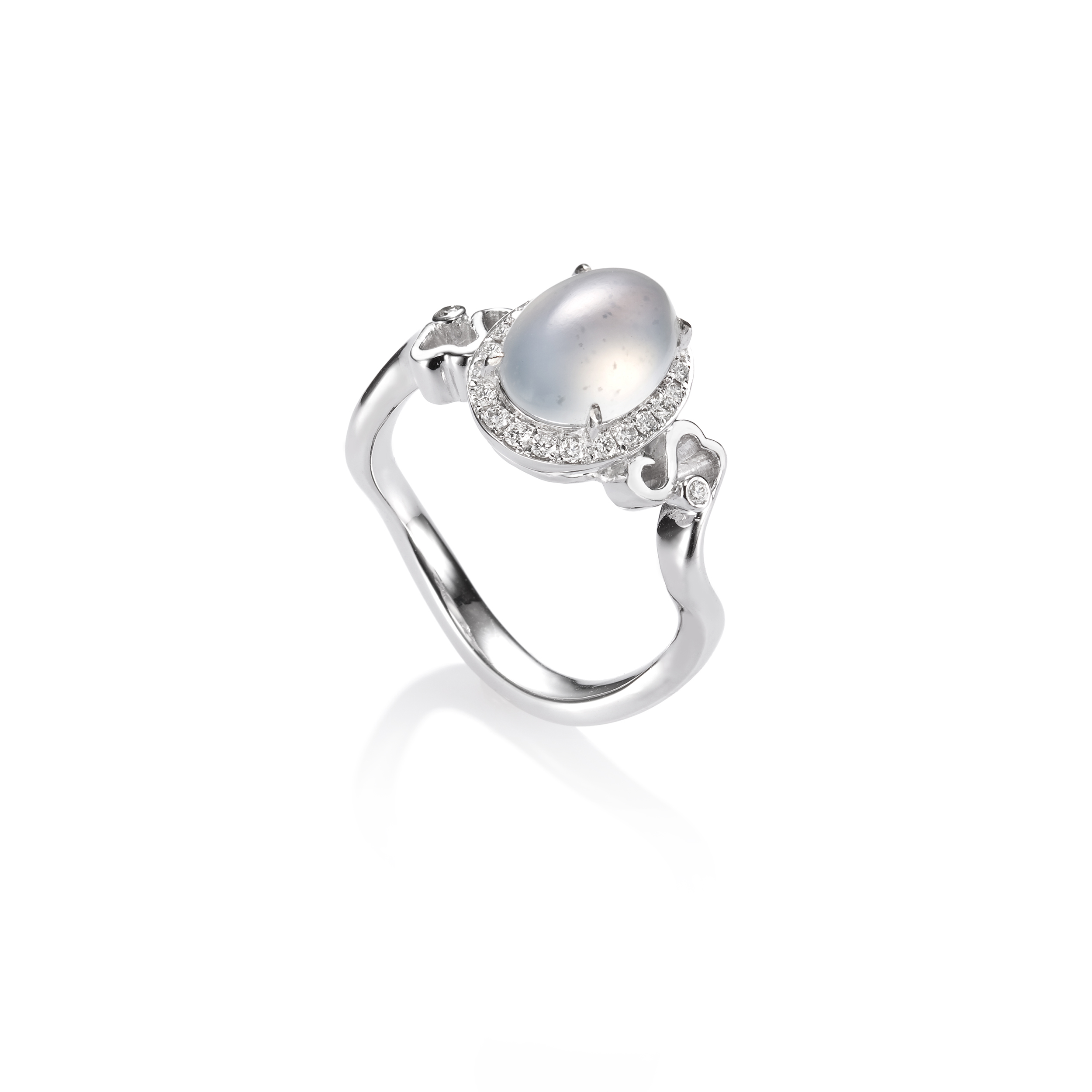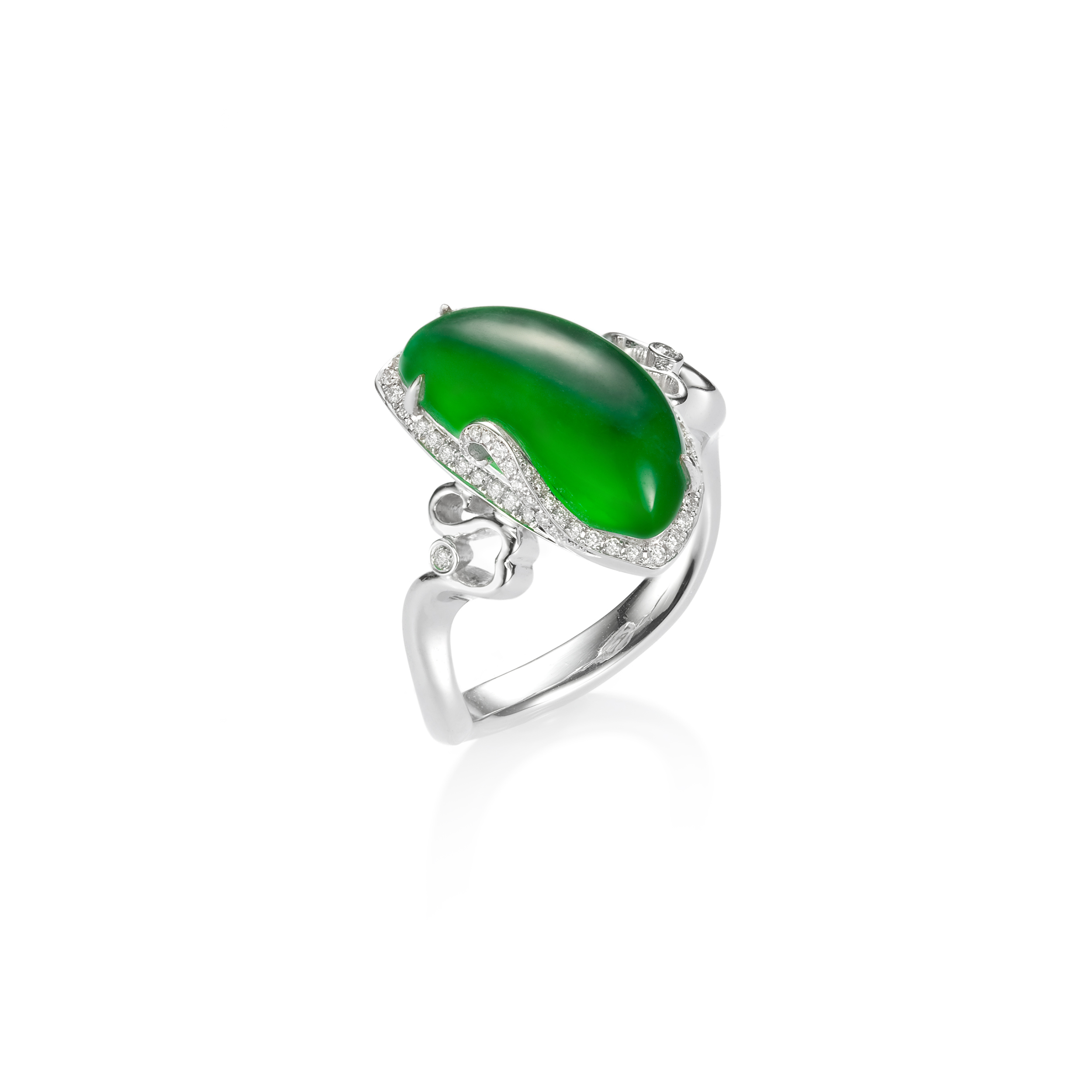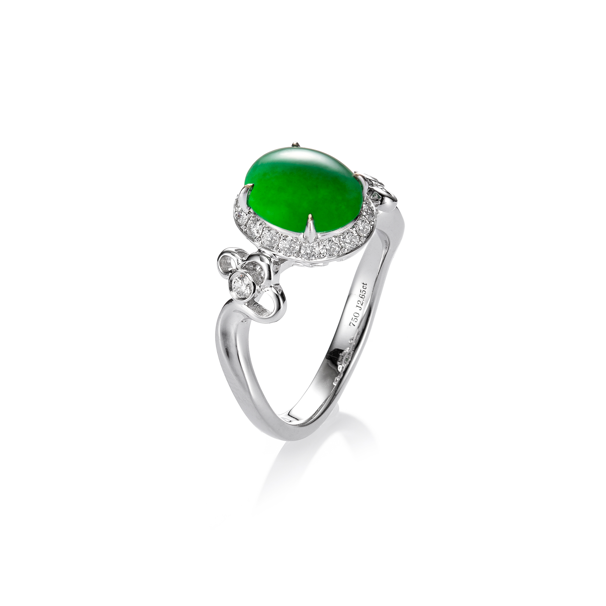 【如意雲】,以翡翠為主石,經典的蛋面造型,映現著玉光翠影,亦成就了美的圓滿。綠翠或白翡或紅翡,各自詮釋著不同的氣質個性,主石周圍,點襯著鑽飾,更顯燦亮光華。主石兩側,巧妙置入了如意圖紋,寄寓吉祥的意旨,戒身線條,融入流水行雲的概念,宛轉於整只戒身,為主石的圓滿加添了清靈且俏麗的韻味。