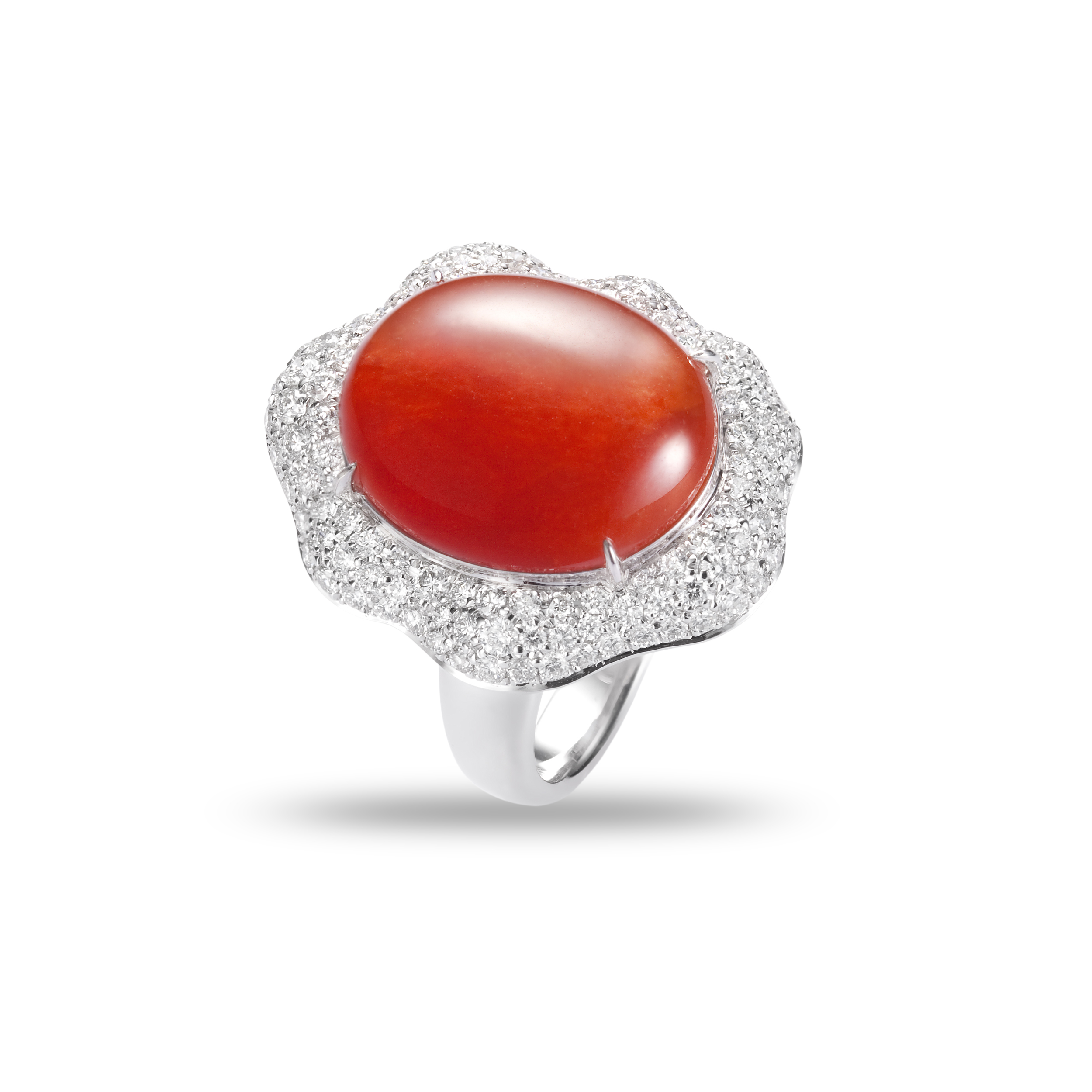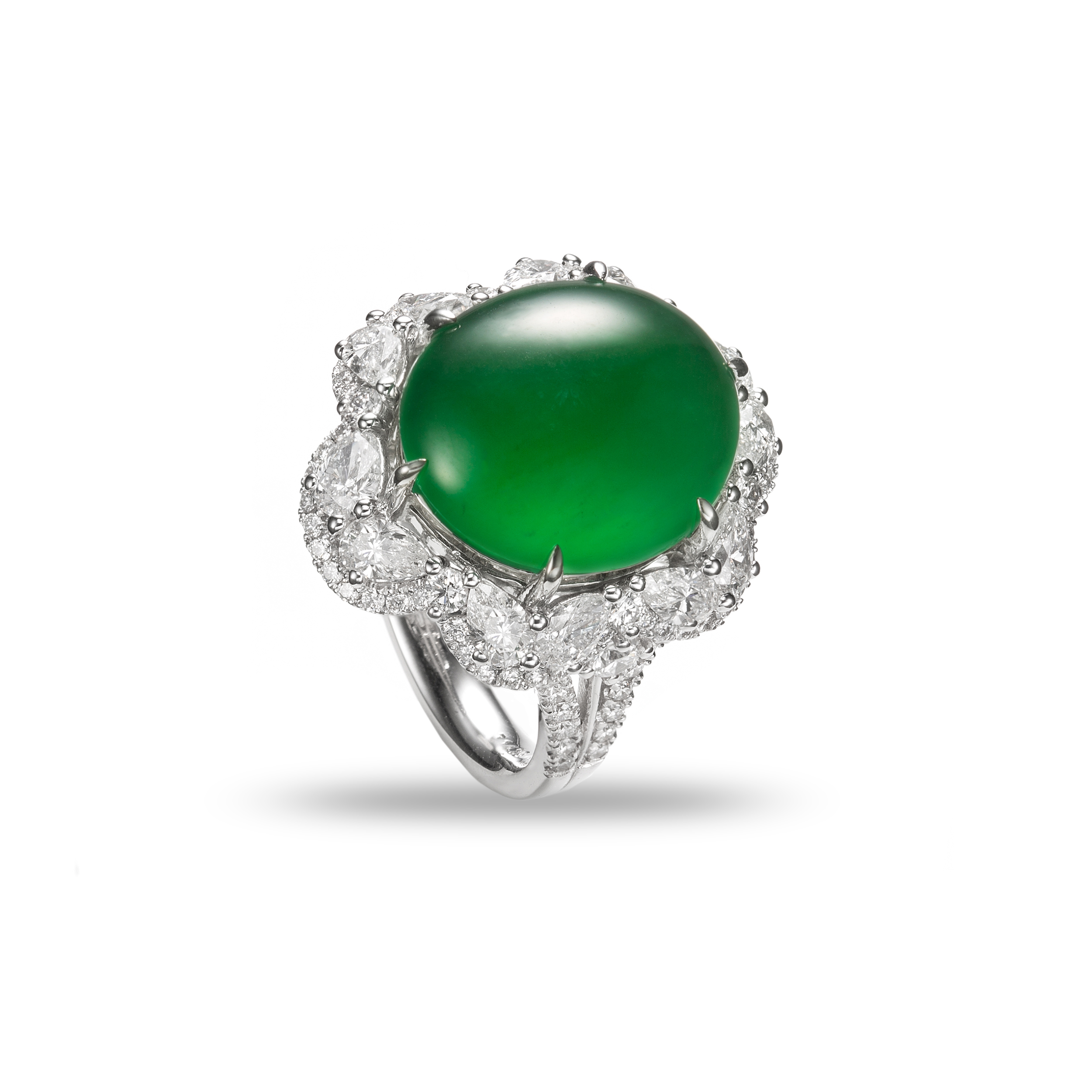 【花約】系列,以翡翠為芯,琢磨為蛋面,綠翠盎然,紅翡嬌豔,紫羅蘭浪漫,再以燦鑽為瓣,於是,纖纖指間,綻出了永恆的花。永恆的花,不凋,而花裡的誓約,愈久愈彌堅。
