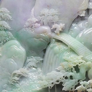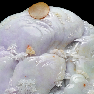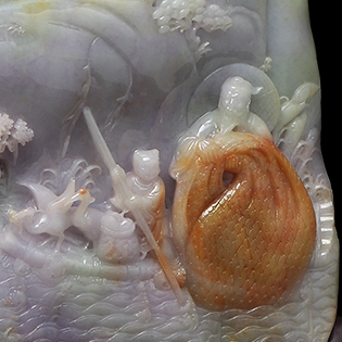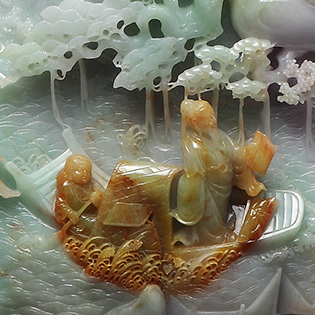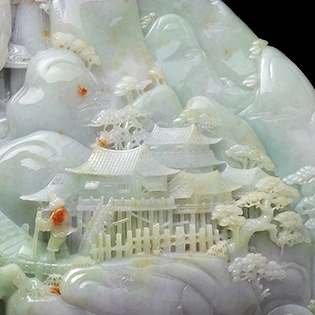 緣溪入桃源,遂得忘塵世之憂勞。煙波江岸,有文人吟詠,有漁人捕撈,視點漸向高處位移,橋上行人,山間樓閣,層層疊疊的雲深之處,且靜謐,且深遠……瑰麗多彩的大四喜玉作,匠心獨運化為一方幽靜天地,可觀精雕細琢之工,亦得於遊目之間澄澈心靈 。