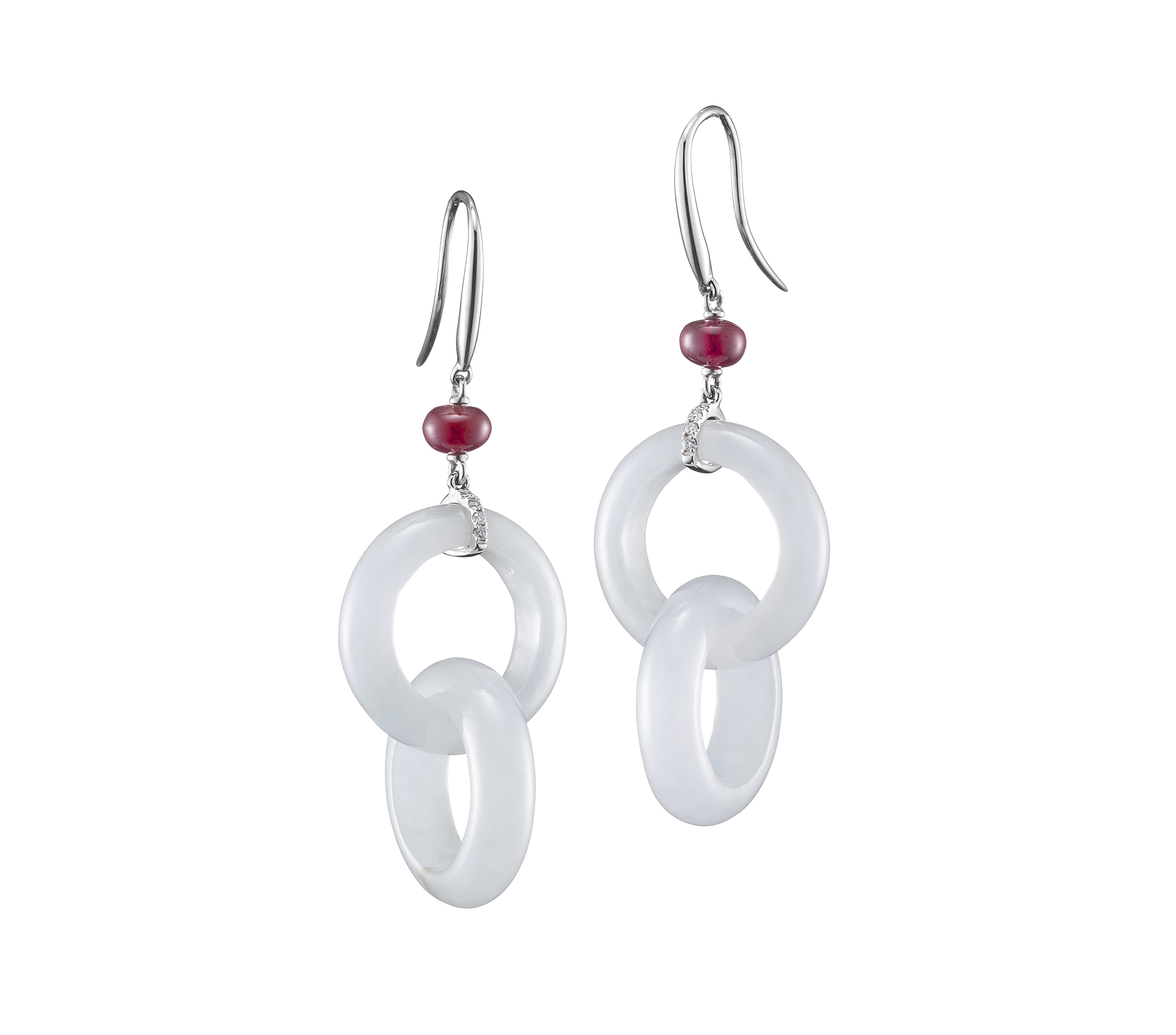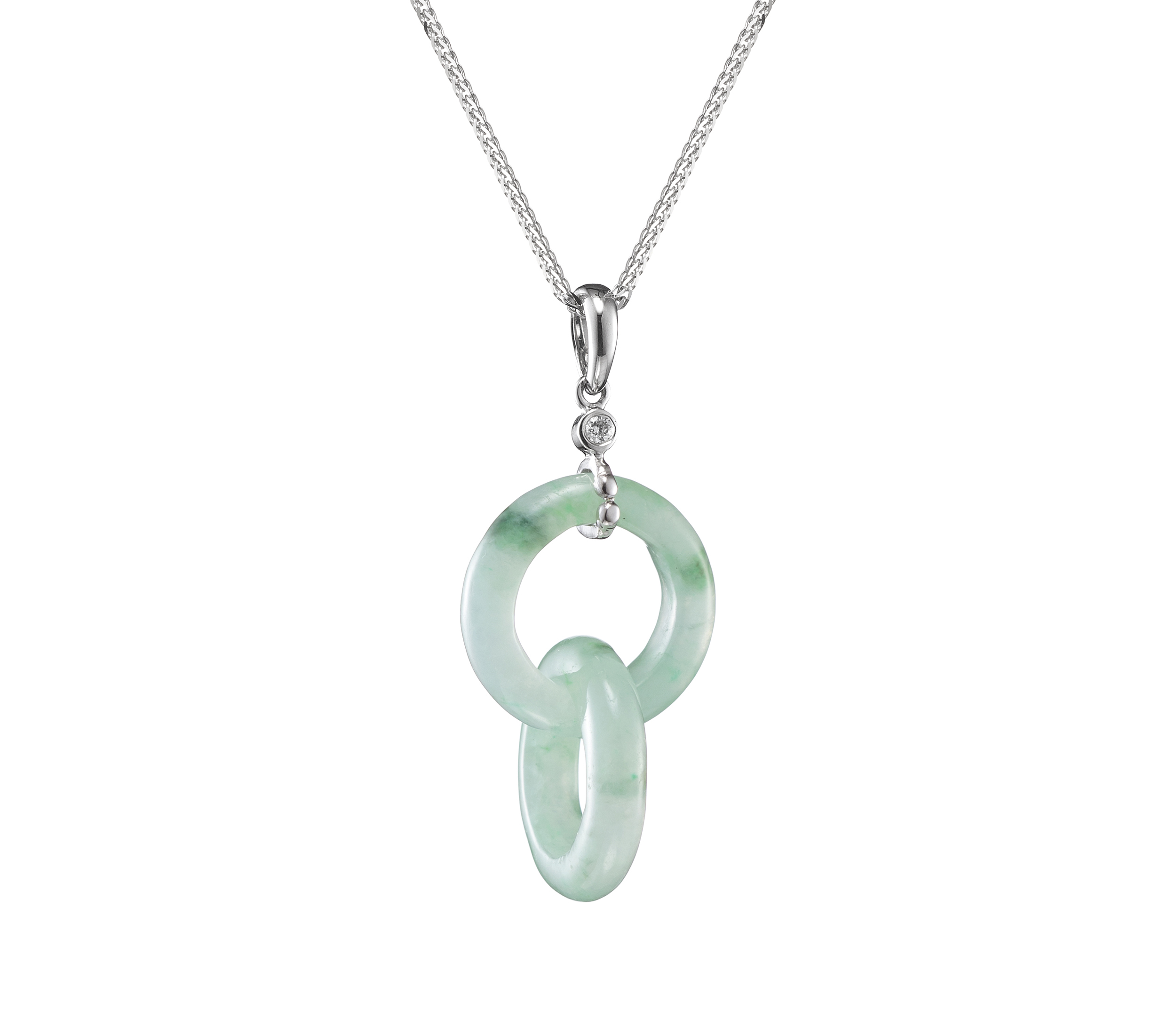 翡翠玉環,象徵著團圓、圓滿、完足的意象,而交串相扣的玉環,更添增了綿綿無盡的旨意。【清韻】系列,不僅呈示了形與色的美好,也具足了圓滿永久的幸福寓意,此外,在翡翠工藝的層面,更是有著獨特之處:這類交串的玉環,並非由兩個或多個玉環所組裝而成,而是經過作玉者的慢工細活,審慎度量,再施以精密的手藝,才得以征服翡翠的硬度,點點滴滴的鑿穿、琢透一整塊玉石,使之化作靈動且輕盈的交串式的玉環。