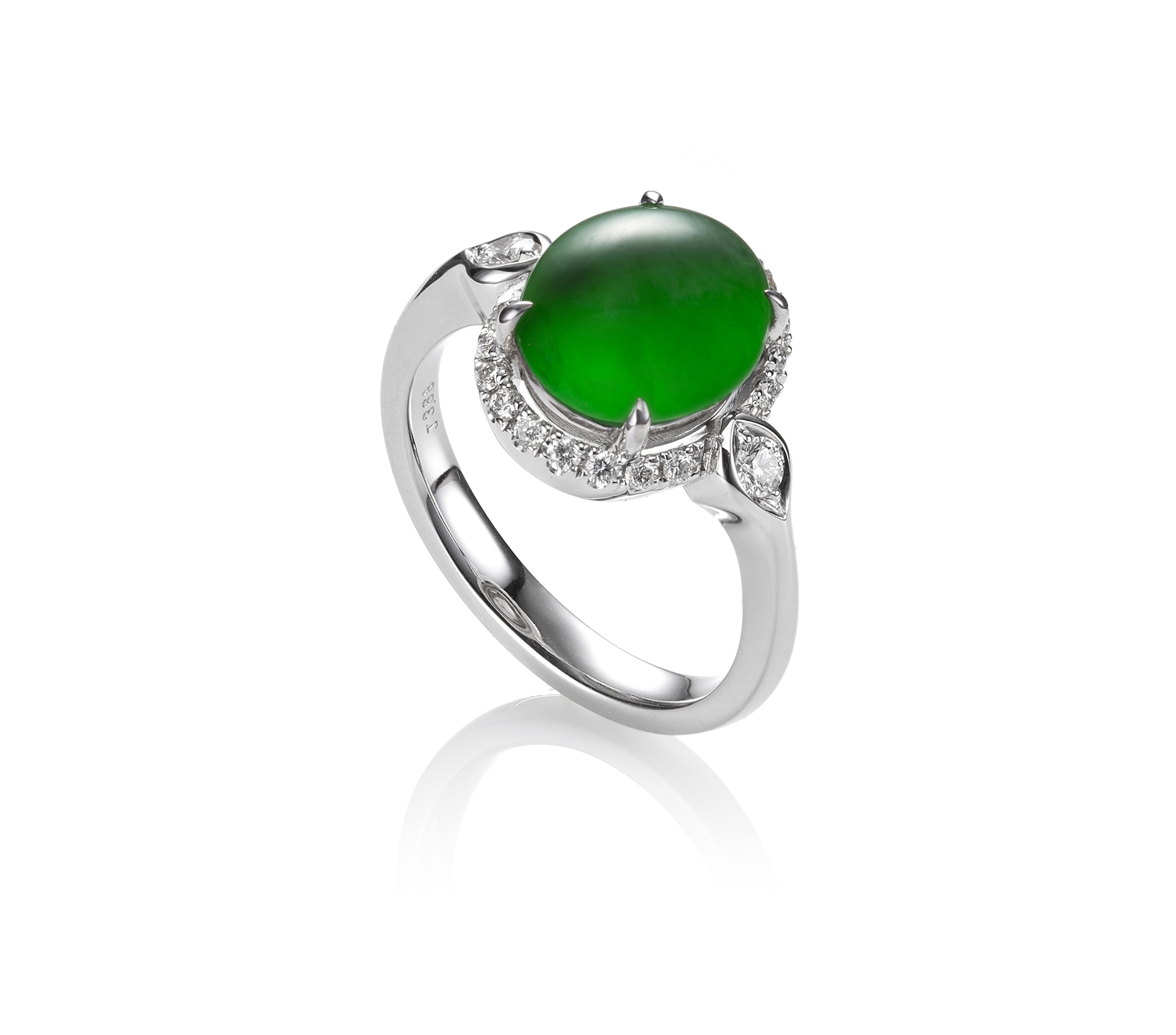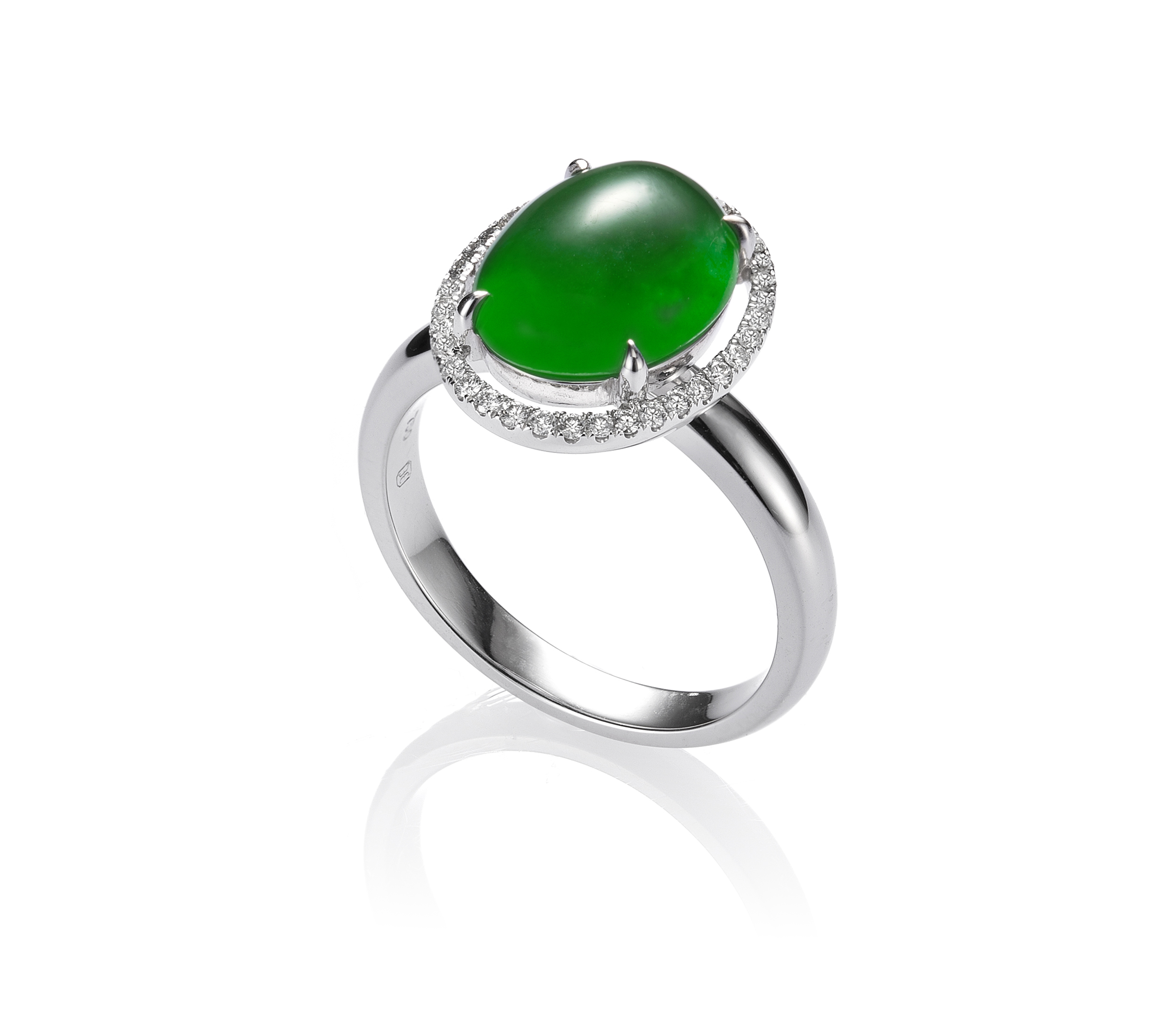 翡翠的晶體結構,很細緻,將其琢磨為蛋面,光線穿透其間,尤能呈現通透效果。蛋面翡翠,經由光線的反射和折射,映現清瑩水潤感,玉色的靈氣風采,煥然釋放,輔以簡約設計,再襯以燦鑽,脫俗之美,令人定睛不移。