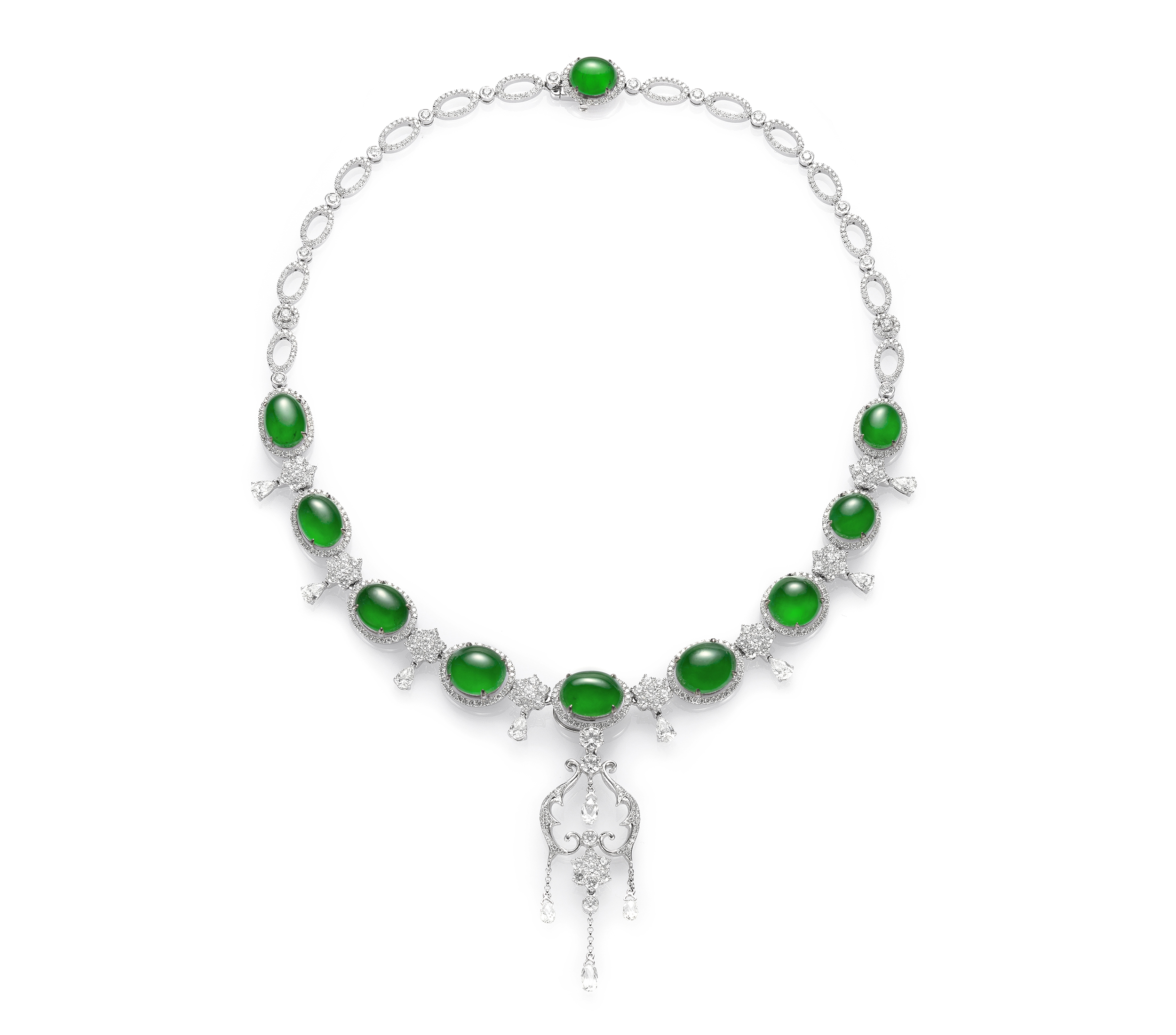 頂級翡翠珠寶套組,款式包括套鍊、戒指與耳環。玻璃種蛋面翡翠鑲鑽套鍊,主石質地勻潤,色澤濃綠,美得靈性迷人,搭配圓形與梨形鑽石,氣韻之優雅,令人屏息,設計與鑲嵌,細節分寸,皆拿捏得宜;同樣是玻璃種翡翠的蛋面鑲鑽戒指,同樣搭配著圓形與梨形鑽飾,兩相交映,更加映襯了玉色的精采與深度;而蛋面翡翠鑲鑽垂墜耳環,玻璃種主石,質色靜謐溫柔,襯著鑽石的燦燦光亮,搖曳閃動著嫻雅的氣質。