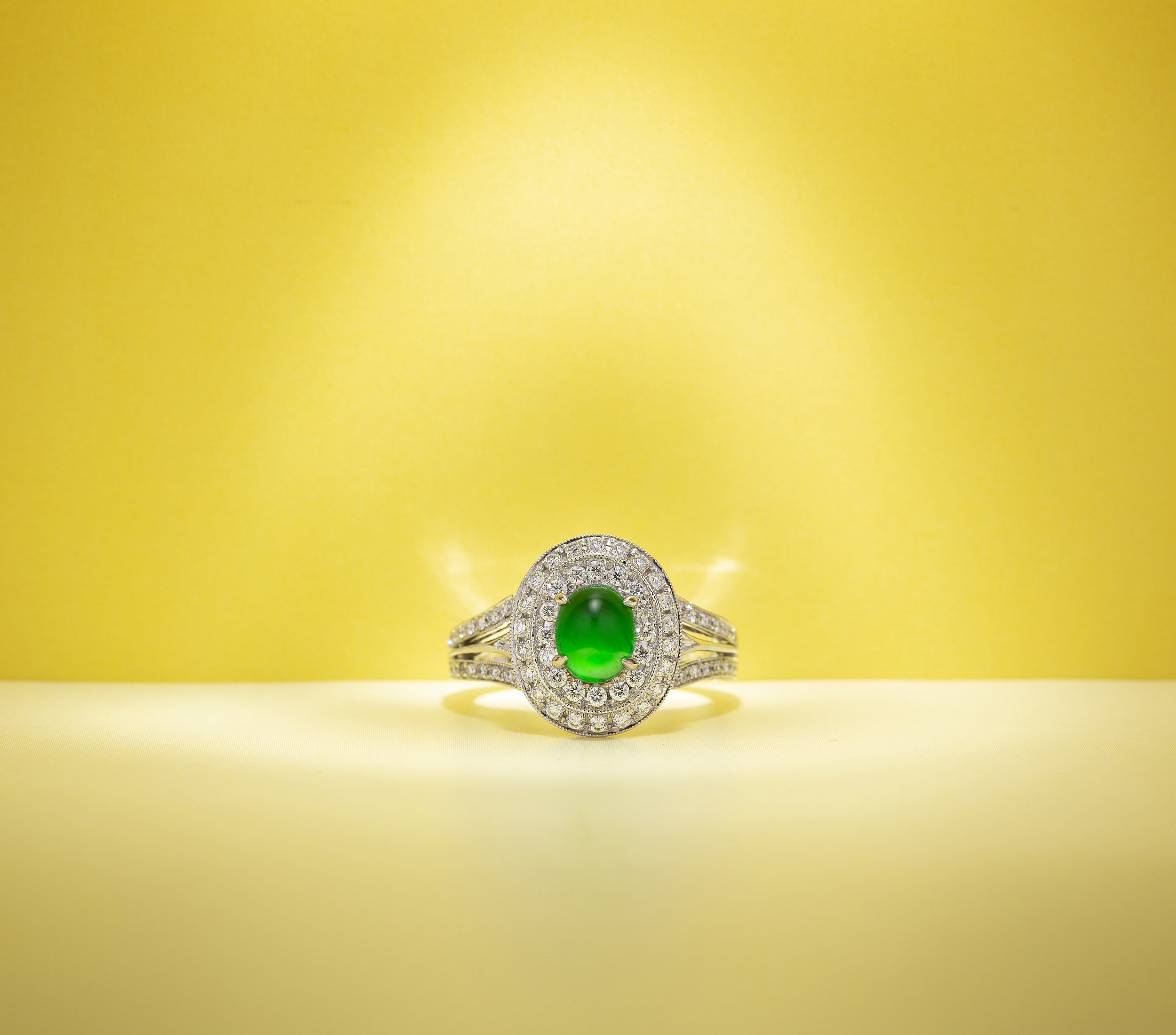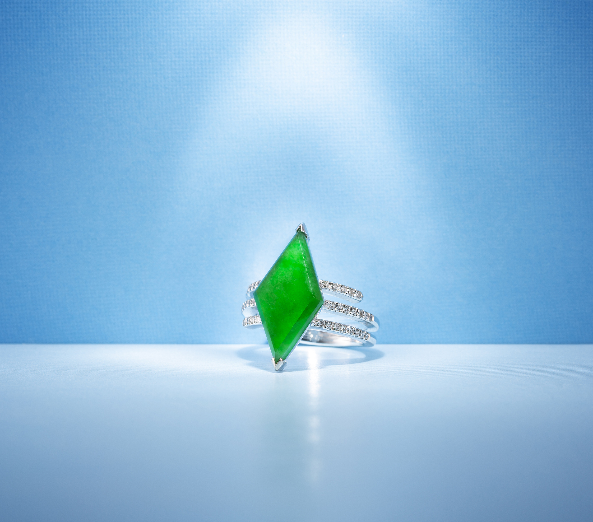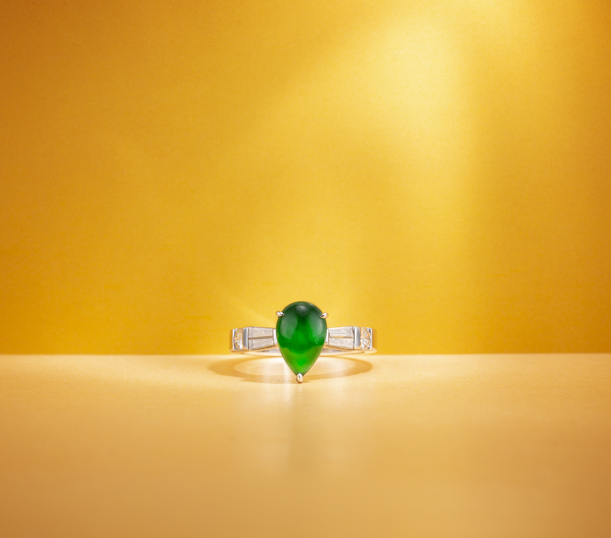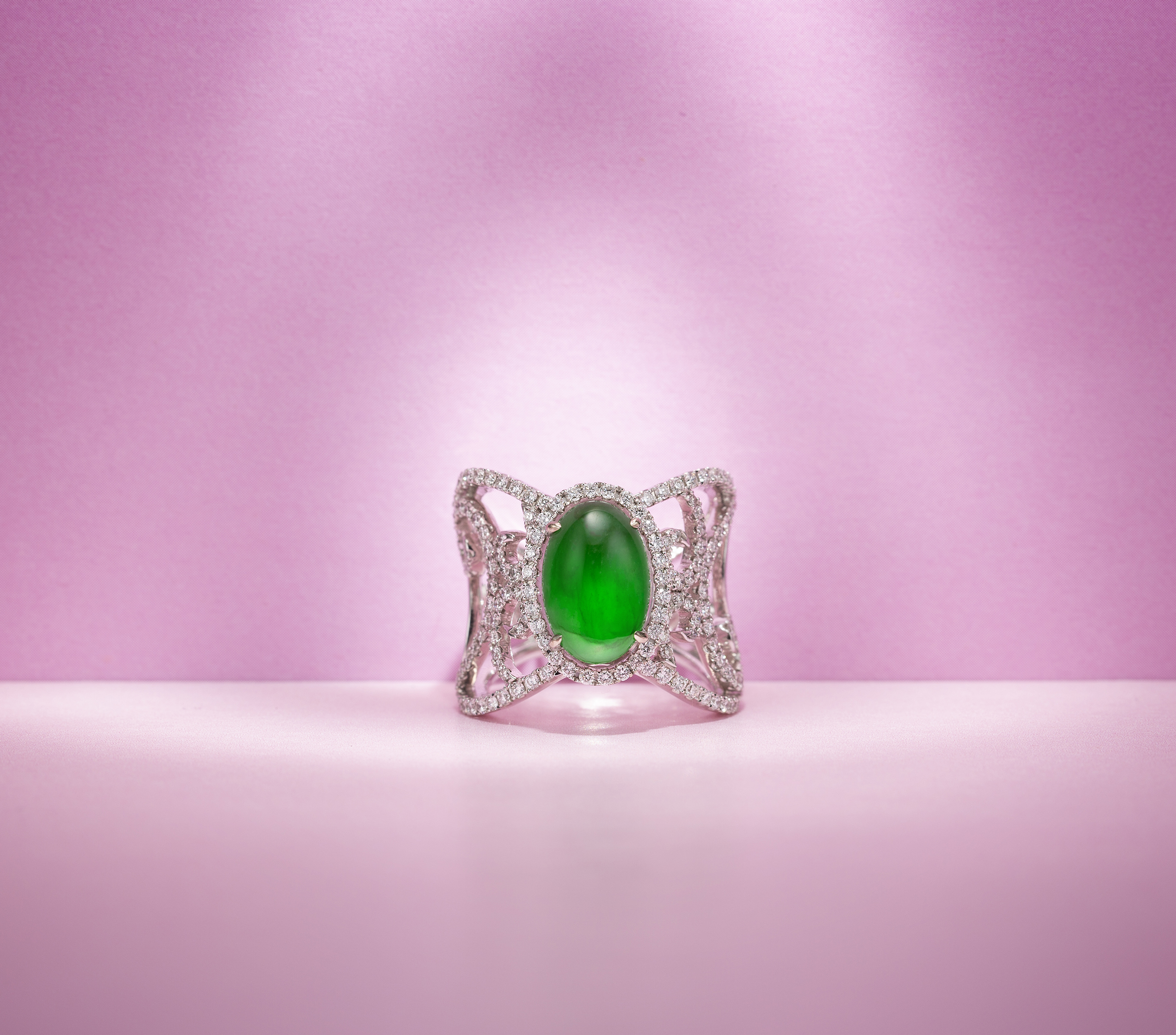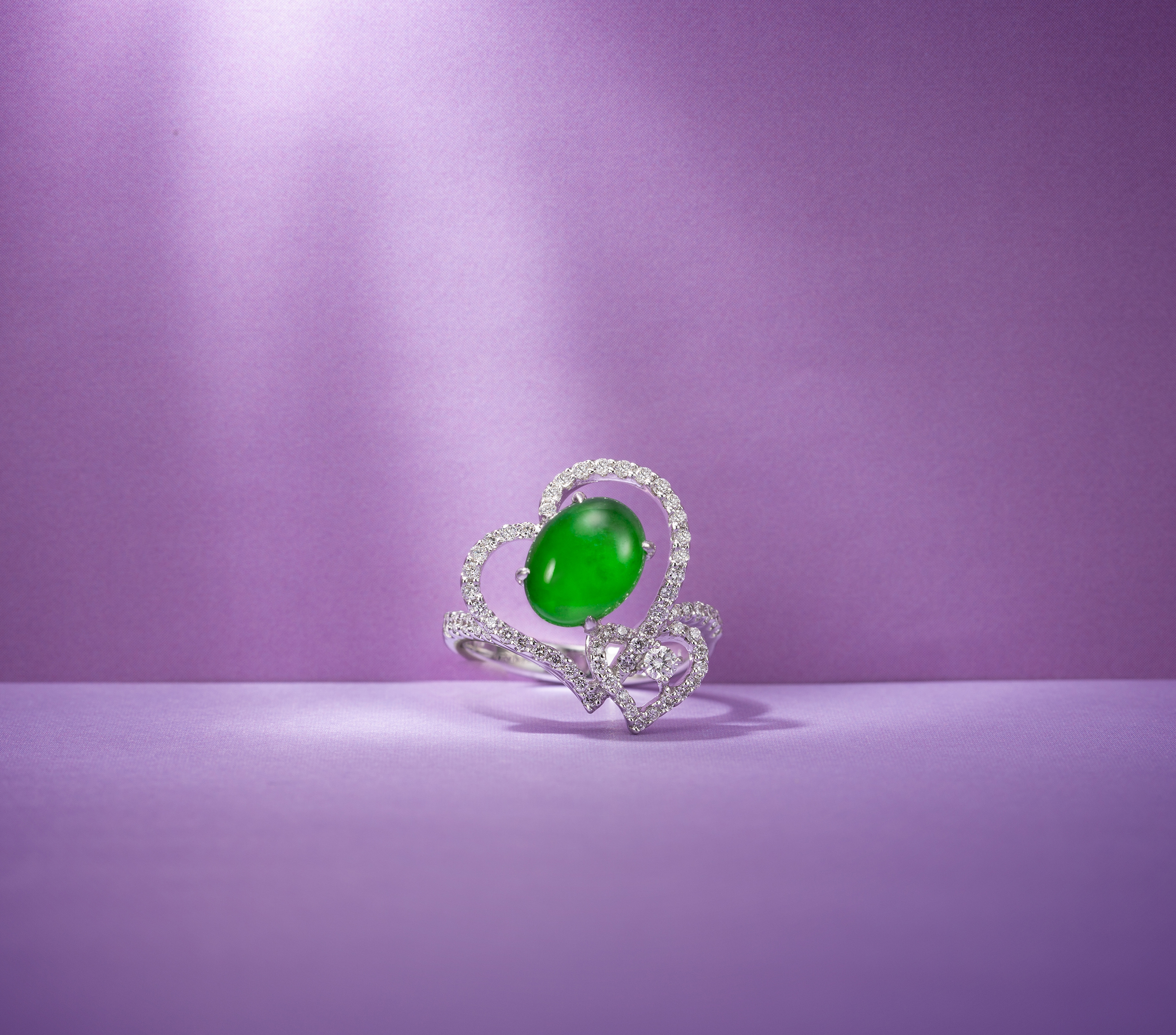 此六款精品翡翠戒指,分別以蛋面、水滴、菱形等為主石造型,融入巧致、新穎的設計理念,再結合細膩的鑲嵌手藝,成就為各具風采的指間精品。蛋面主石,玲瓏圓滿,映現玉光,依隨設計手法的不同,呈現不同風格,可以貴氣,也可以浪漫;水滴形主石,有大自然的凝露之美,醞釀的翠意,別有靈性,彷彿有著時間的重量,時時刻刻都是智慧;菱形主石,展現犀利明快的個性,尤能詮釋伶俐又聰穎的自信美。