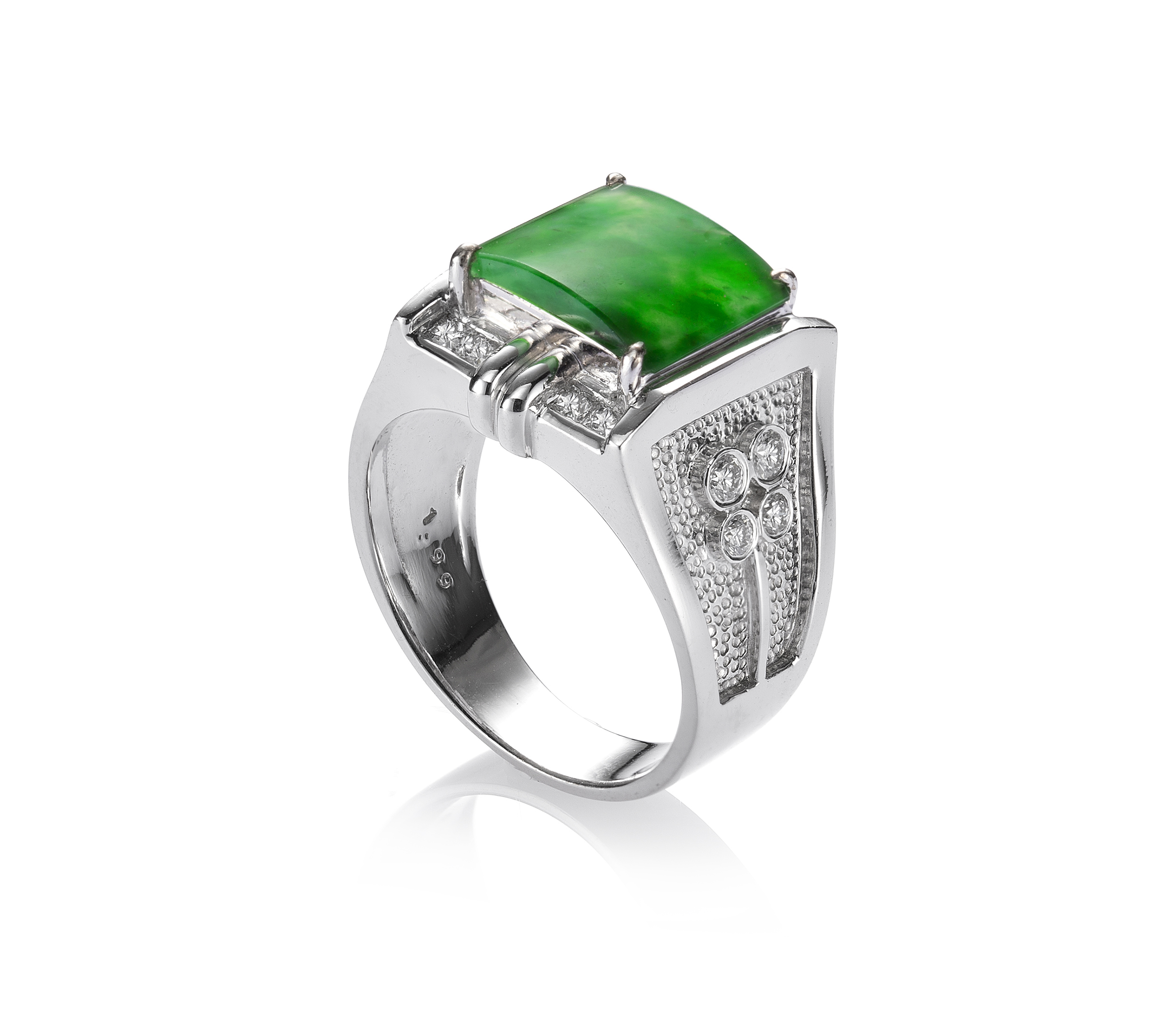 另有一款翡翠方戒,亦融入幾何概念,方形主石,質地溫潤青盈,透出自信光采,戒身的設計,獨具創意,展現俐落的時尚感,而時尚之中,又有近似科技感的新穎精銳,散發出一股初生之犢不畏虎的勇敢與奮起。