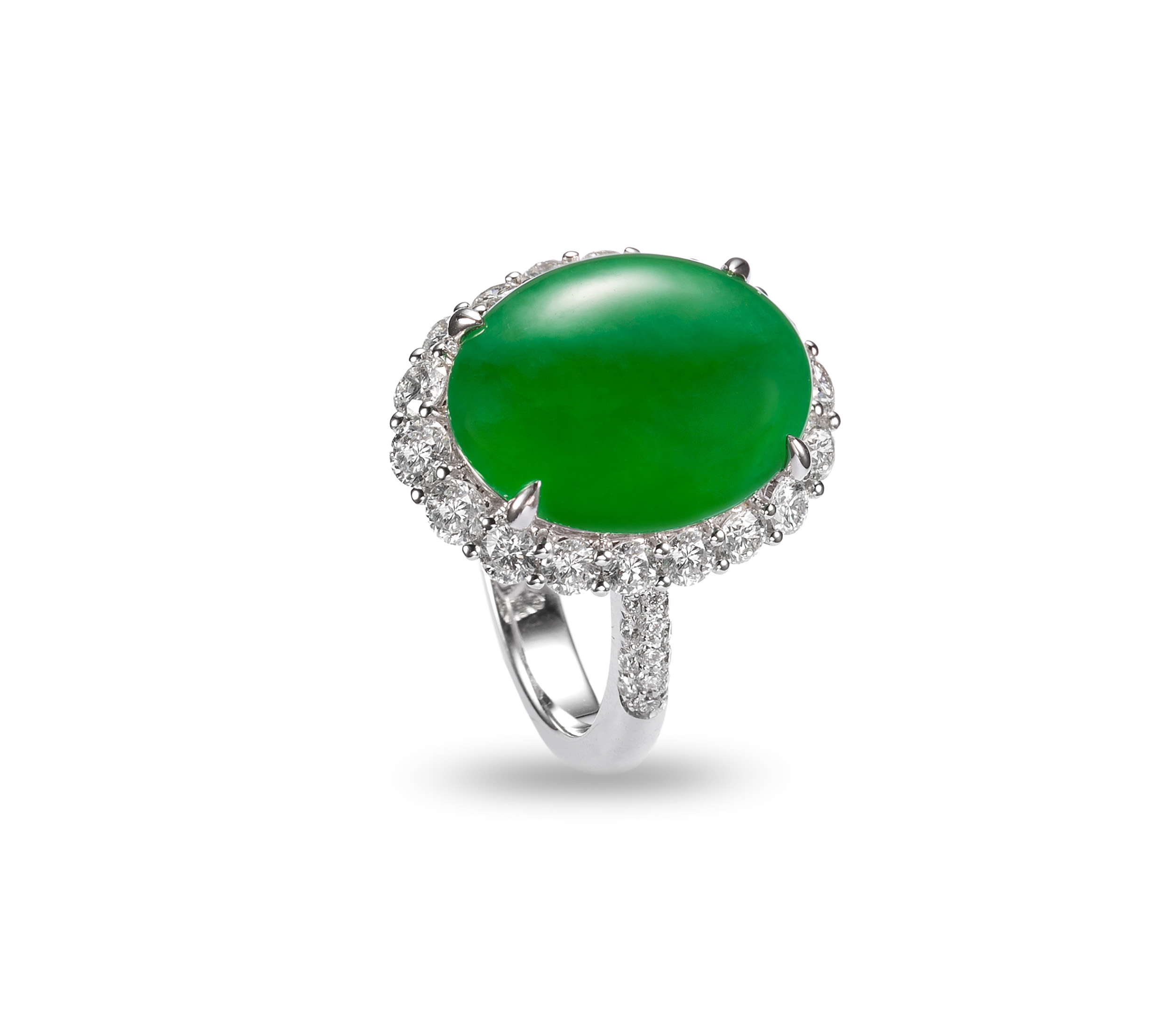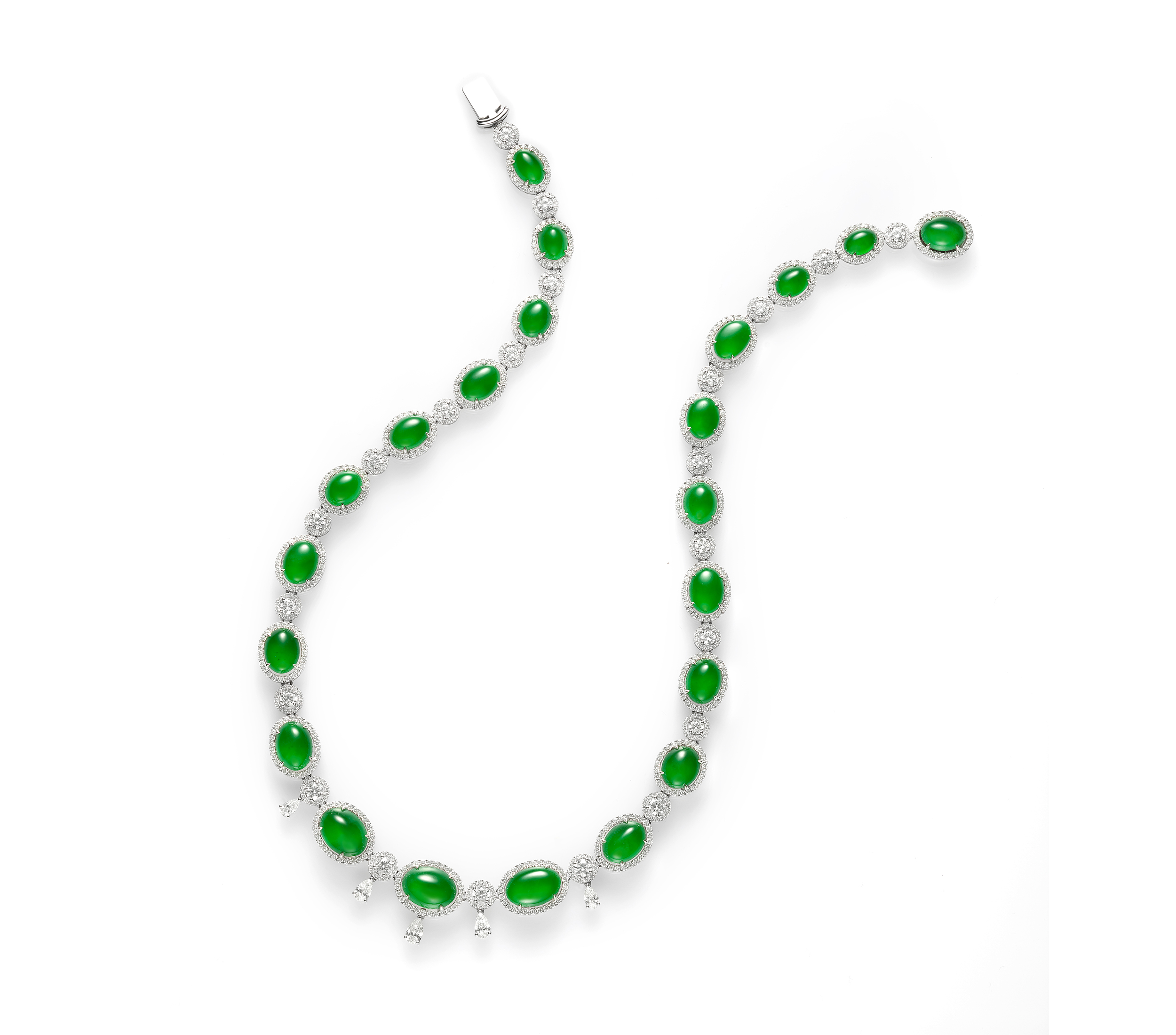 蛋面翡翠鑲鑽套鍊,質地溫透,水潤青盈,二十二顆完足飽滿的蛋面主石,搭配質優燦亮的圓形與梨形鑽石,在精湛細膩的鑲嵌工藝下,成就為清亮耀目、華貴非凡的珠寶大作。經典的翡翠套鍊,不僅昭然展現雍容大度之美,玉質本身的人文意蘊,更深化了珠寶的精神與韻致。