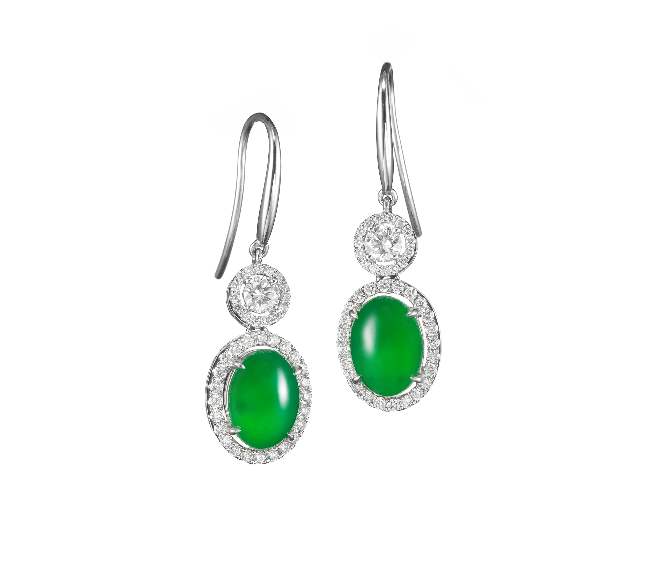 另有翡翠鑲鑽耳環與戒指,蛋面質色,勻潤濃郁,盡顯翠玉的通透之美,襯以璀璨鑽石,既嬌柔,又清豔,設計與鑲嵌,精湛細膩,脫俗的韻味,自內而外,散發出獨一無二的靈氣神采。