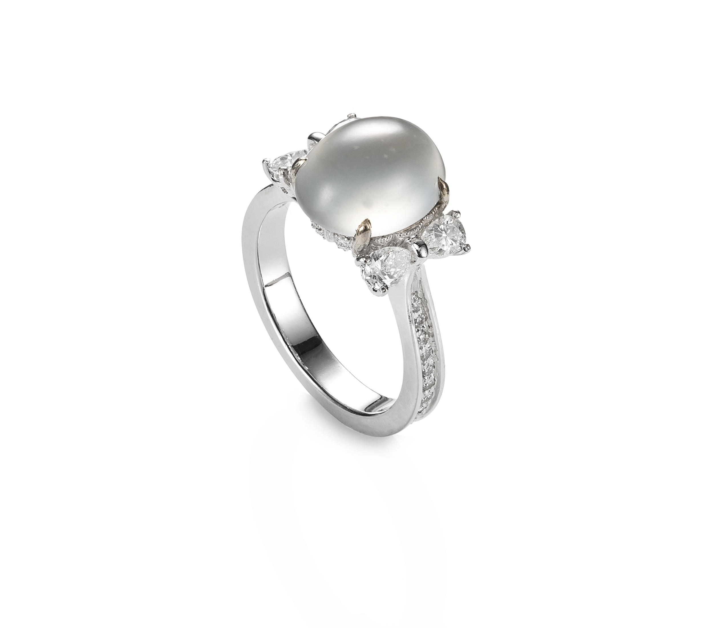 白色翡翠,質地清透似雪,玉色澄淨無瑕,象徵著純潔、高貴與優雅,經典的蛋面造型,薈萃溫潤玉光,不凡的韻致,有別於千篇一律的婚禮珠寶主調,以典雅脫俗的品味,點出美的真諦。