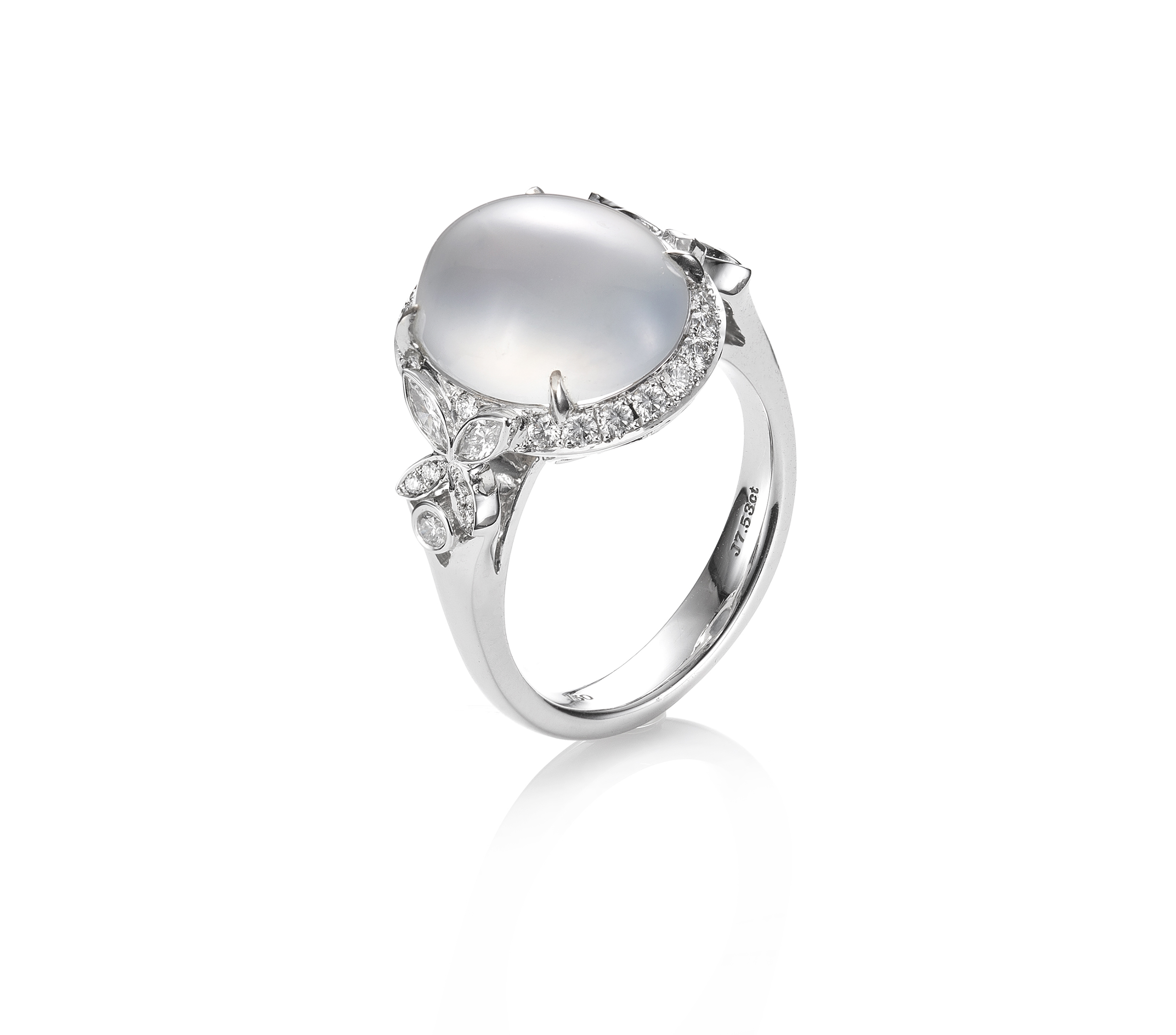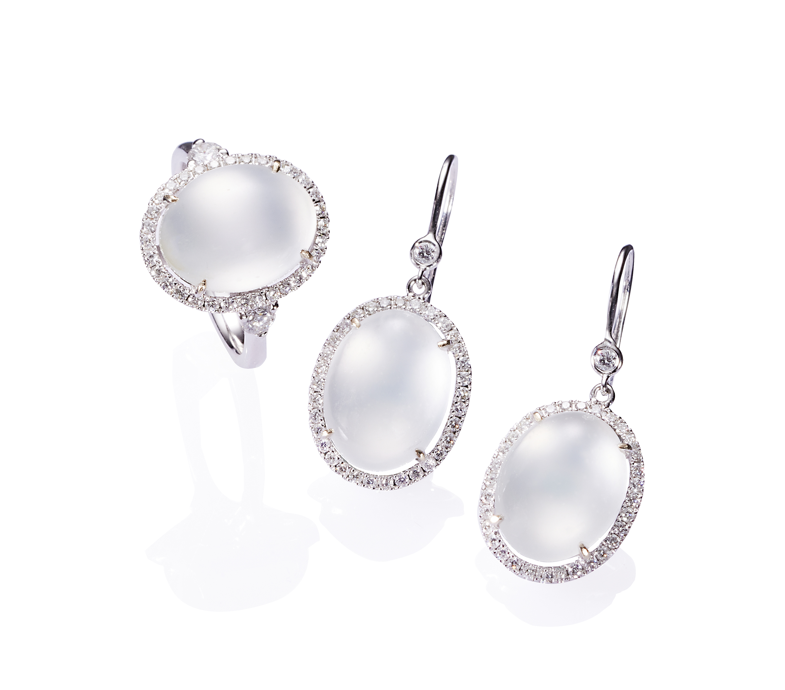 白翡婚禮珠寶系列,以戒指與耳環為主要款式,選用蛋面白翡為主石,融合不同的設計思維,有分量感十足的經典大蛋面,展現雍容大度的非凡氣質,亦有玲瓏小蛋面,聚攏為花之盛綻,清靈又嬌俏,格外的秀麗漂亮。