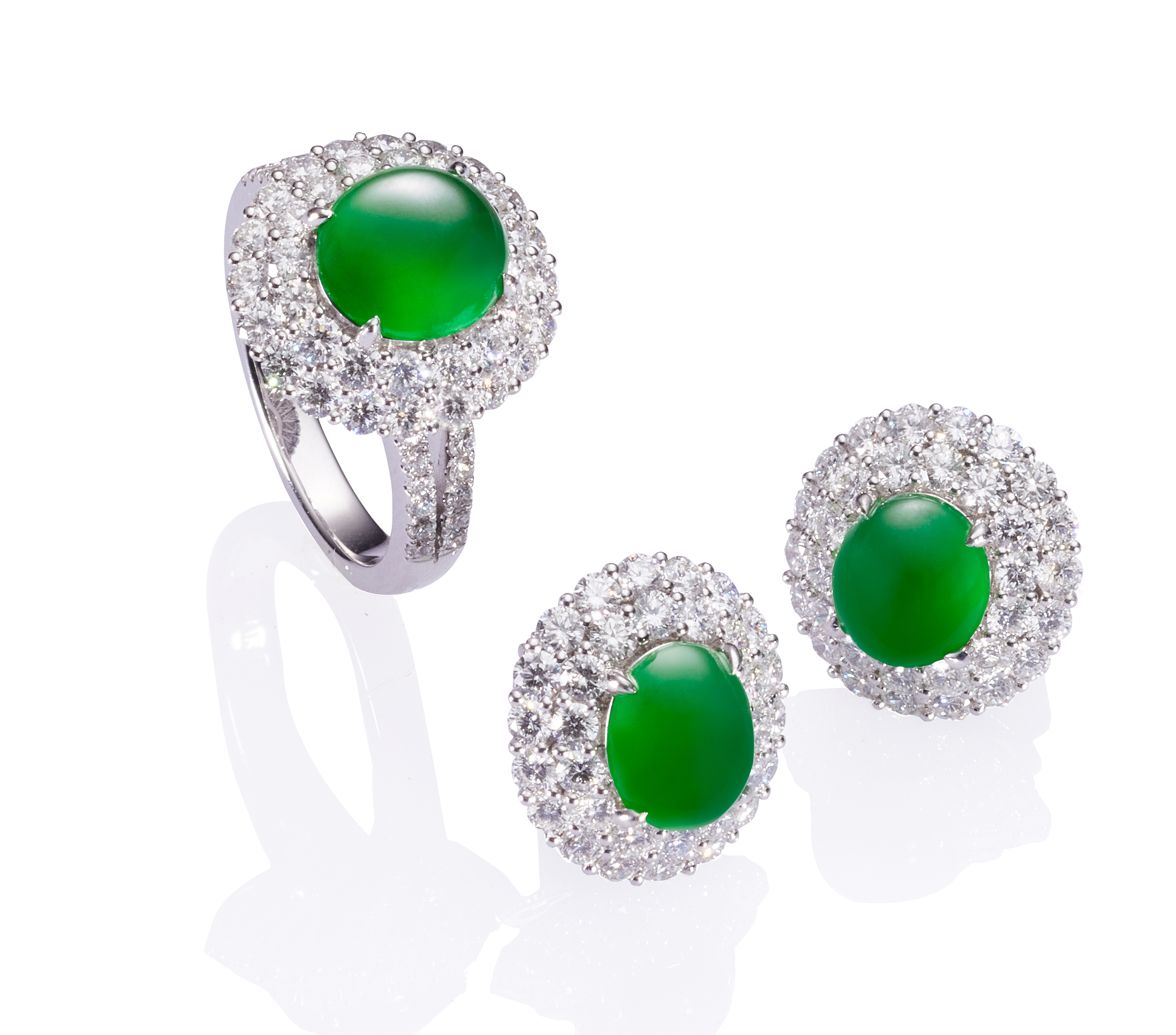 JADEGIA玉世家2023秋季新品珠寶,特別推出一款蛋面翡翠耳戒套組,以蛋面為主石造型,勻潤通透的翡翠質地,搭配璀璨圓形鑽石,精湛的鑲嵌,簡單且優雅的設計概念,在耳畔,在指間,展現令人驚豔的典雅與雍容。