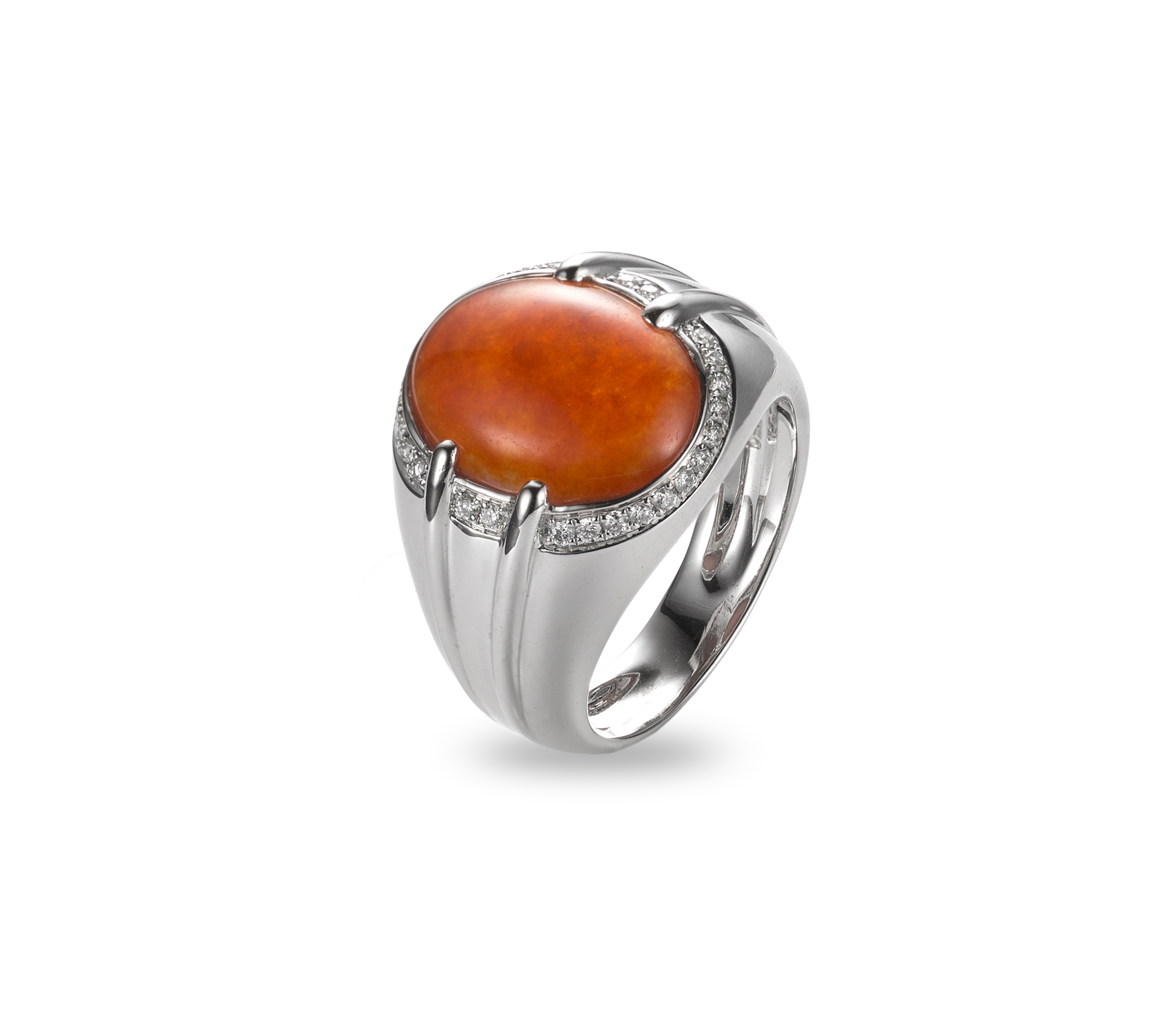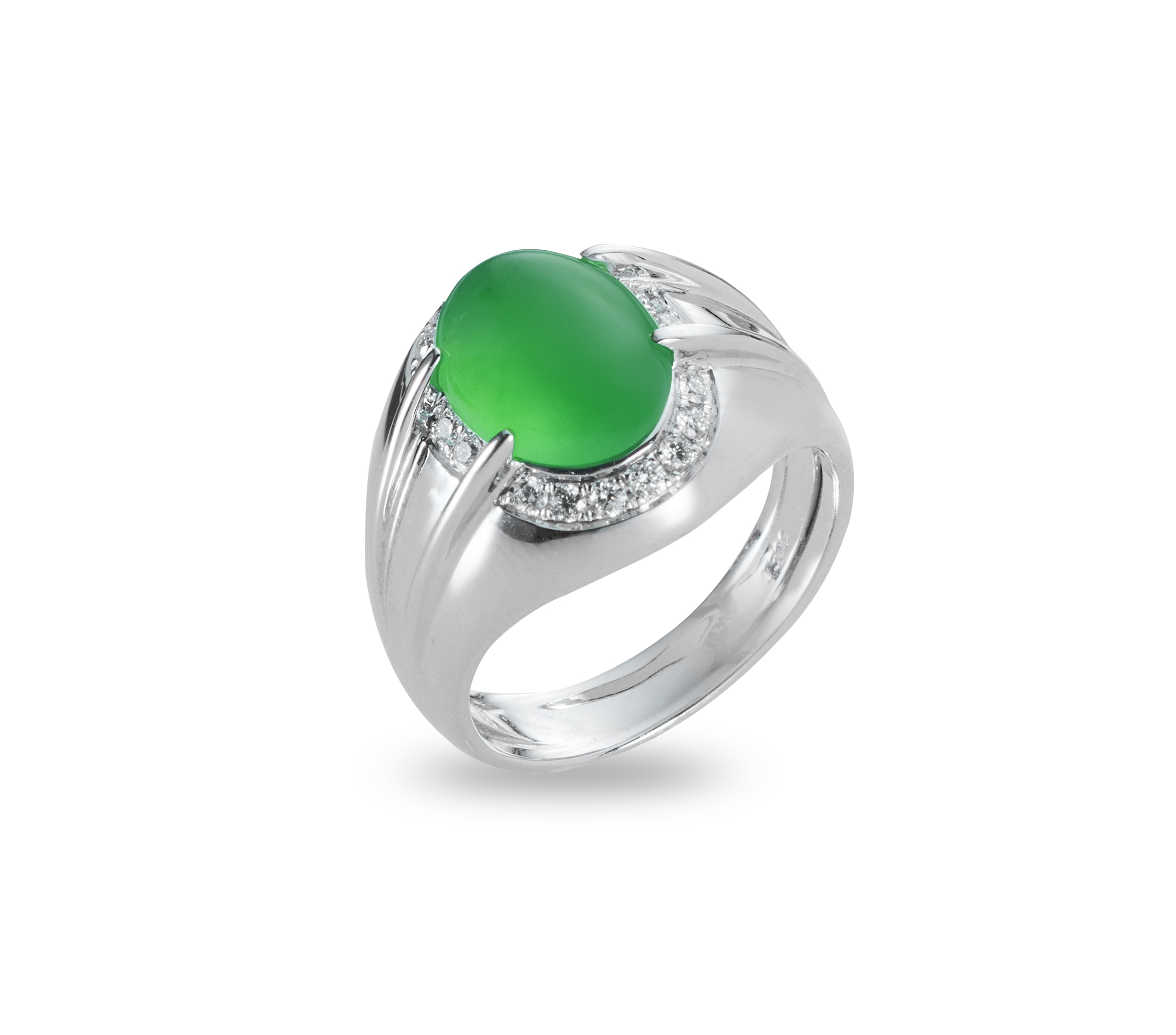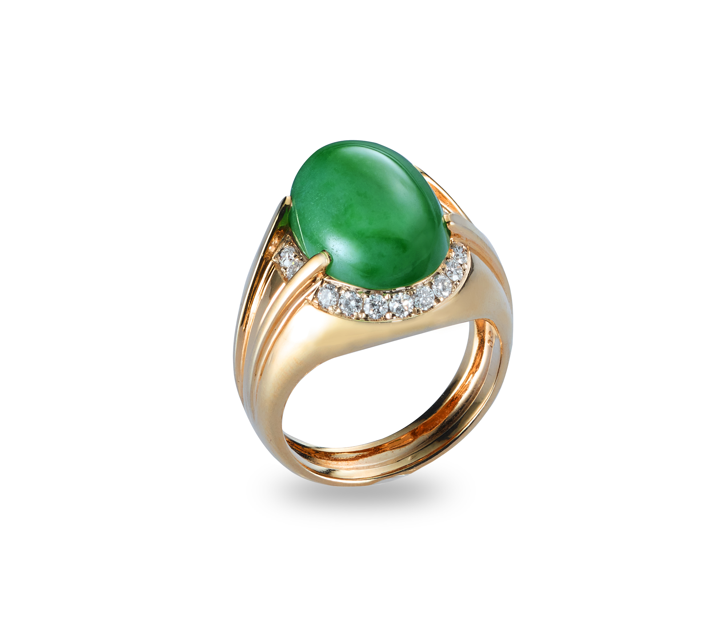 本系列的設計美學,簡潔凝練,帶有一種沉穩內斂的風格。經典的蛋面造型,呈現翡翠質地的溫潤瑩透,主石周圍,鑲嵌著燦亮鑽飾,更添光采,寬版的戒身設計,並行著雙軌線條,對稱又流暢的線條,傳述著優雅、雋永的氣息。