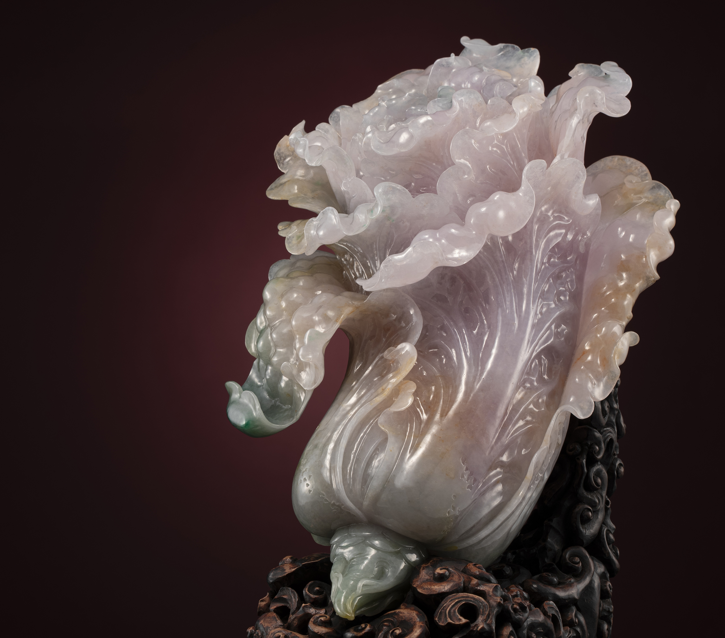 第一展區,以「翡翠珠鍊」與「紫玉白菜」起首,呼應著翡翠在歷史舞臺的初登場,亦同時映顯玉世家既承續又思變的玉作實力。上等的玉材,精湛細膩的鑲嵌,乃至俏色巧雕的高妙手藝,更關鍵的,是對於翡翠玉作的新創思維,此類思維的展露,以「道法自然」系列為代表,無論是薄透鏤刻的工藝、幾何造型的崖壁幽蘭、目光睥睨的鳥禽動態,乃至以堅硬玉料琢出竹編柔韌感的瓶簍,在在印證了翡翠工藝無盡寬廣的未來。