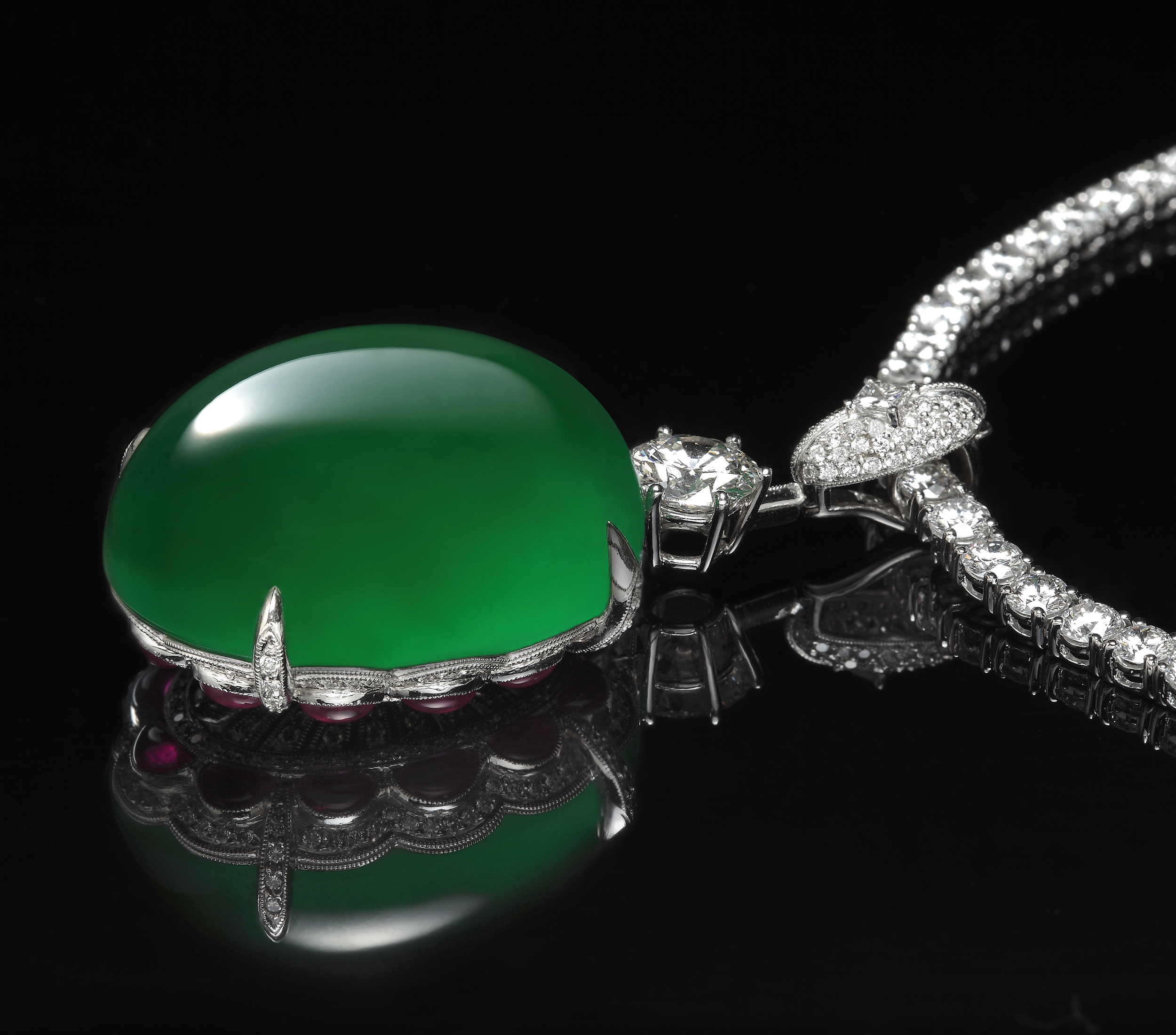 此區所展示的頂級翡翠珠寶,質地珍稀,鑲嵌細美,搭配DEF等級的鑽飾,華貴雍容。其中,一款翡翠大蛋面,尤其吸睛,質地勻潤通透,玉光熠熠,最是耀眼。