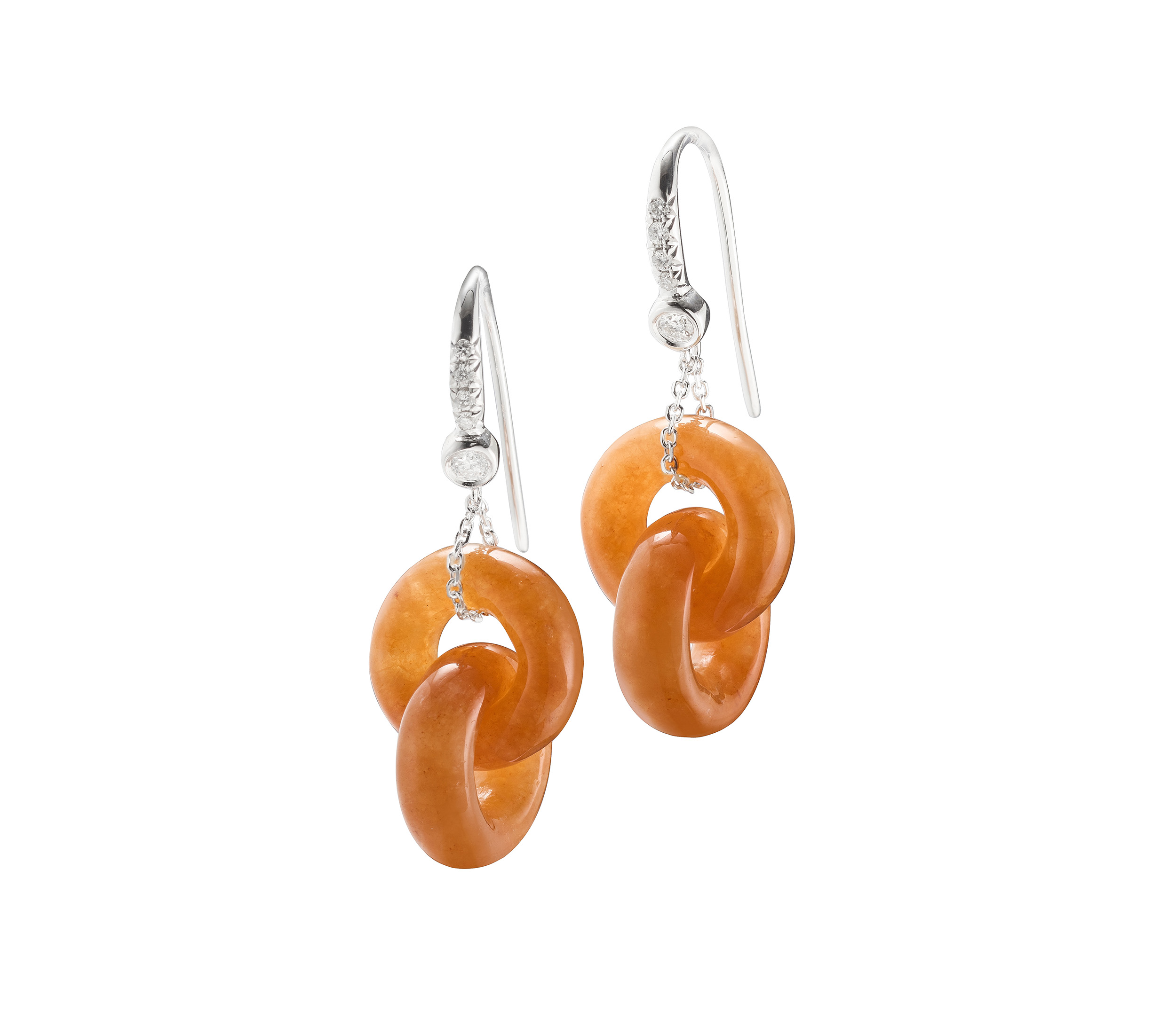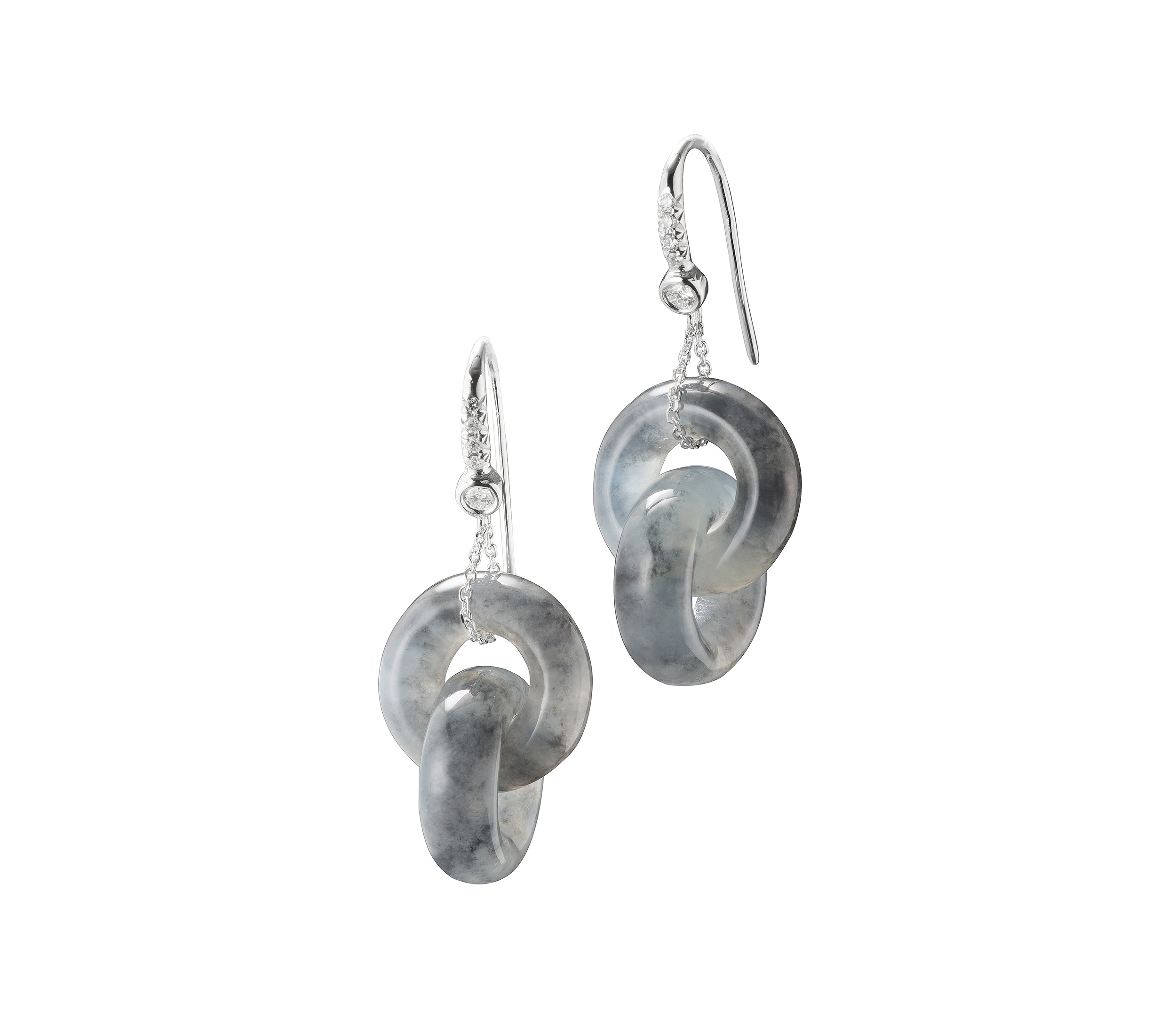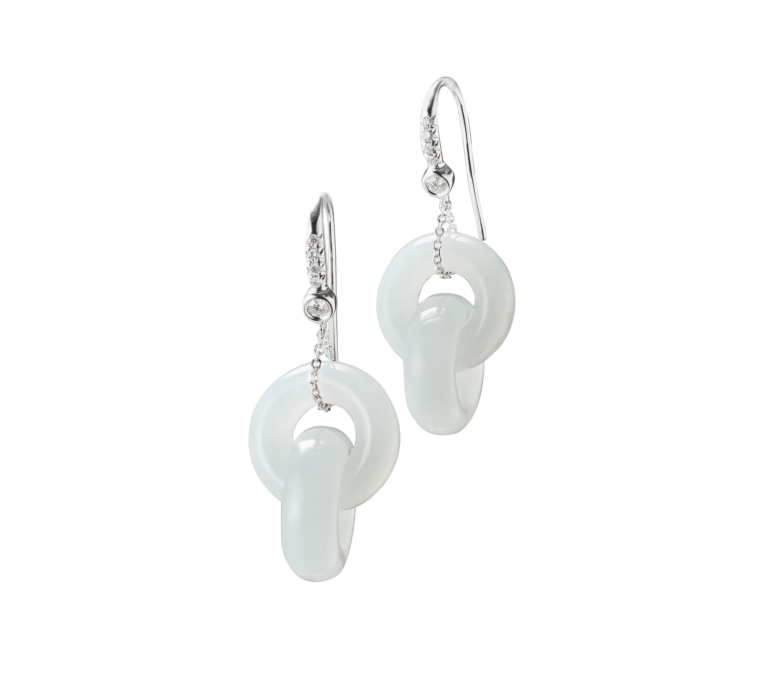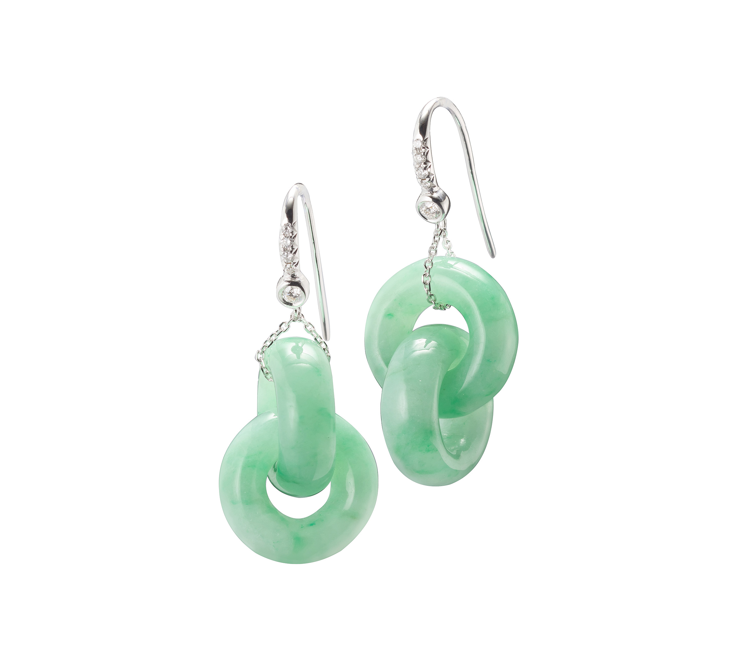 翡翠雙連環耳墜,以交串的玉環形制為主,它的琢製工法,展現了玉雕技藝的獨到之處:此類作品,並不是由兩個玉環所組裝而成,而是經過作玉者的審慎度量與慢工細活,施以精湛細膩的手藝,方能征服翡翠玉石的硬度,鑿穿並琢透一整塊玉石,終而打造出如此交串又靈動的玉環耳飾。