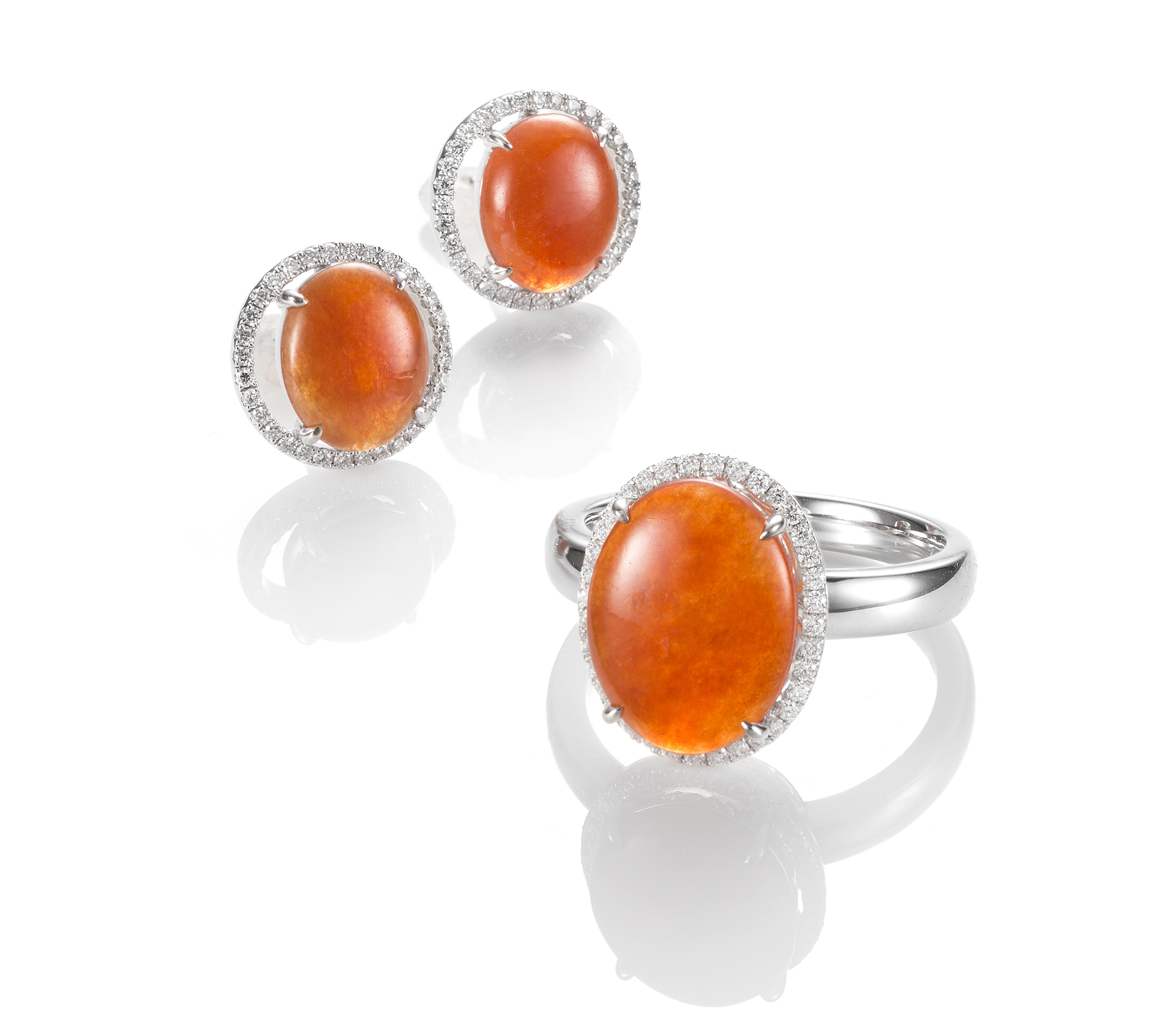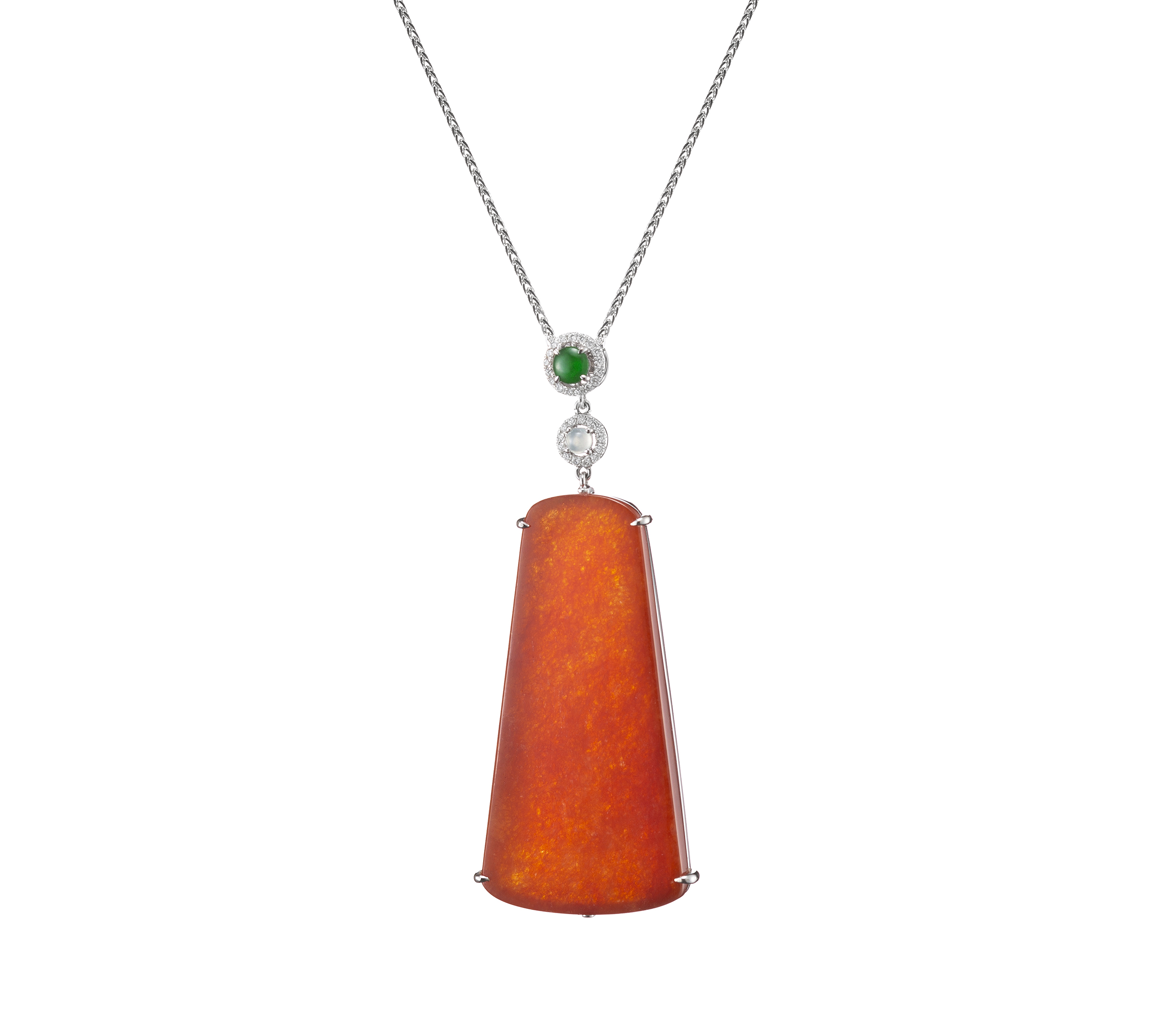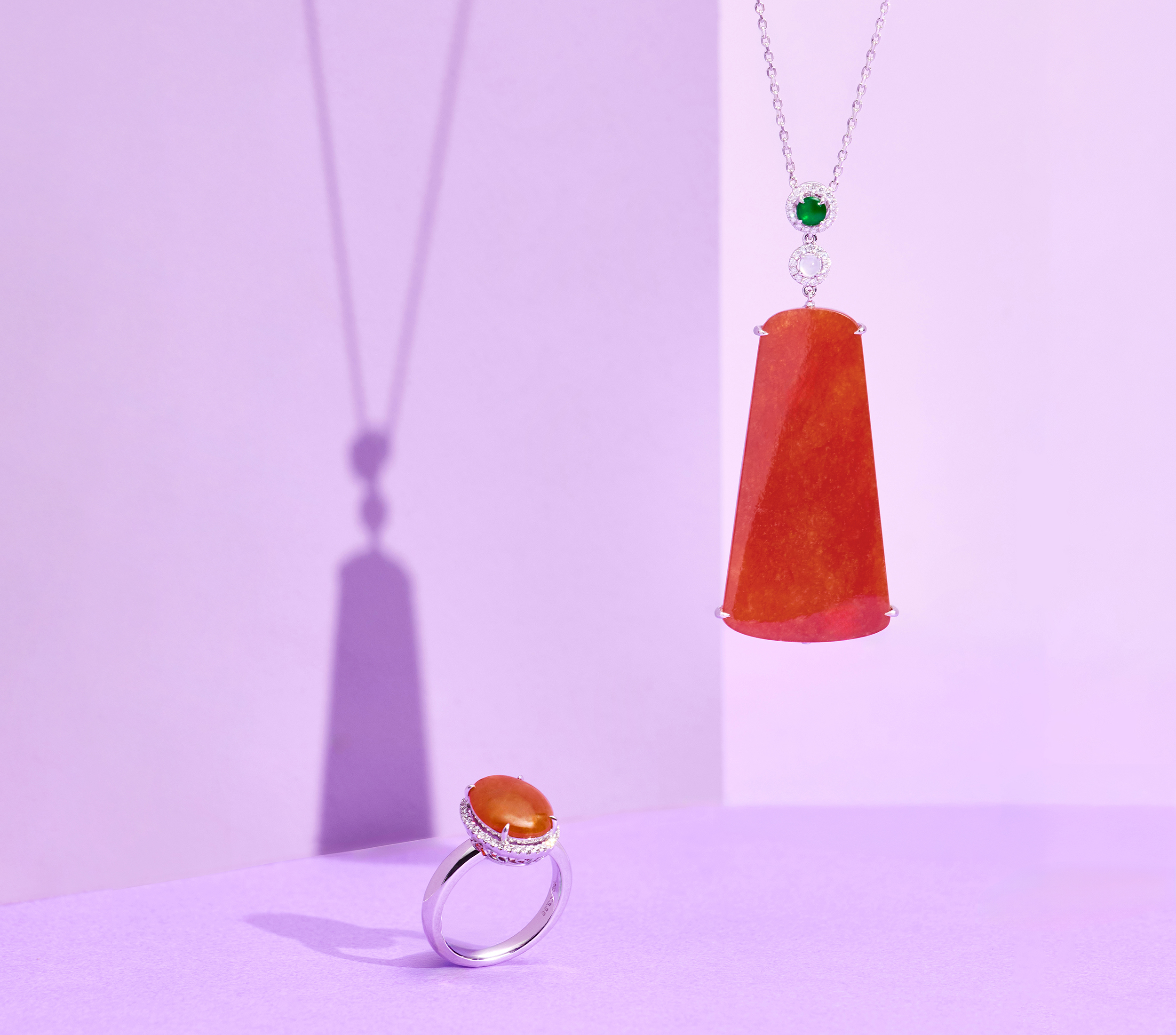 紅翡墜飾,質地溫潤,玉色嬌甜,滿蘊喜悅,簡潔的幾何造型,搭襯綠翠、白翡與鑽石,層次豐富,比例合度,線條俐落,融合東方韻致與西方時尚之美;而蛋面紅翡鑲鑽耳戒套組,主石的質色,潤澤嬌美,簡約的視覺造型,搭配DEF等級的鑽石,再結合精湛的鑲嵌手藝,將紅翡珠寶最燦爛的美麗全然釋放。