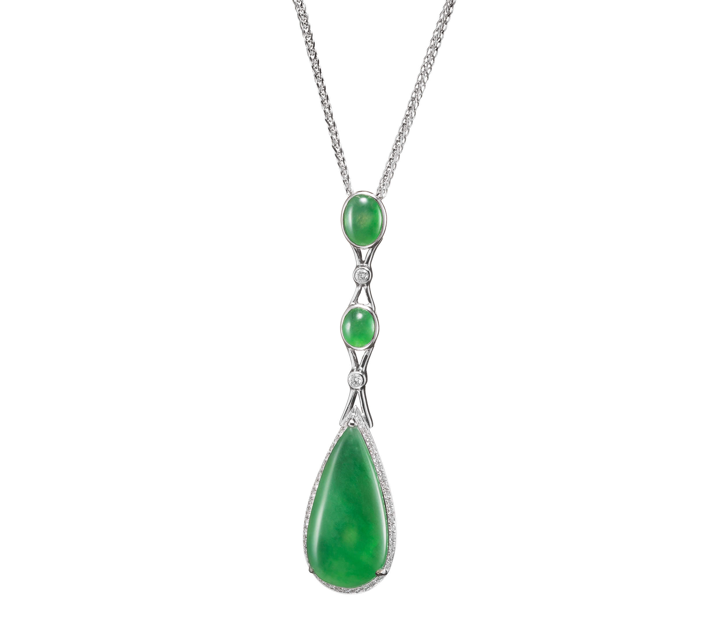 翡翠鑲鑽墜飾,比例合度,水滴、蛋面與鑽飾的配搭,彷彿節奏韻律,流暢之中又見變化。水滴形主石,薈萃著溫潤光澤,玉色甚舒雅,輔以蛋面與鑽飾,勾勒出纖巧且華貴的形姿意象。