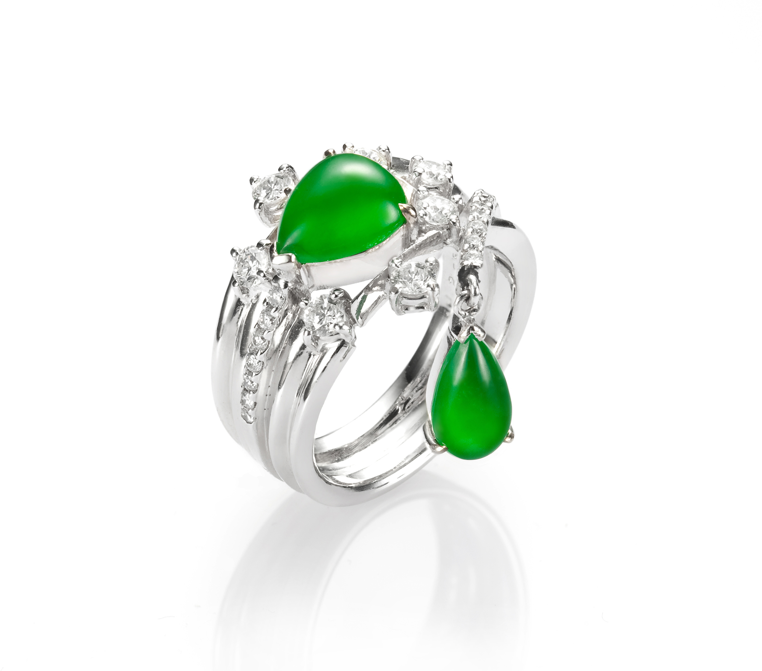 JADEGIA玉世家情人珠寶系列,將翡翠主石琢磨為水滴造型,寓示著涓涓滴滴的薈萃意涵。純粹的愛,涓涓滴滴的累積,相伴的誓言,日日月月年年傾訴,薈萃為永恆的浪漫詩意,愛的重量,美的重量,盡在其中。