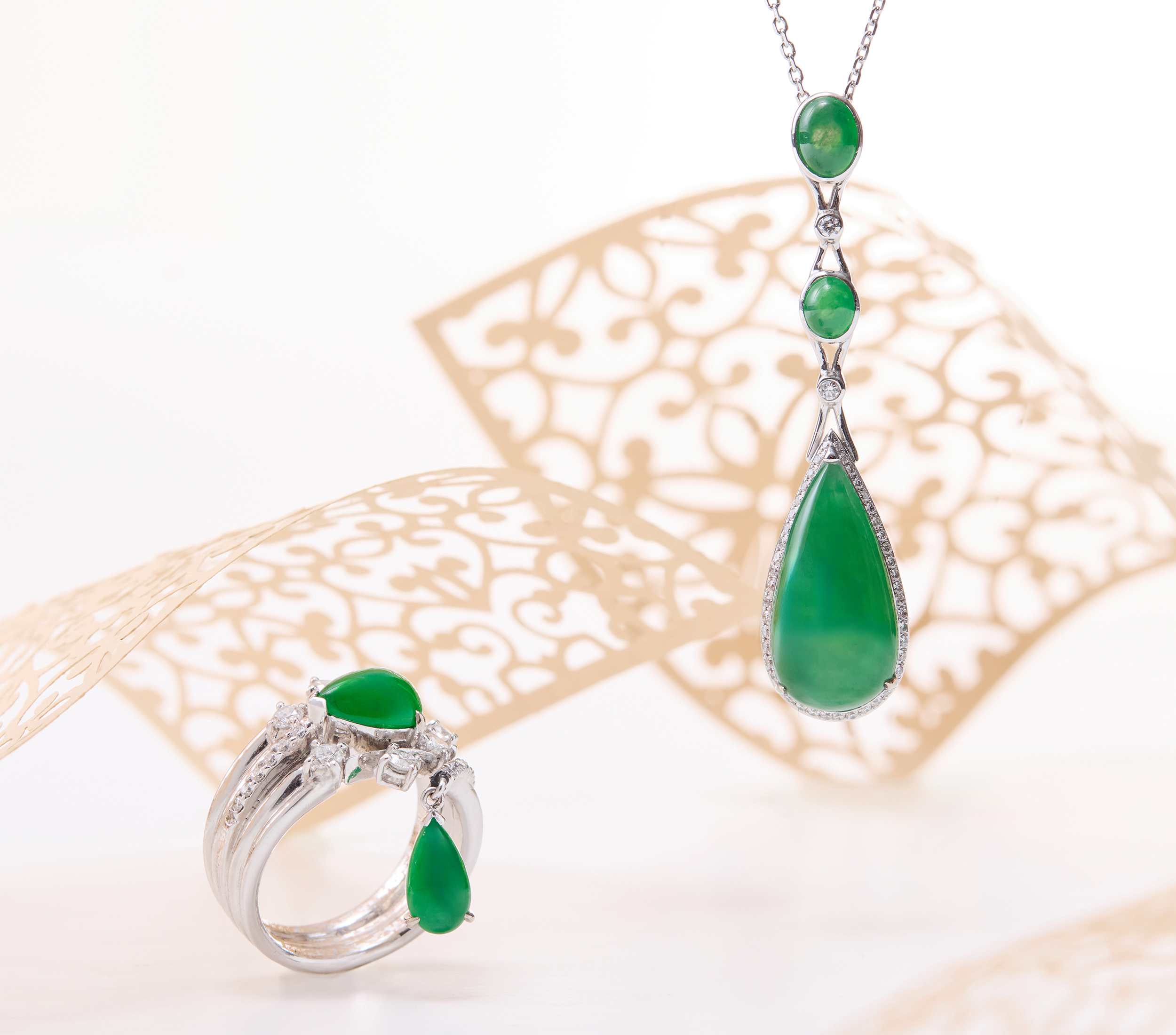此系列款式,包括了墜飾和戒指,玉石顏色,以最受青睞的綠翠為主。綠色翡翠,尤顯尊貴感,玉光翠影裡,藏著端莊深靜,也漾著靈秀煥彩。