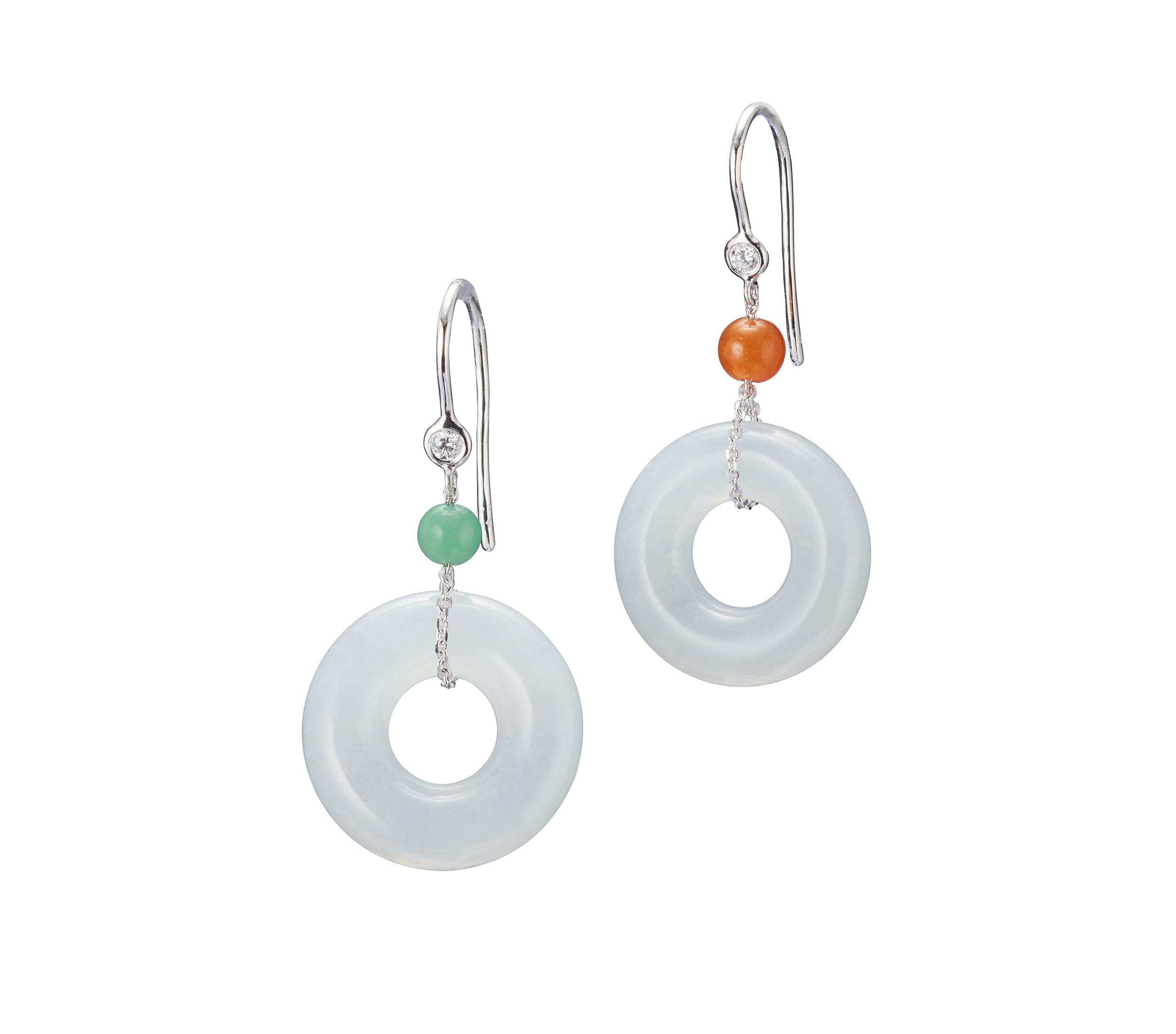 【小團圓】系列涵蓋墜飾與耳環等款式。JADEGIA玉世家設計團隊以經典圓環造型為靈感核心,選用白翡主石,並點綴綠翠或紅翡小圓珠,透過精緻比例與配色,形成柔和而富有層次的視覺對比。