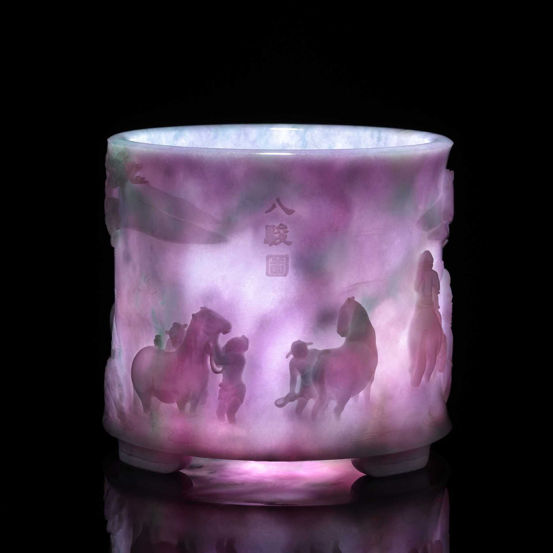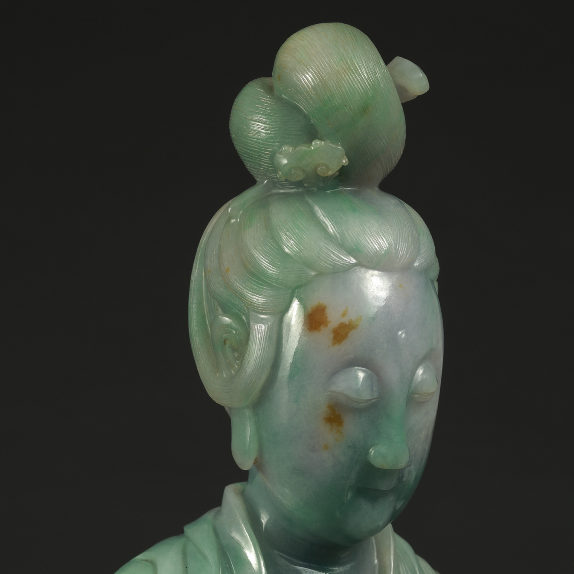 此次展覽,將特別展出清中期「翠玉魚籃觀音」,此作所選用之玉材,為極其珍罕的上等翡翠貢料,質地古樸溫潤,翠裡韻致,暖入人心,且其刻工刀筆細膩,具現含蓄與剛勁之美,觀音頭頂螺髮,法相慈藹,身披天衣,提挈魚籃,身段柔婉優美,是百年難得一見之大作。