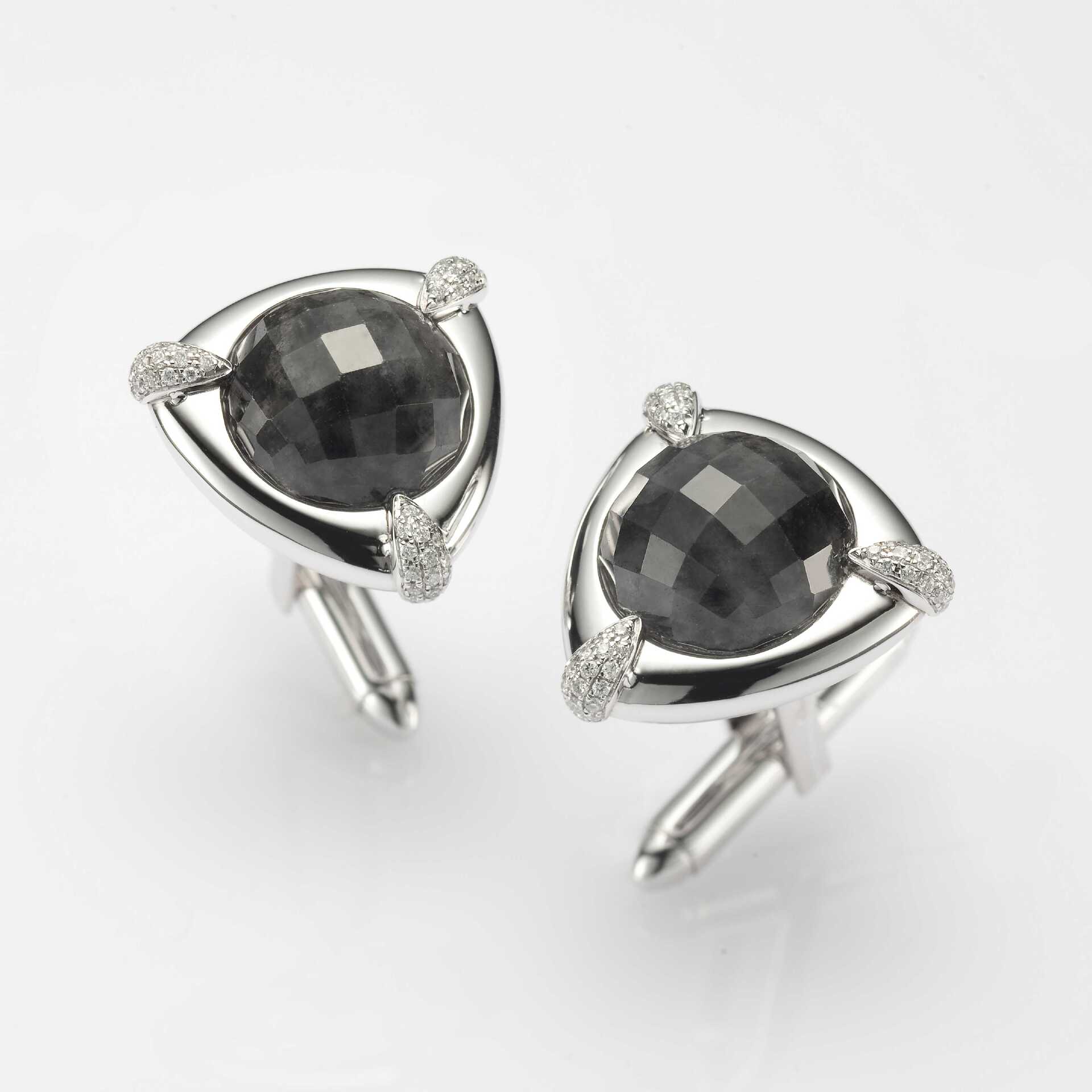 墨玉玉色,黝黑濃深,菱形切割面的表現手法,跳脫傳統形制,更隱喻著以不同視角觀照世間起迭的智慧目光,搭配俐落簡練的美學設計,並輔之以燦亮鑽飾或紅寶,更添經典氣度。由是,內蘊與姿態,遂能於談笑揮袖之際,盡顯領袖瀟灑風範!