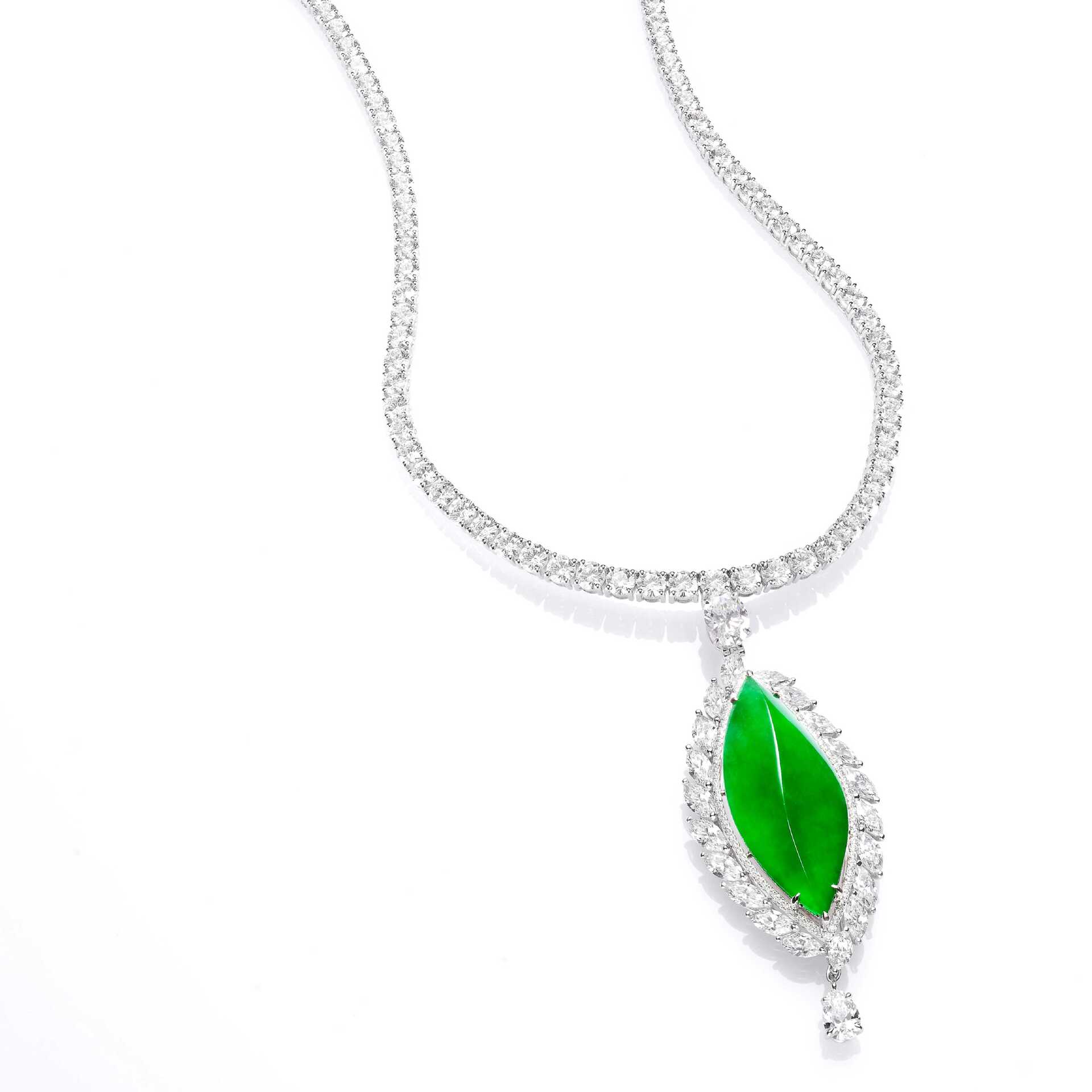 春意盎然的午後時光,伴隨著柔和愜意的悠然豎琴樂音,一場別俱人文氣息的珠寶饗宴正拉開序幕。婚後定居新加坡的玉女天后楊采妮,身著一襲純白色長禮服翩然步入會場,展現自信高雅的女神風采;頸上配戴JADEGIA玉世家頂級珠寶系列馬眼形翡翠鑲鑽墜飾,玉色艷綠清透,如優雅身形曲線般的獨特韻味,在璀璨鑽石烘托之下,彷彿一件令人詠嘆的藝術臻品。搭配同系列馬眼形翡翠鑲鑽戒指與懷古系列翡翠鑲鑽耳環,總價值近新台幣五千萬元。而楊采妮此次穿著的禮服是由兩岸知名服裝設計師潘怡良量身打造,一亮相便驚艷全場。