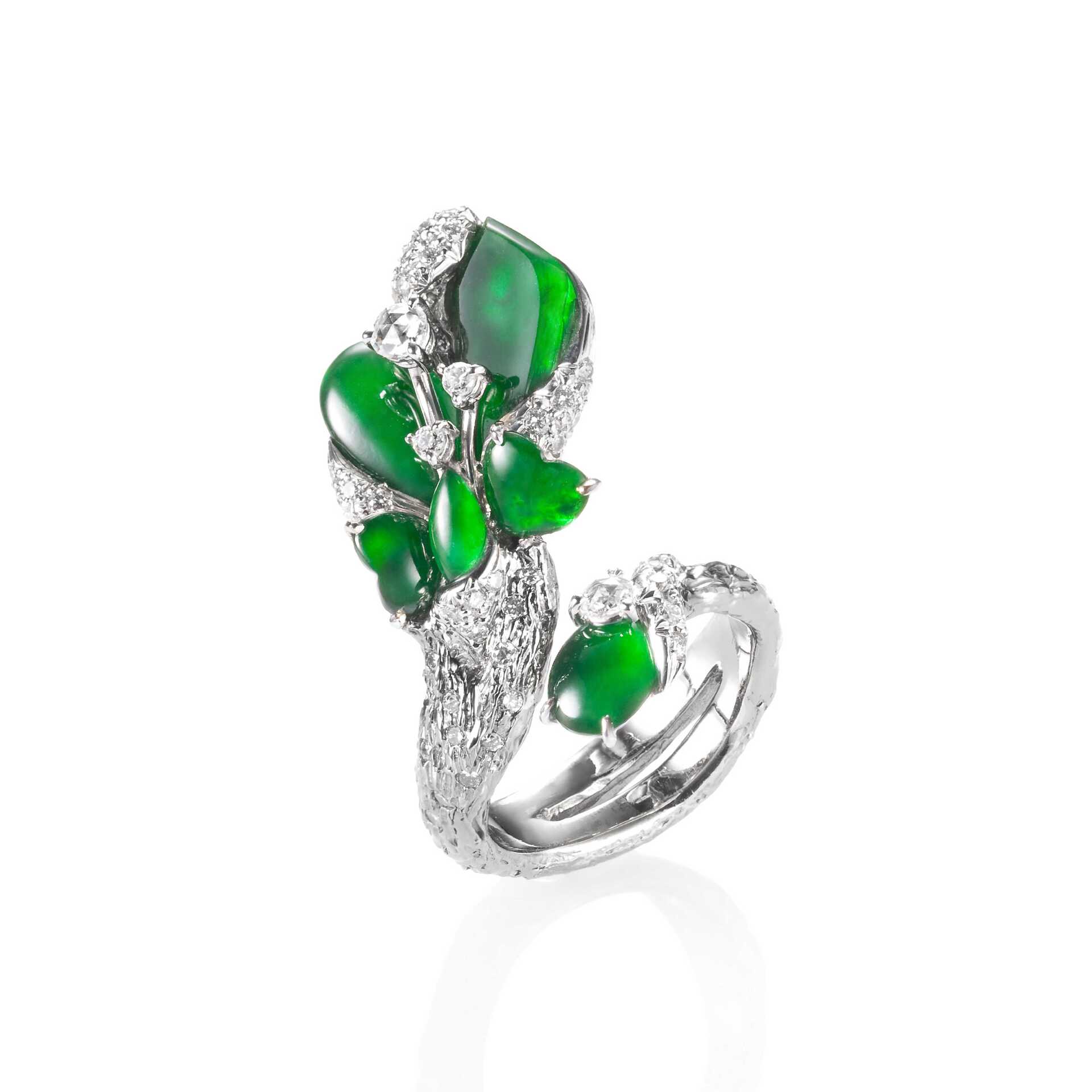 手中戒指通常是配戴者最常細細注視的珠寶,玉世家透過經典的愛心設計,為情人訴說道不盡的愛意。隱藏花叢間的翠綠芳心,在低調雅緻中透露出與眾不同的獨特品味;另以濃綠通透的蛋面翡翠,搭配K金鑲鑽線條勾勒出嬌俏可愛的心形,在指間流露甜蜜;又或直接以心形切割翡翠表現心意,向情人大方示愛。