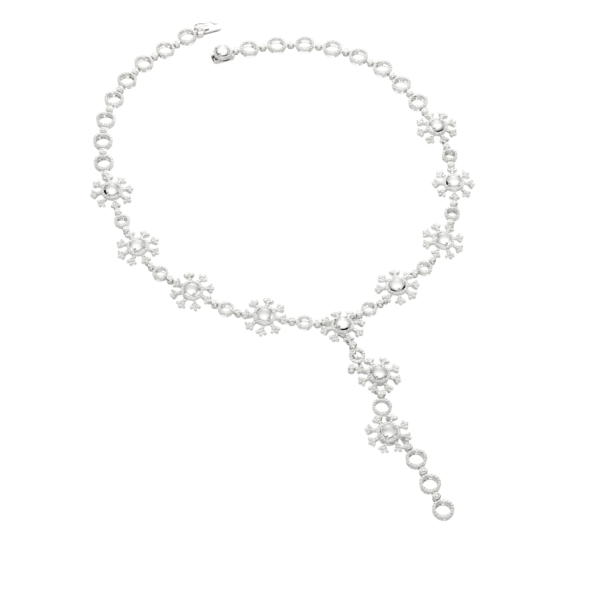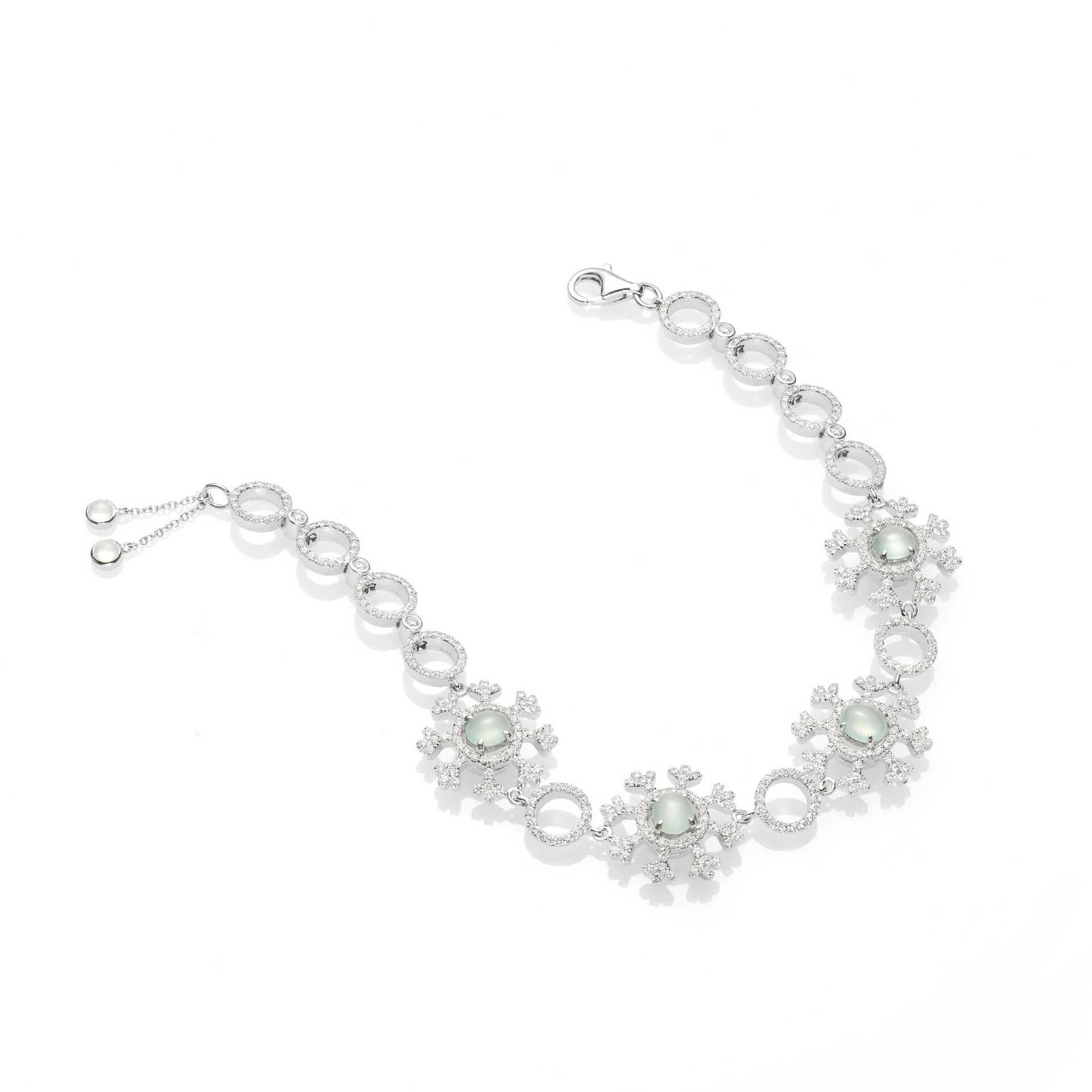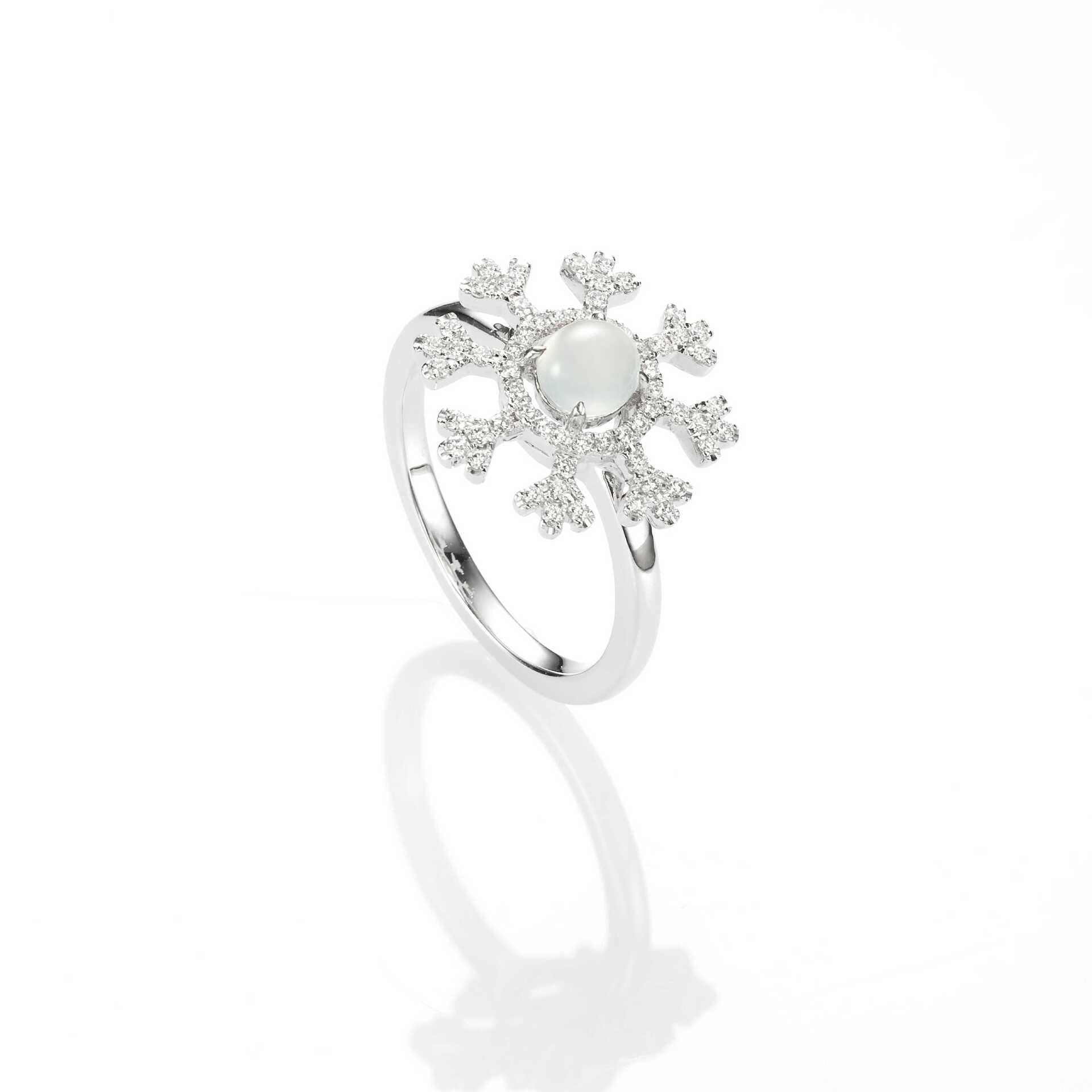 雪花飄飄的意象,是耶誕佳節的經典象徵,一枚枚雪花從天而降,是那麼純潔、美好而輕盈,總是為人們捎來平靜與希望的信息。以翡翠詮釋雪花,最是貼切,白色翡翠,質色溫潤清透,瑩瑩的光澤,靜謐的氣韻,玲瓏的蛋面,恰如其分演繹出雪的形象,更添節日的浪漫醉人。