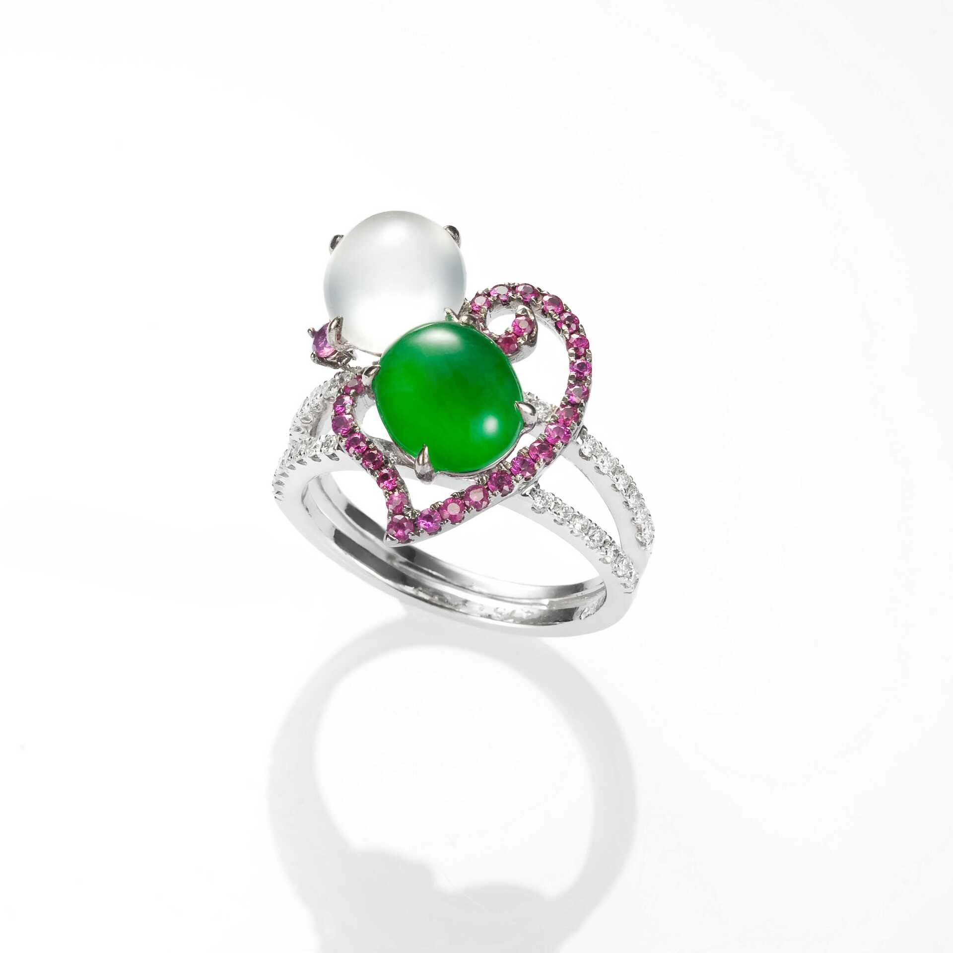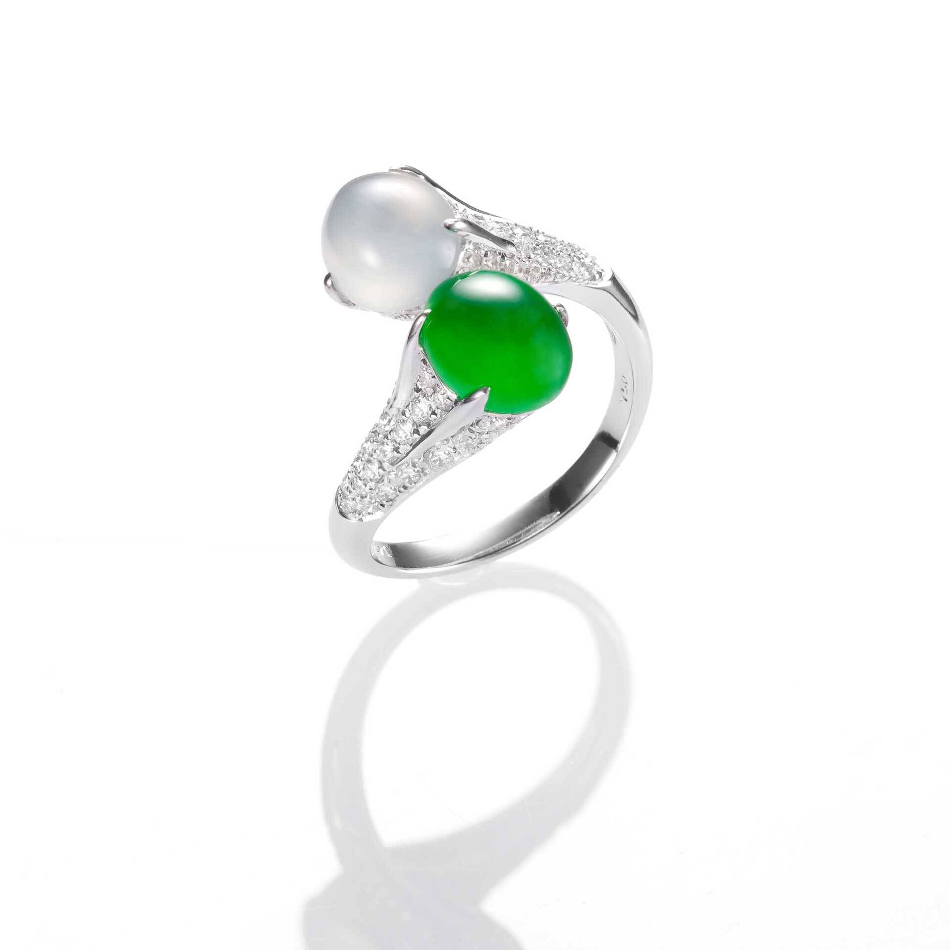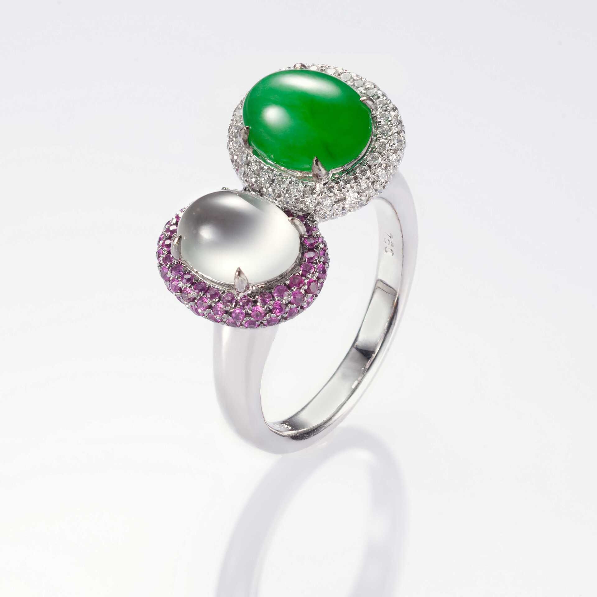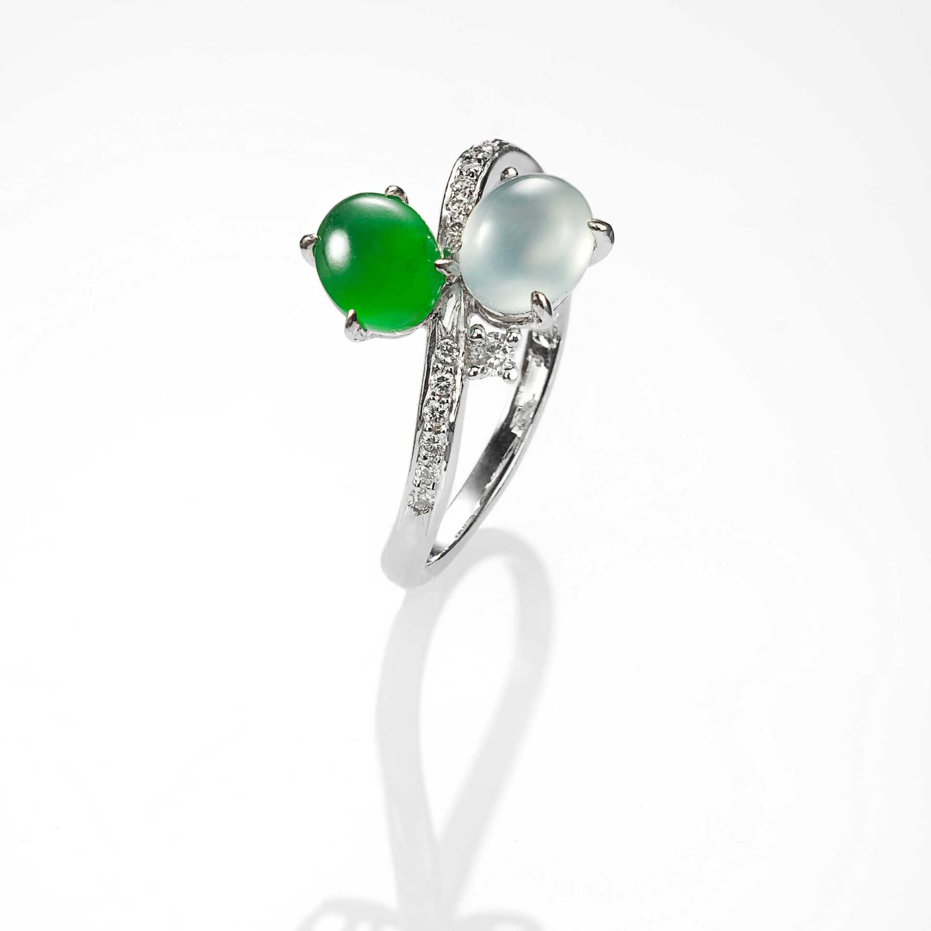 JADEGIA玉世家特別推出情人節翡翠戒指系列-【我們倆】。選擇盈碧的綠翠,以及純淨的白翡,兩兩琢磨為經典的蛋面造型,翡翠玉質,溫潤清透,隱隱含光,盡顯情與美的優雅品味。綠翠白翡,並肩相倚,戒身的設計,各有動靜之美,或清秀,或華貴,或璀璨,並輔以鑽石或有色珠寶來相輝映襯,詮釋了不同的愛情模樣。